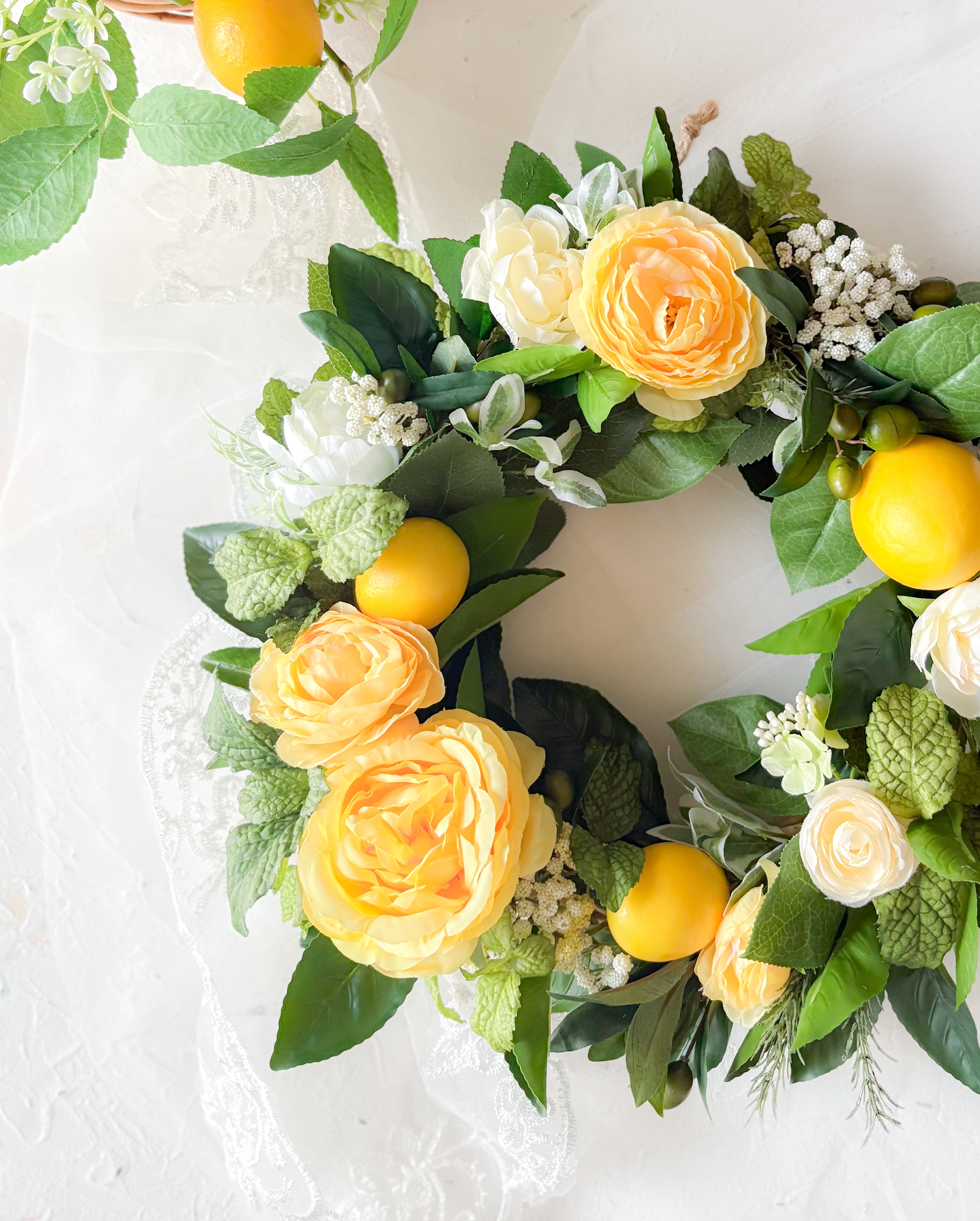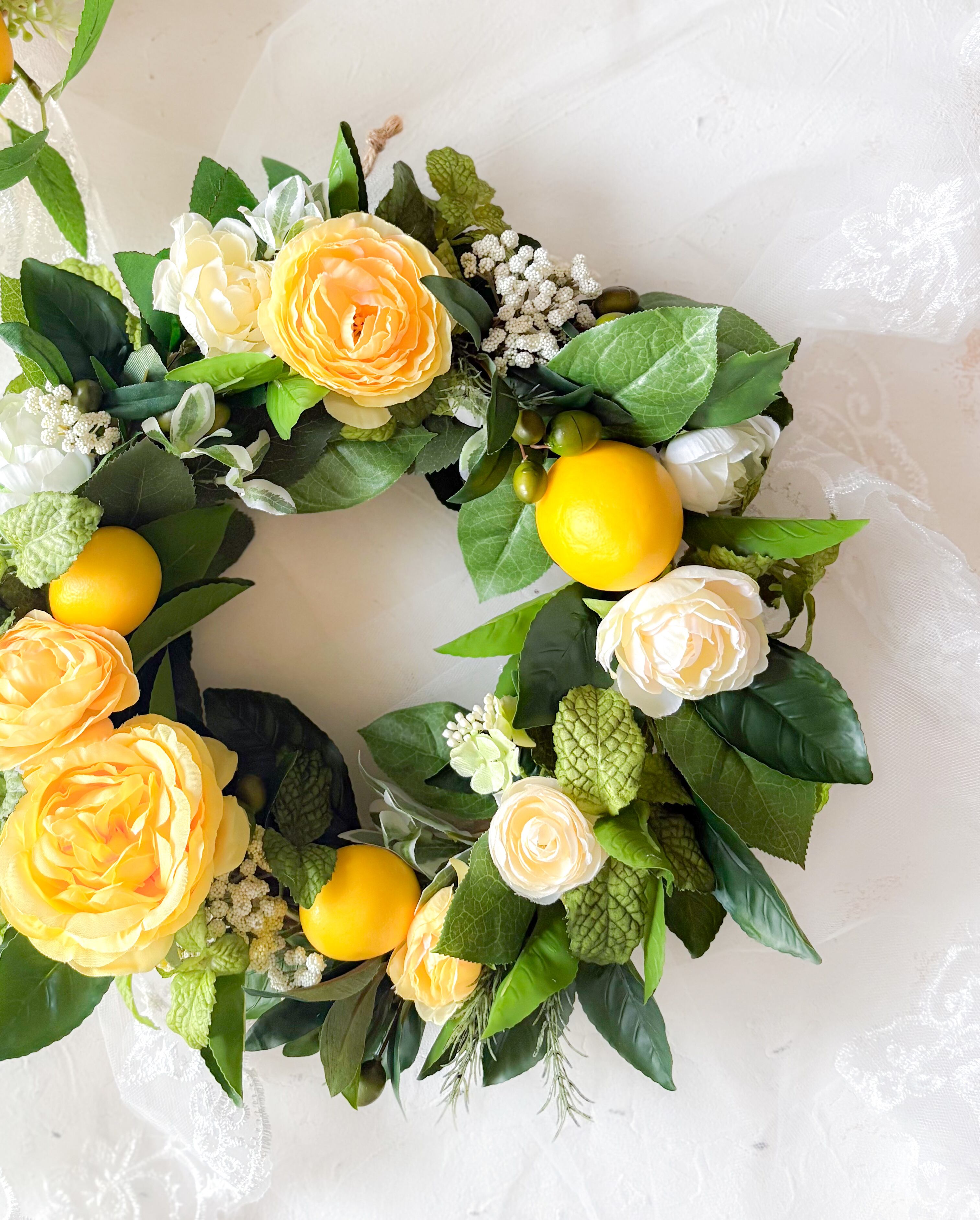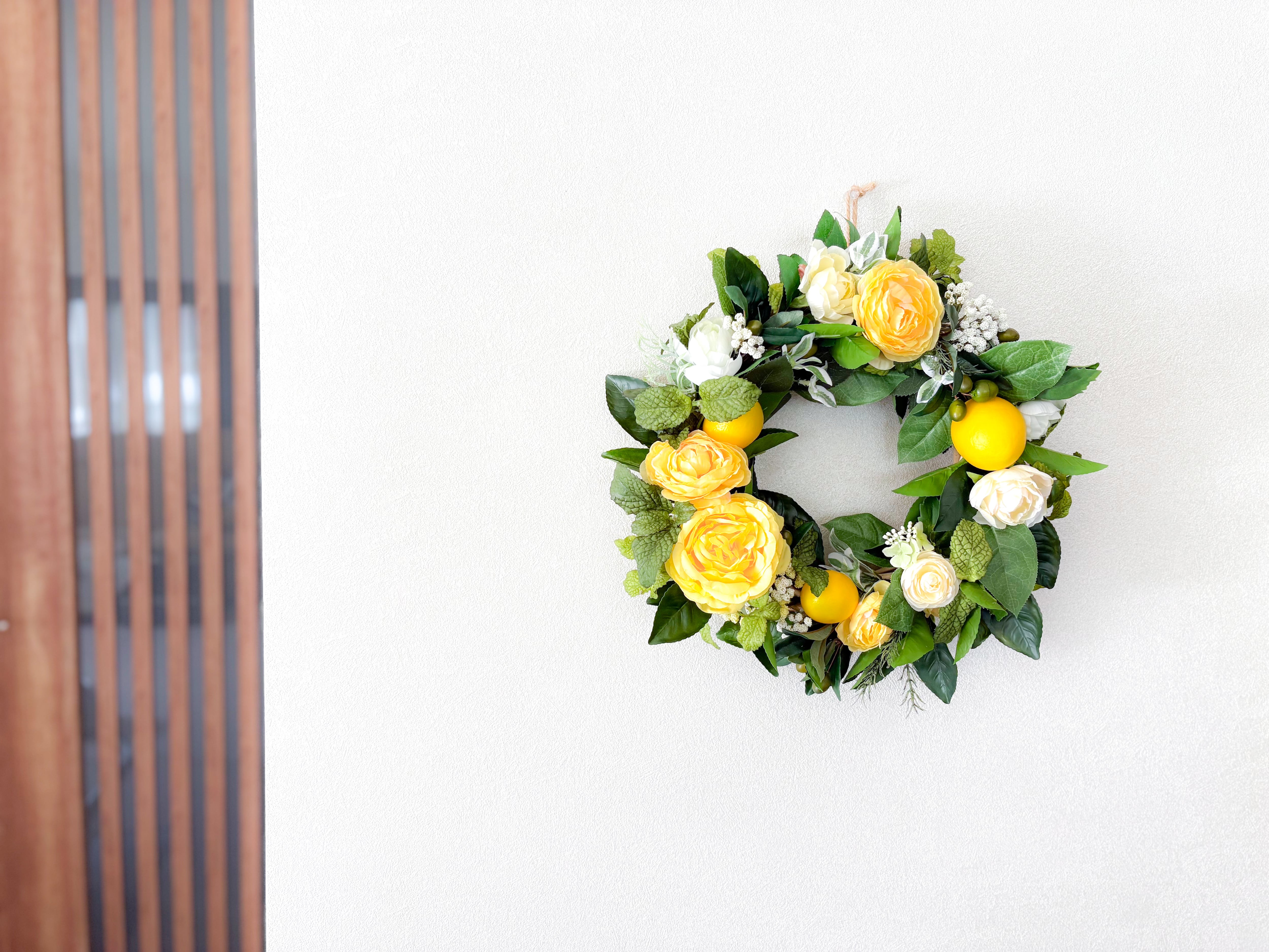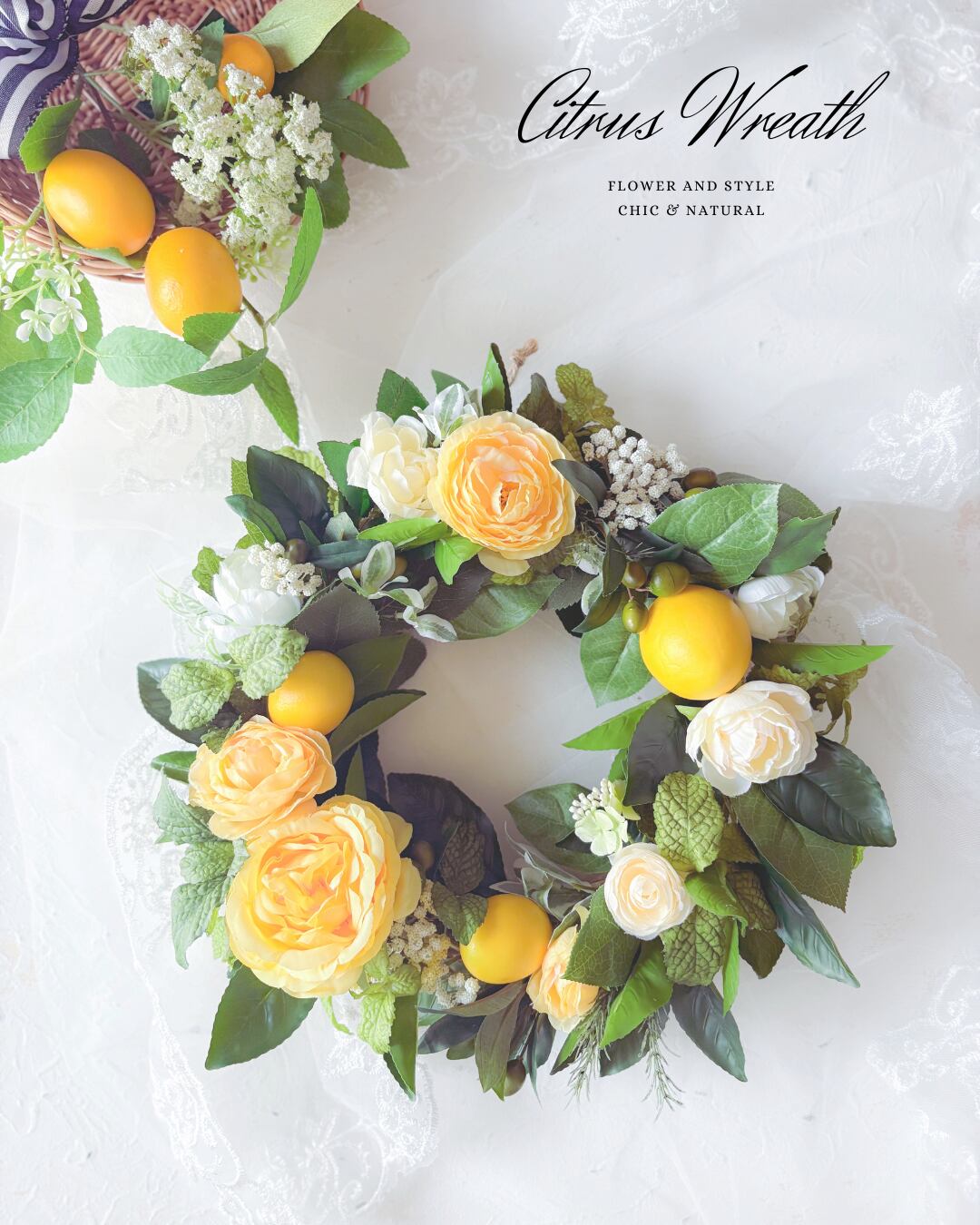 アーティフィシャルフラワー(クオリティの高い造花)のバラやラナンキュラス、レモンを主役に、ナチュラルで爽やかなの初夏のリースをデザインしました