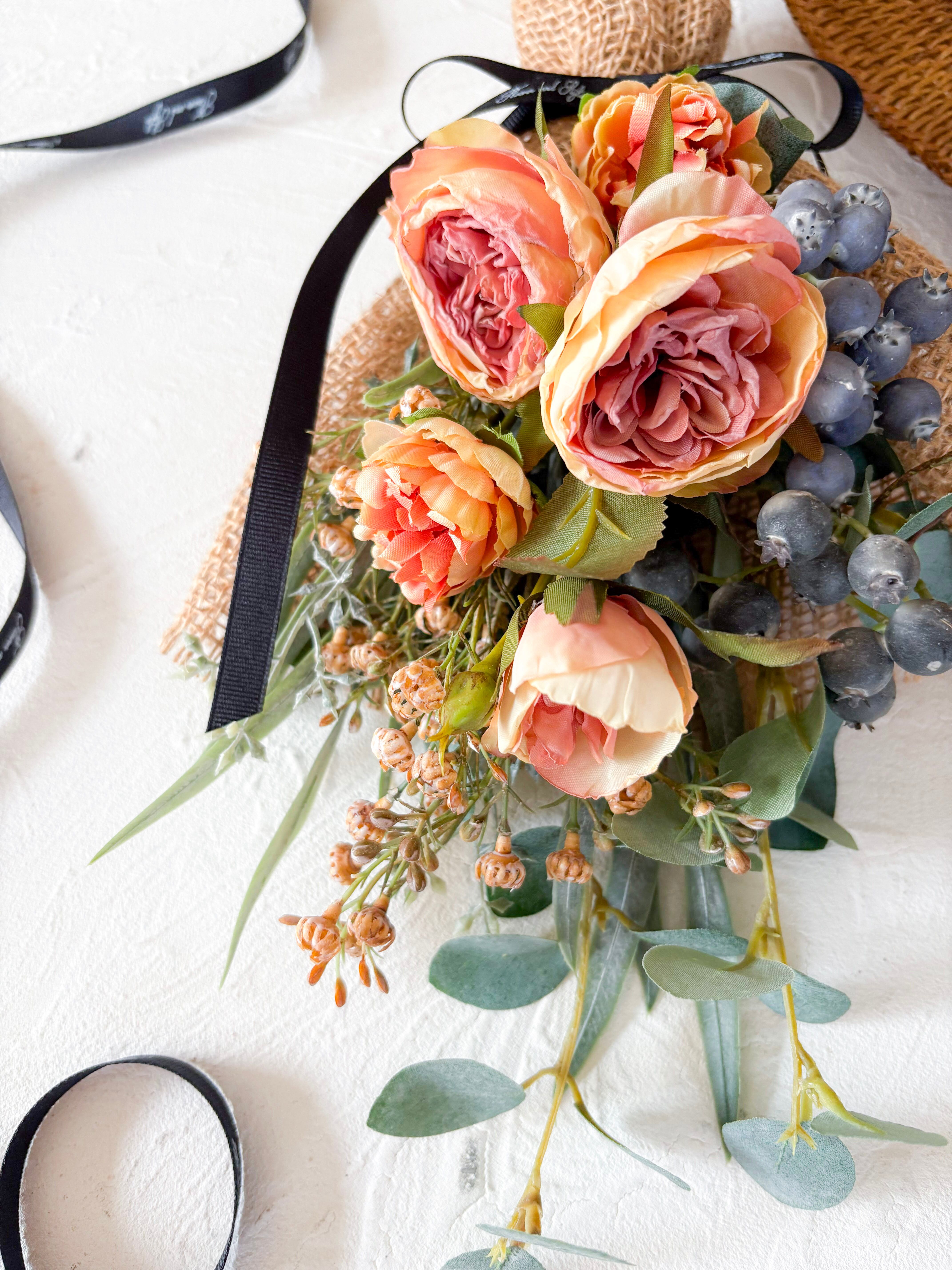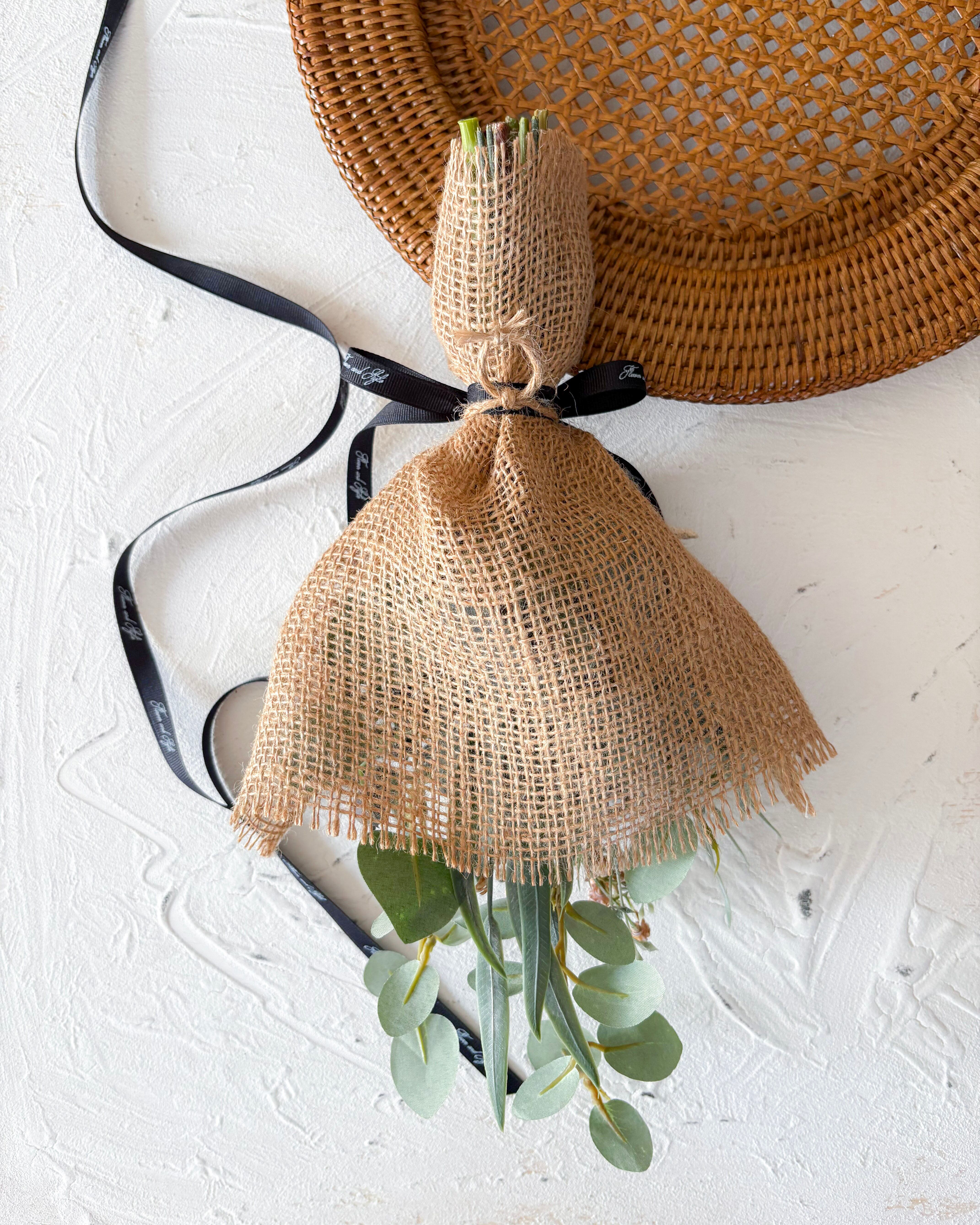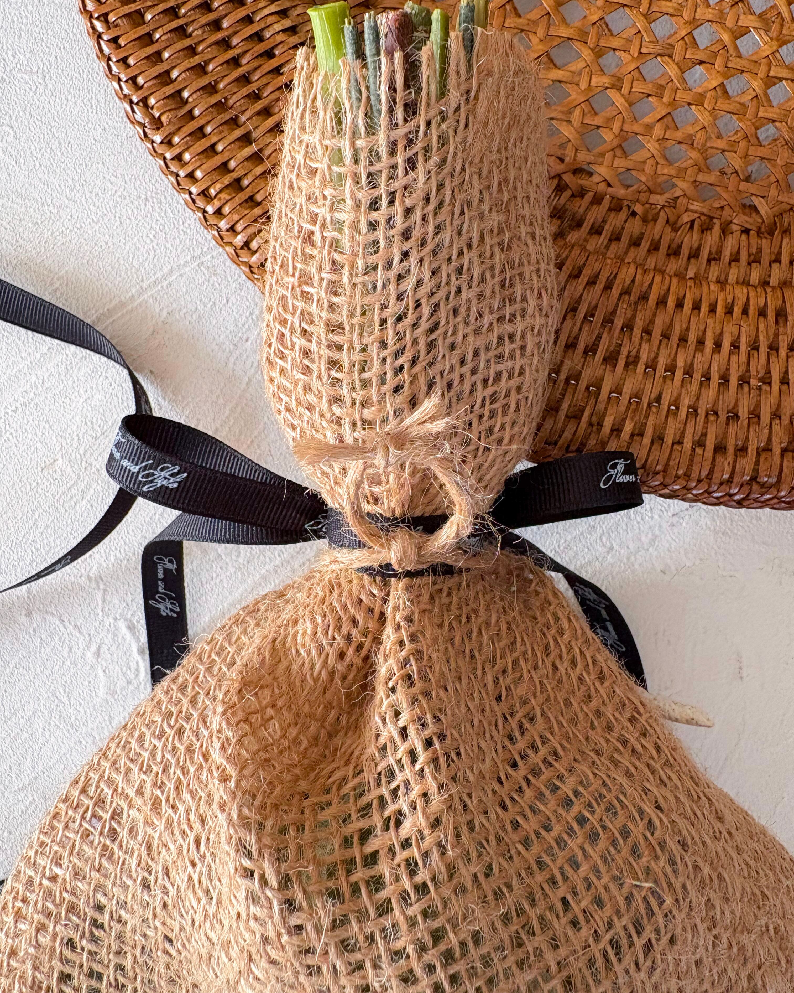 リボンは当店オリジナルのロゴ入り、ブラックのグログランを使用しています。また、更にナチュラル感を感じられるよう、ジュートクロスも併せております。