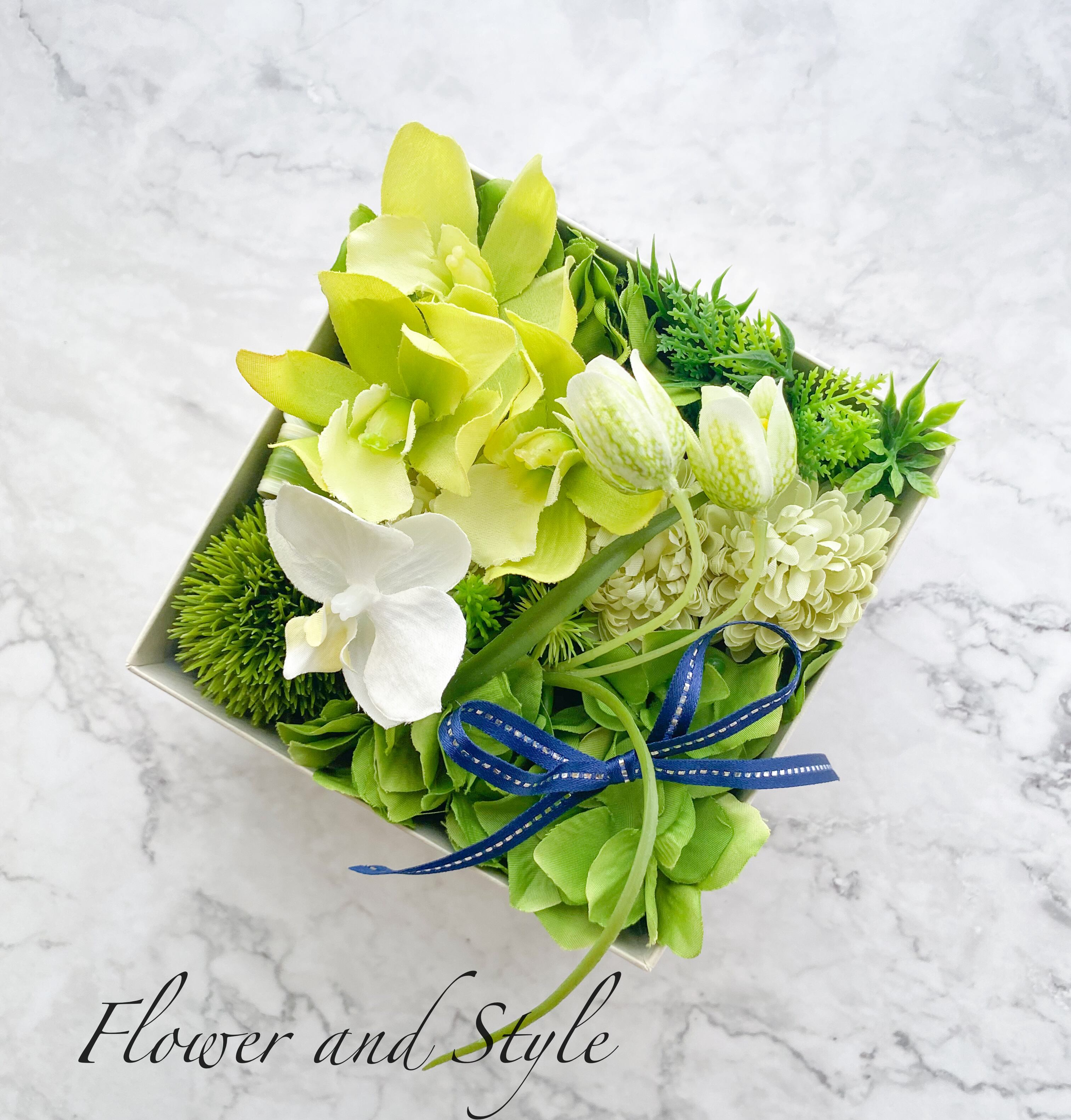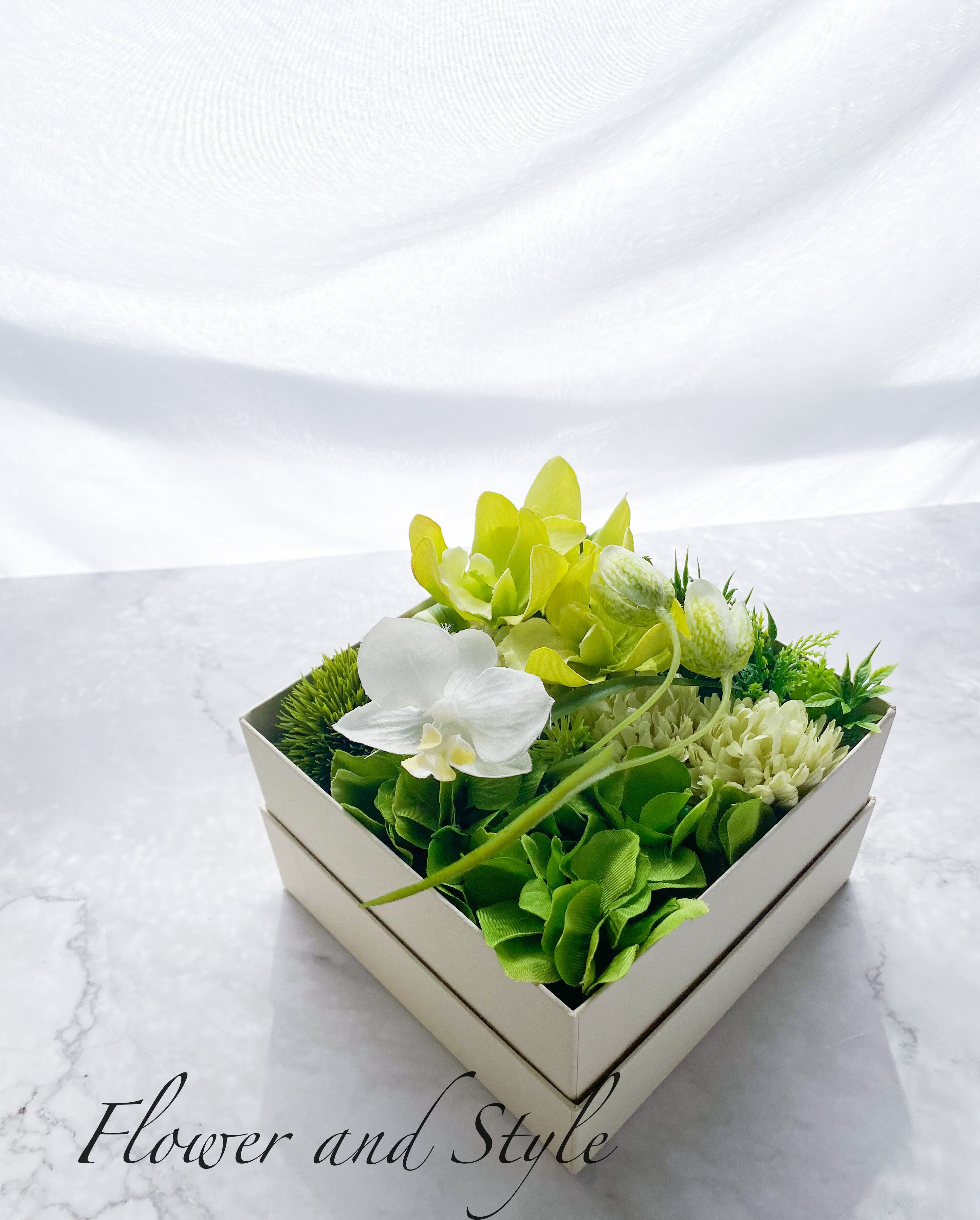アーティフィシャルフラワーのグリーン系の花や葉を集め、白無地のシンプルモダンな紙製ボックスにキュッと詰めました。