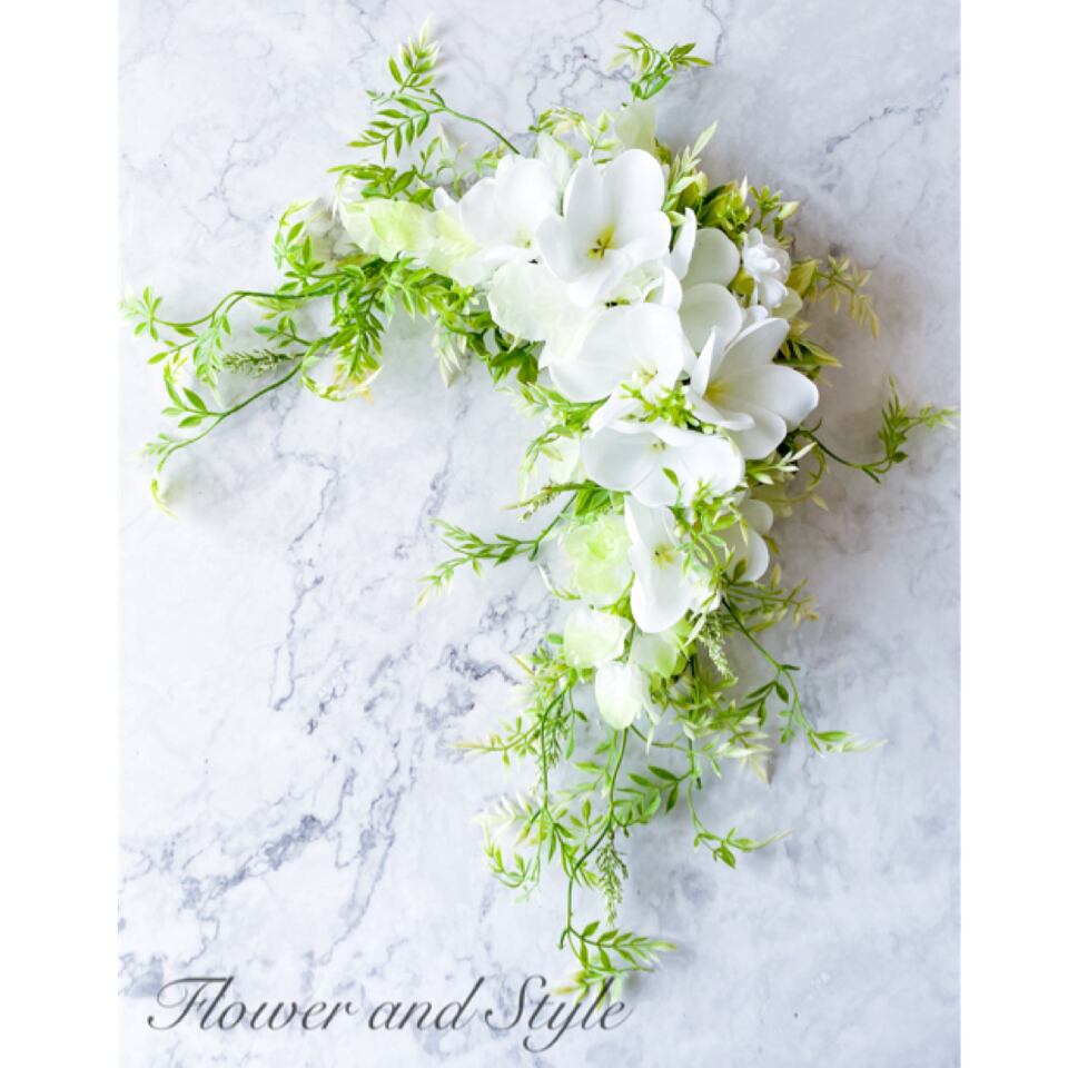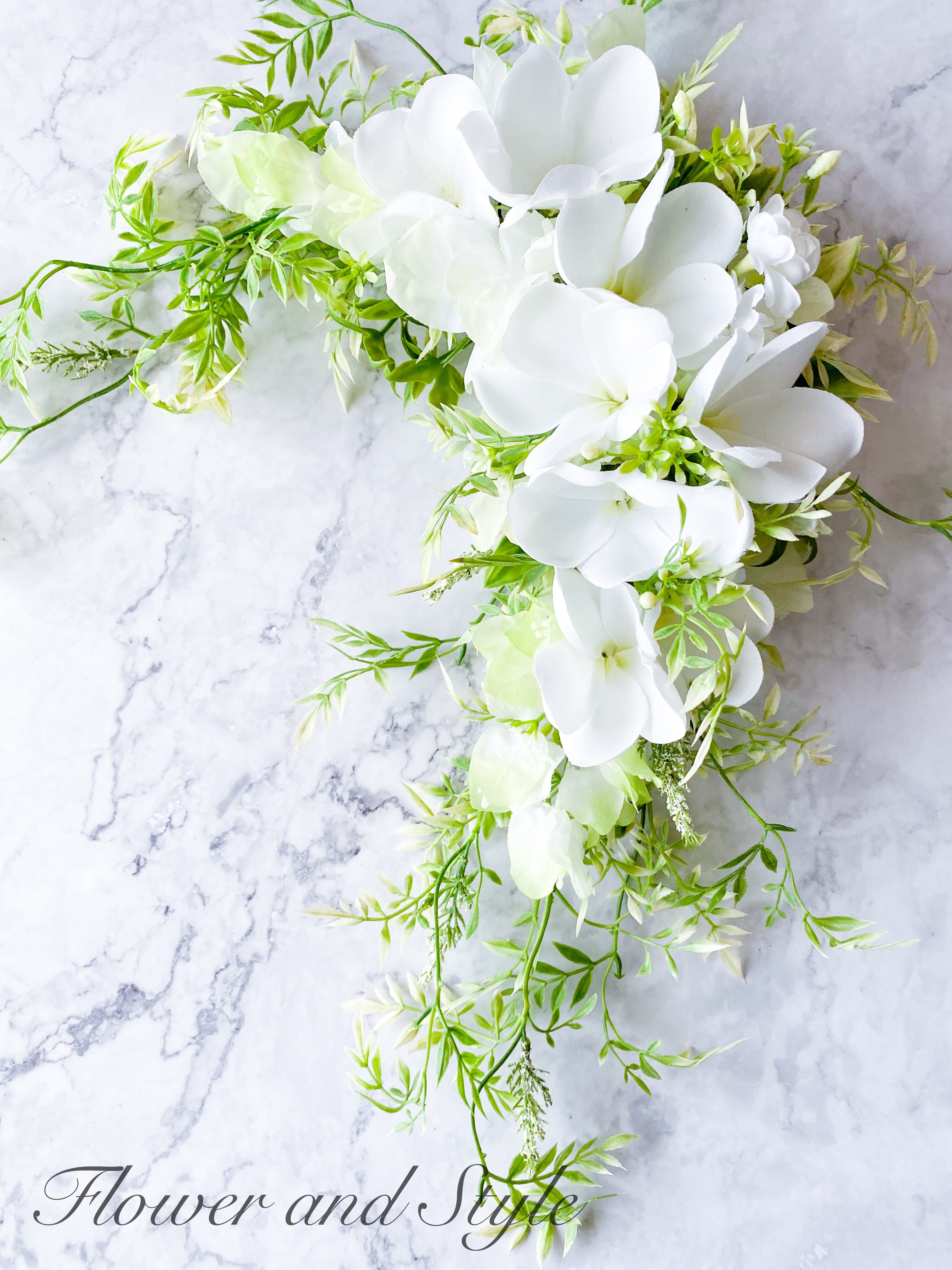 真っ白なプルメリアをメインに、ブーゲンビリア、ジャスミンなどを合わせ、南国の風が通り抜けるような、爽やかで優しさいっぱいのデザインを作りました。