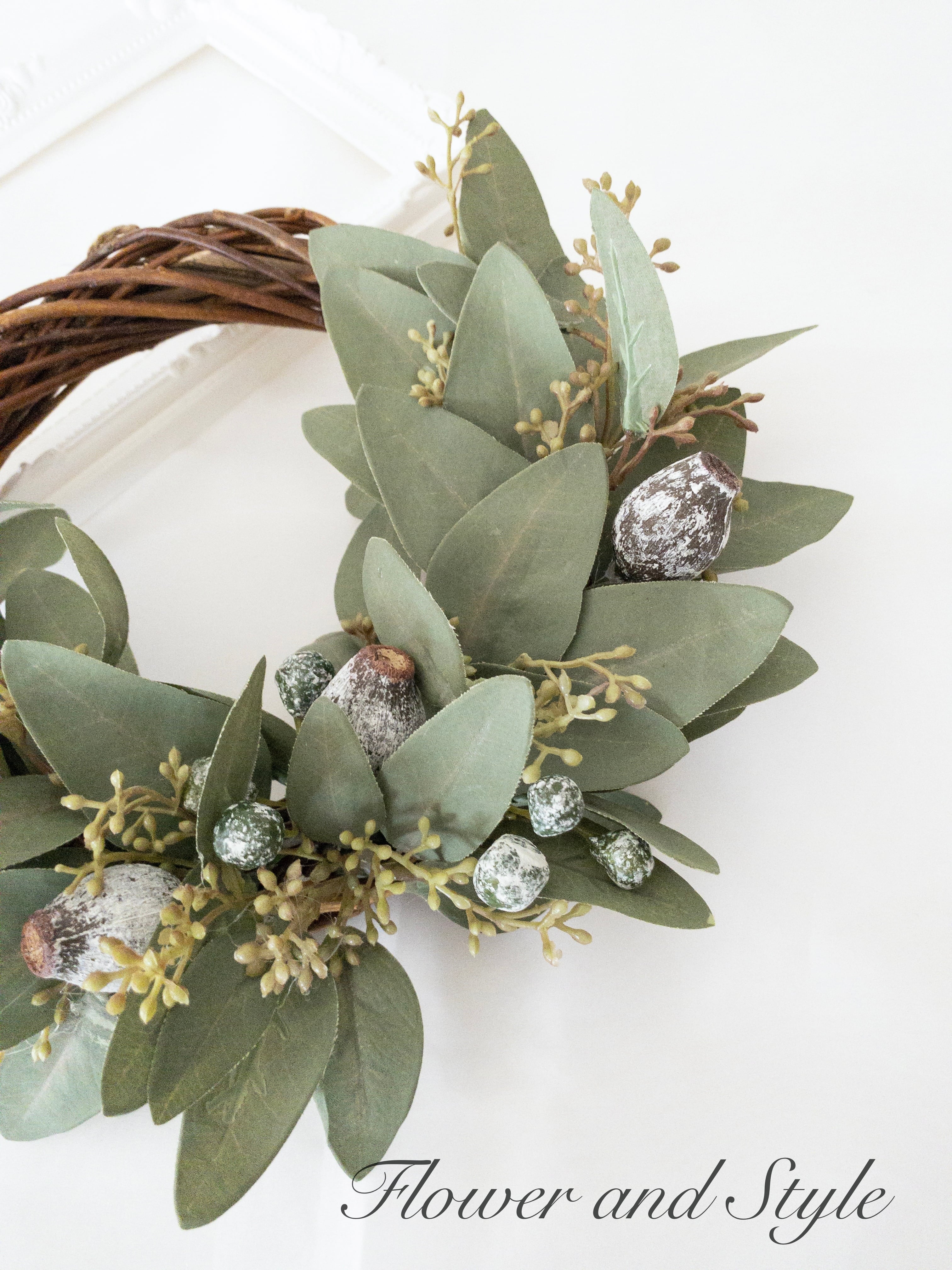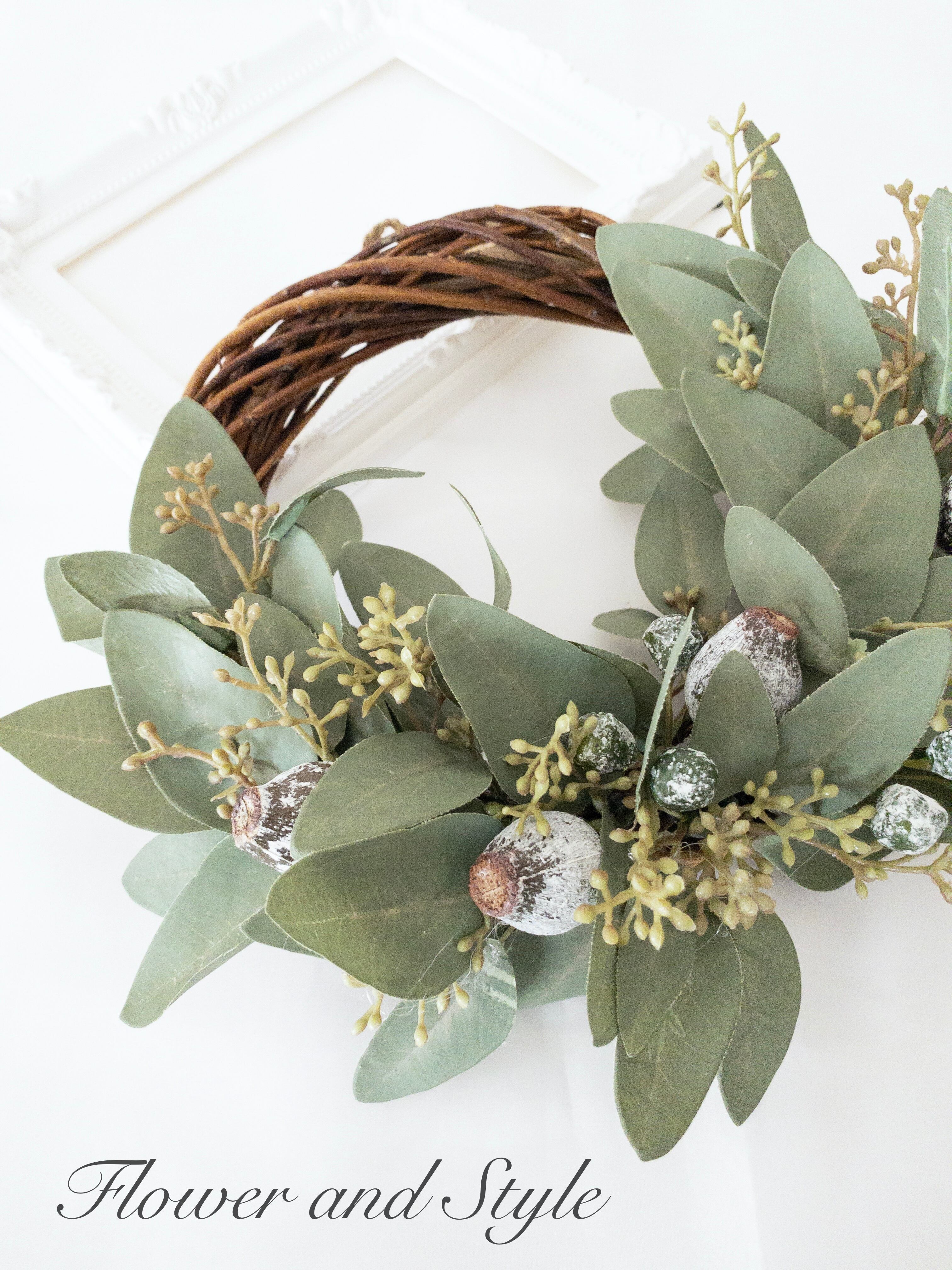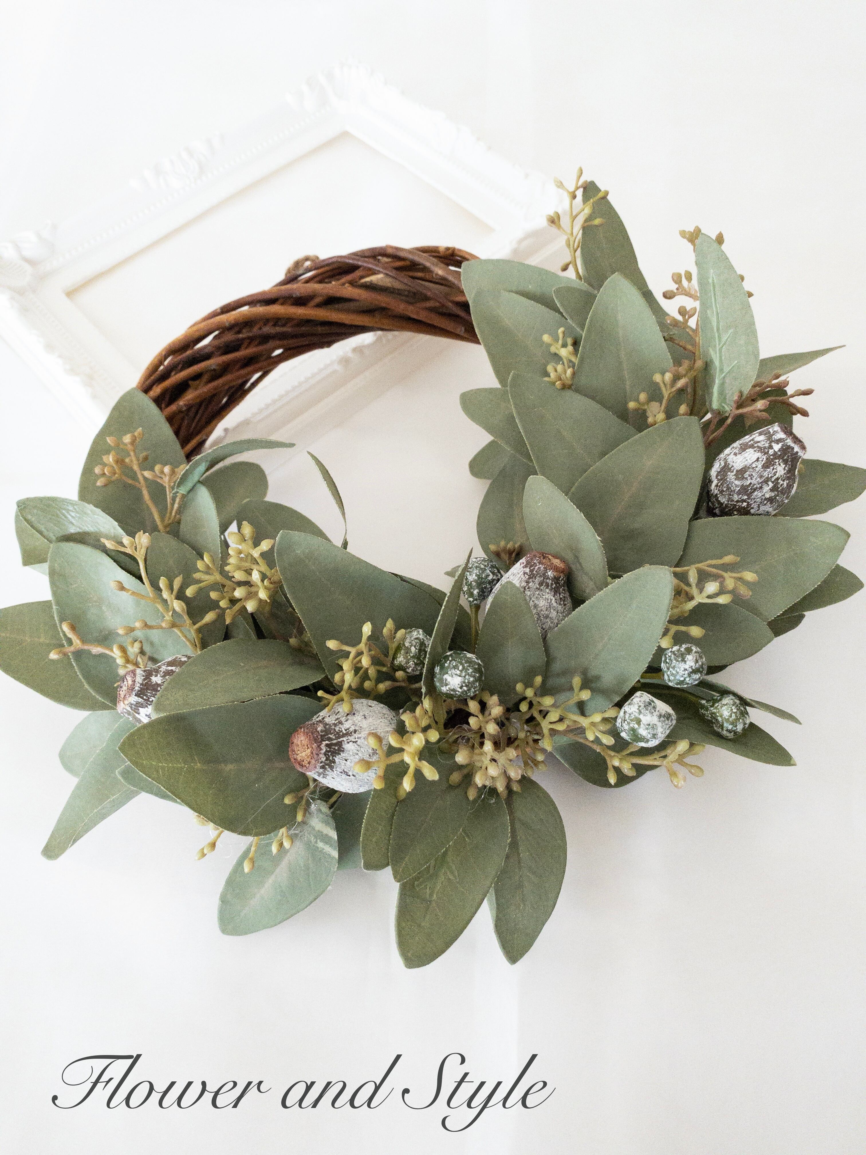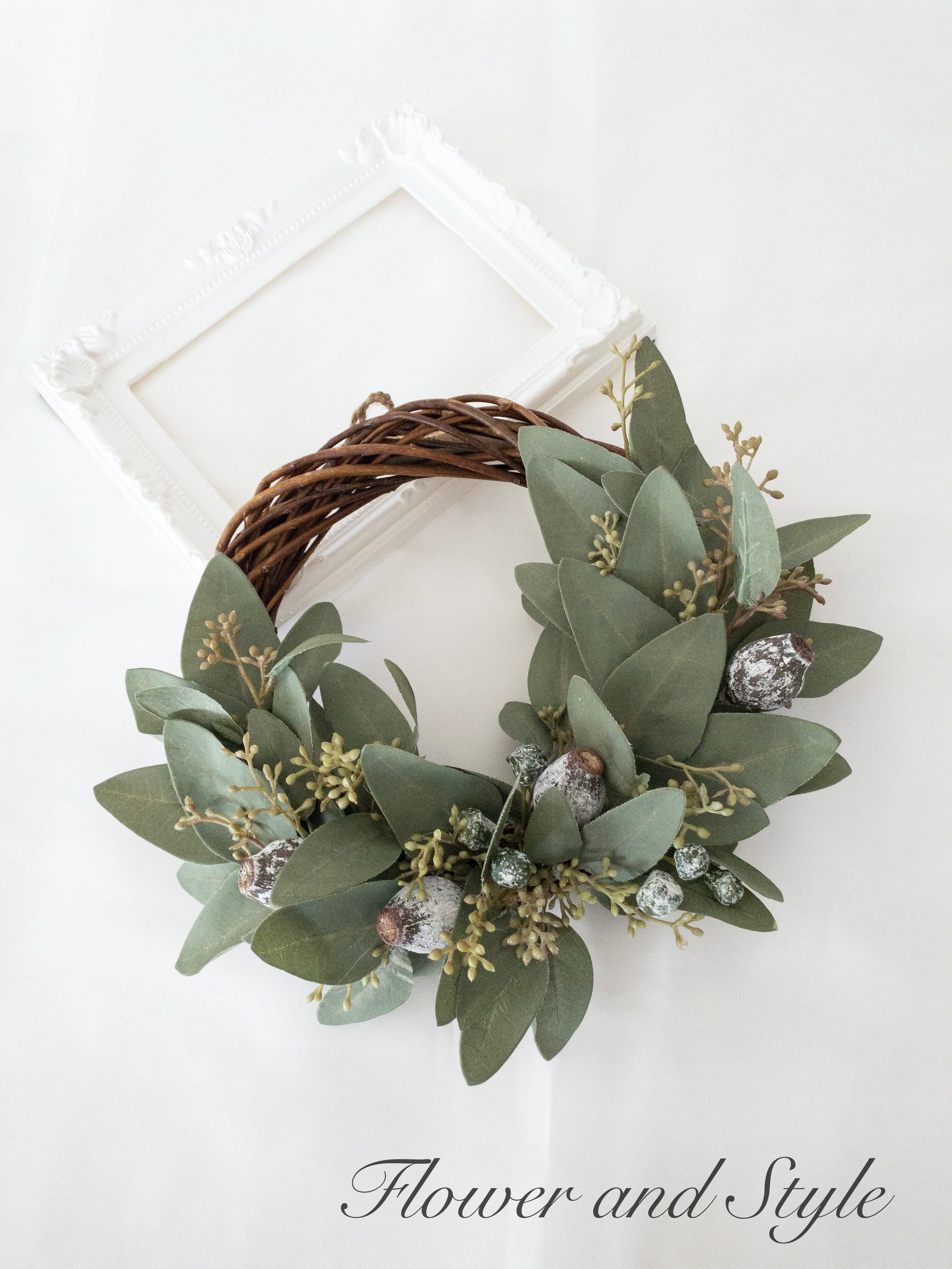 【花材】リース台(直径20センチ)、ユーカリリーフ、ユーカリベルギーナッツ