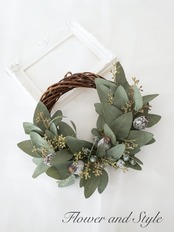 アーティフィシャルフラワーのユーカリと実物を合わせた、シンプルでナチュラルな雰囲気たっぷりのハーフリースです。