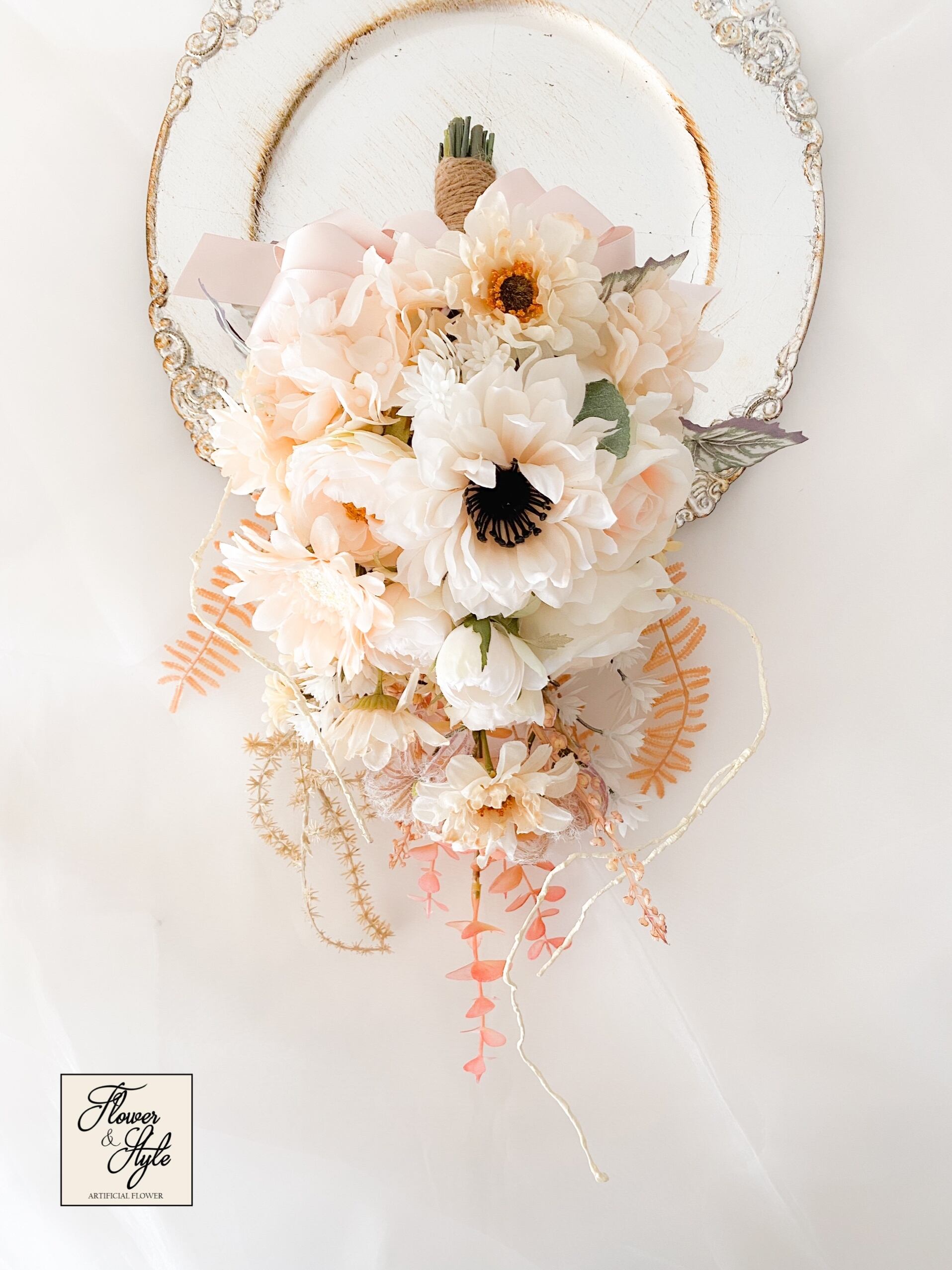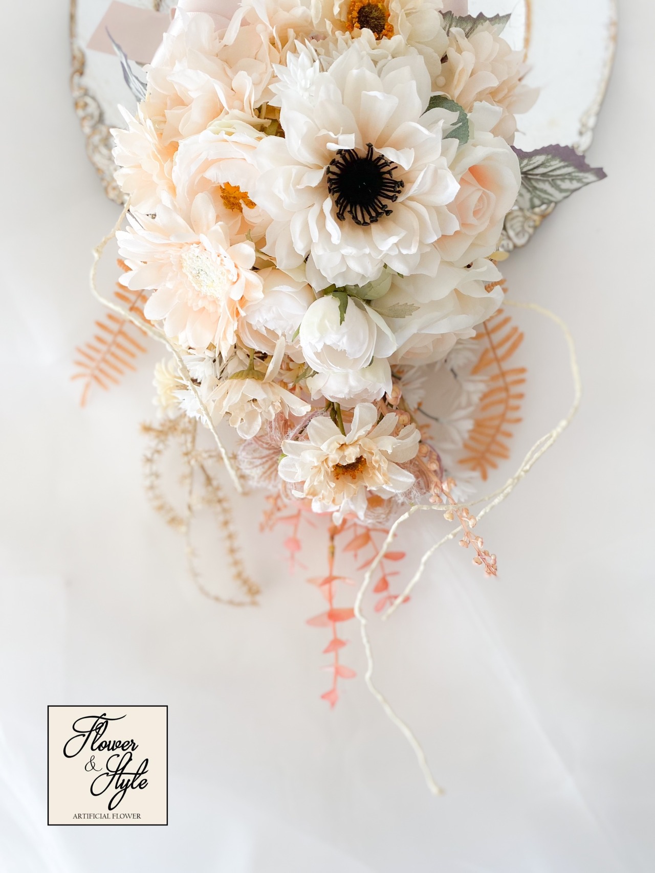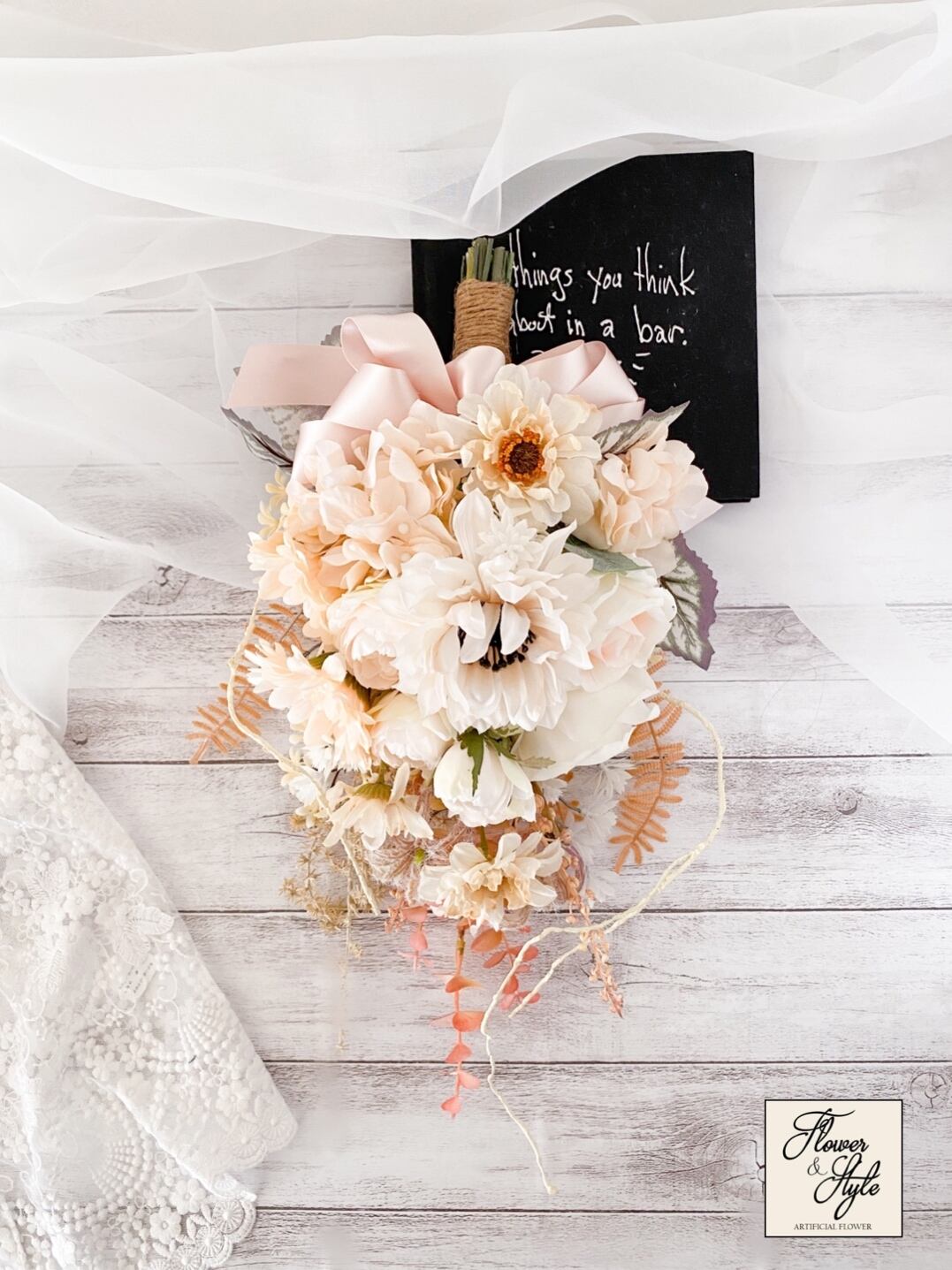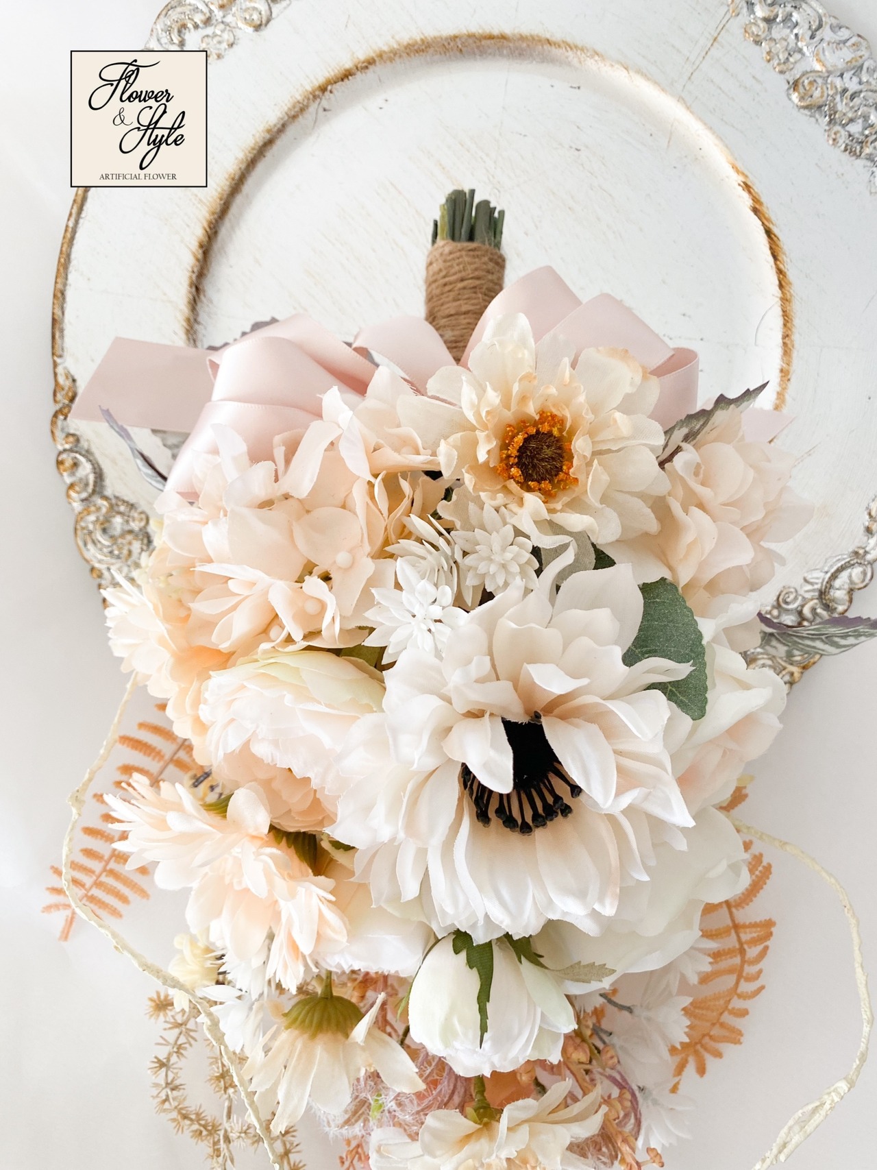バニラアイスのような甘く柔らかな色のアーティフィシャルフラワー(高品質な造花)をたっぷりと使い、スワッグを作りました。