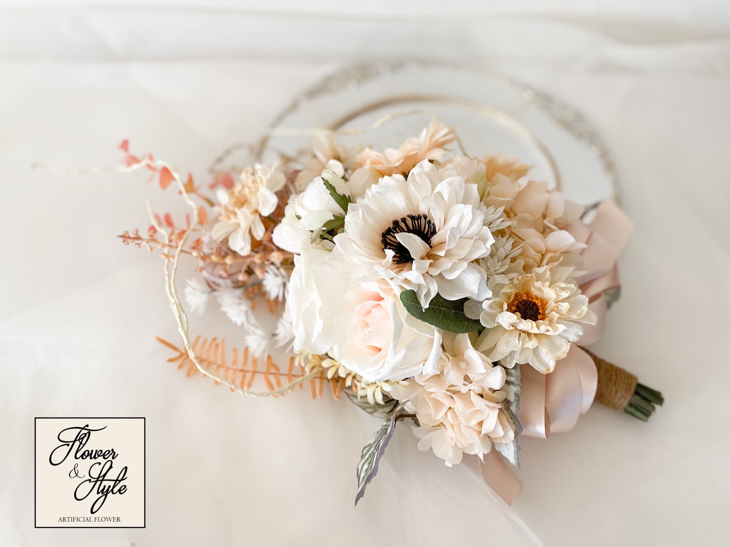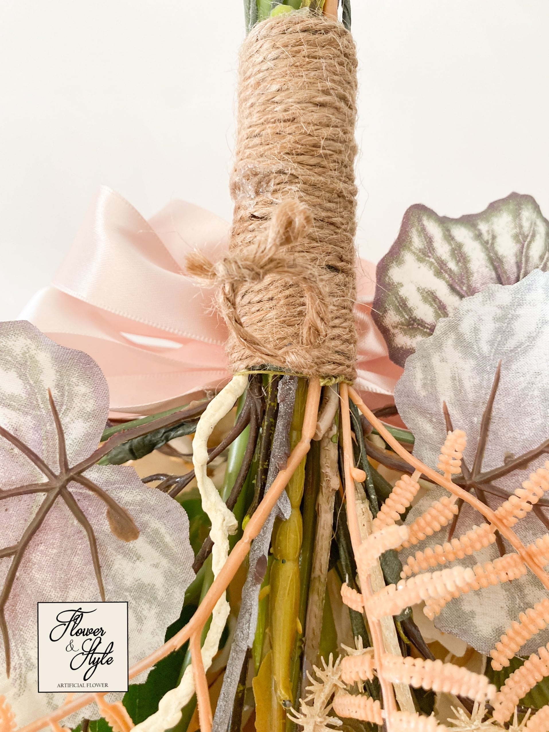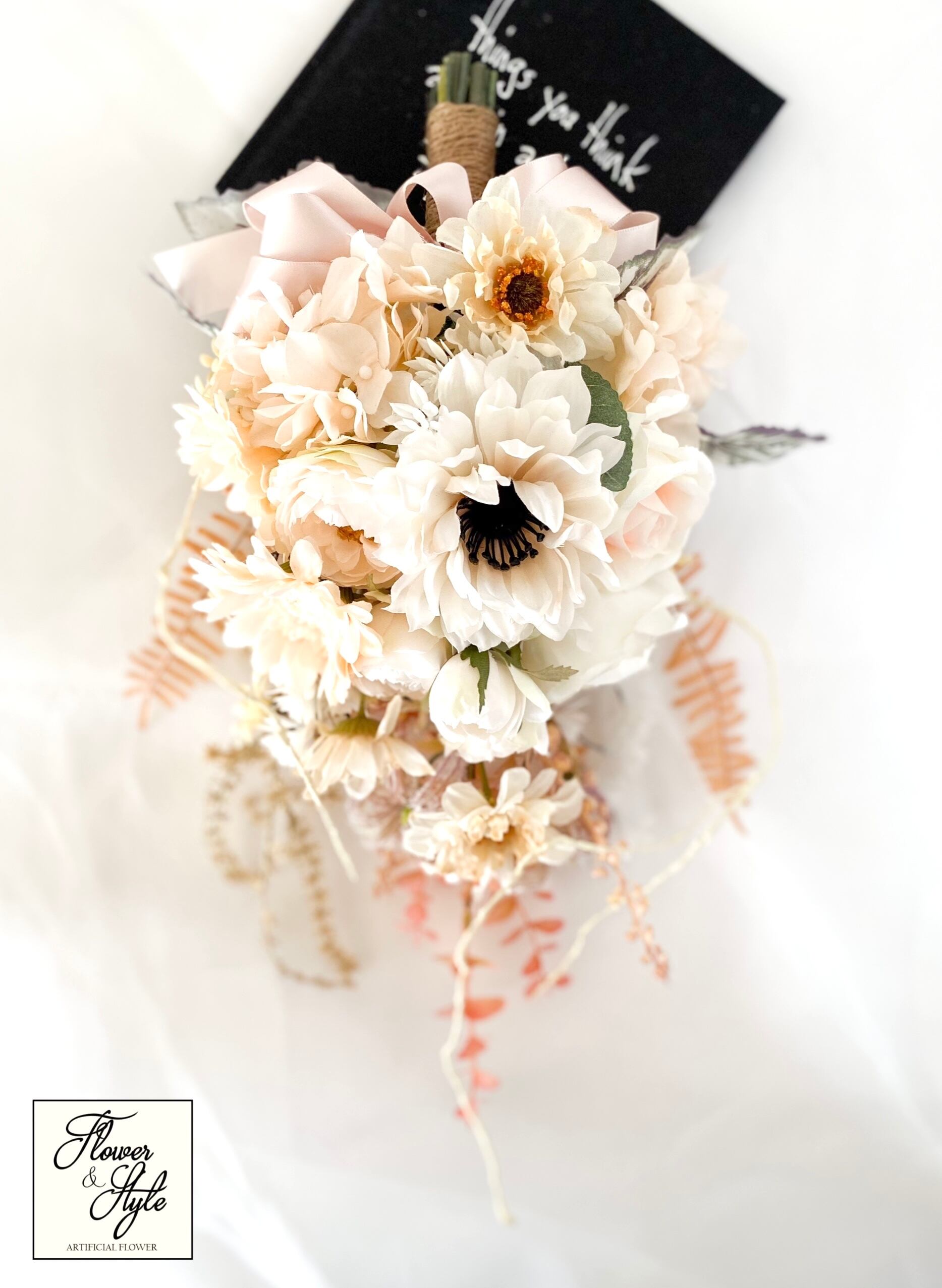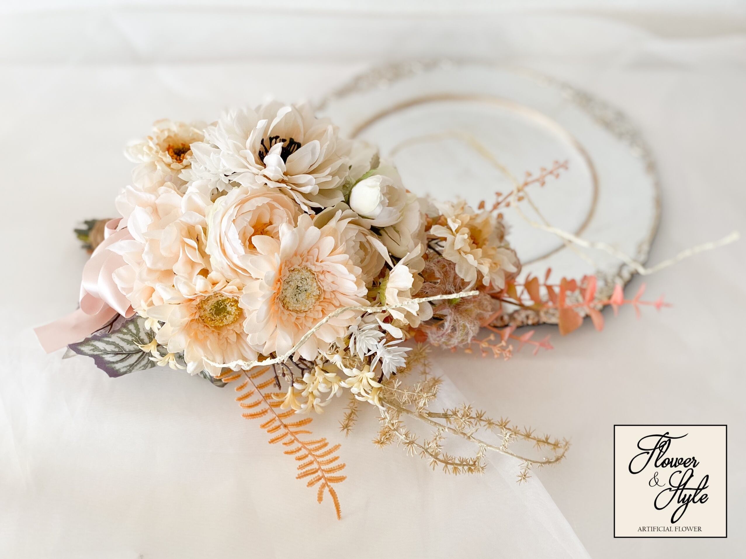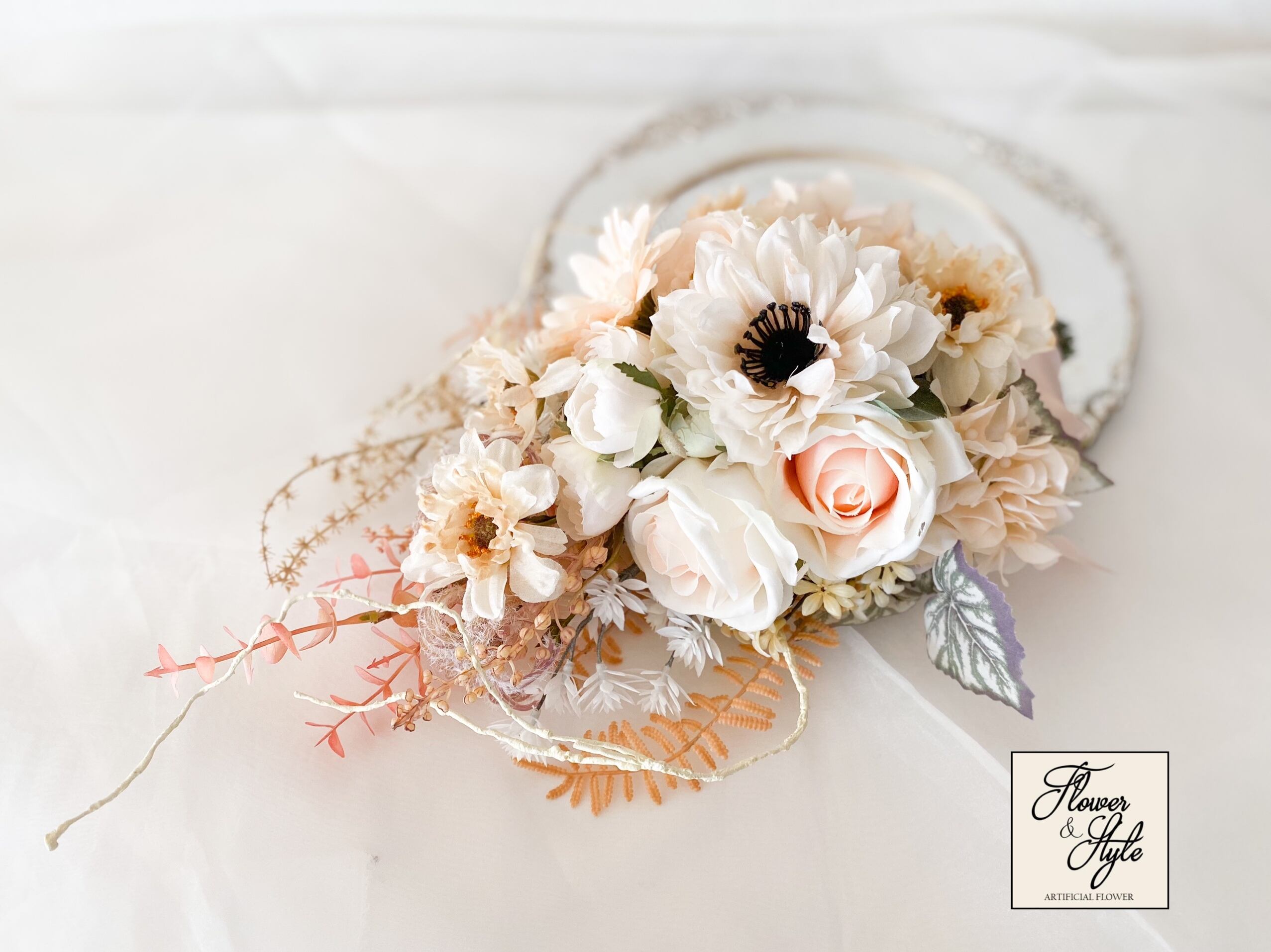 バニラアイスのような甘く柔らかな色のアーティフィシャルフラワー(高品質な造花)をたっぷりと使い、スワッグを作りました。