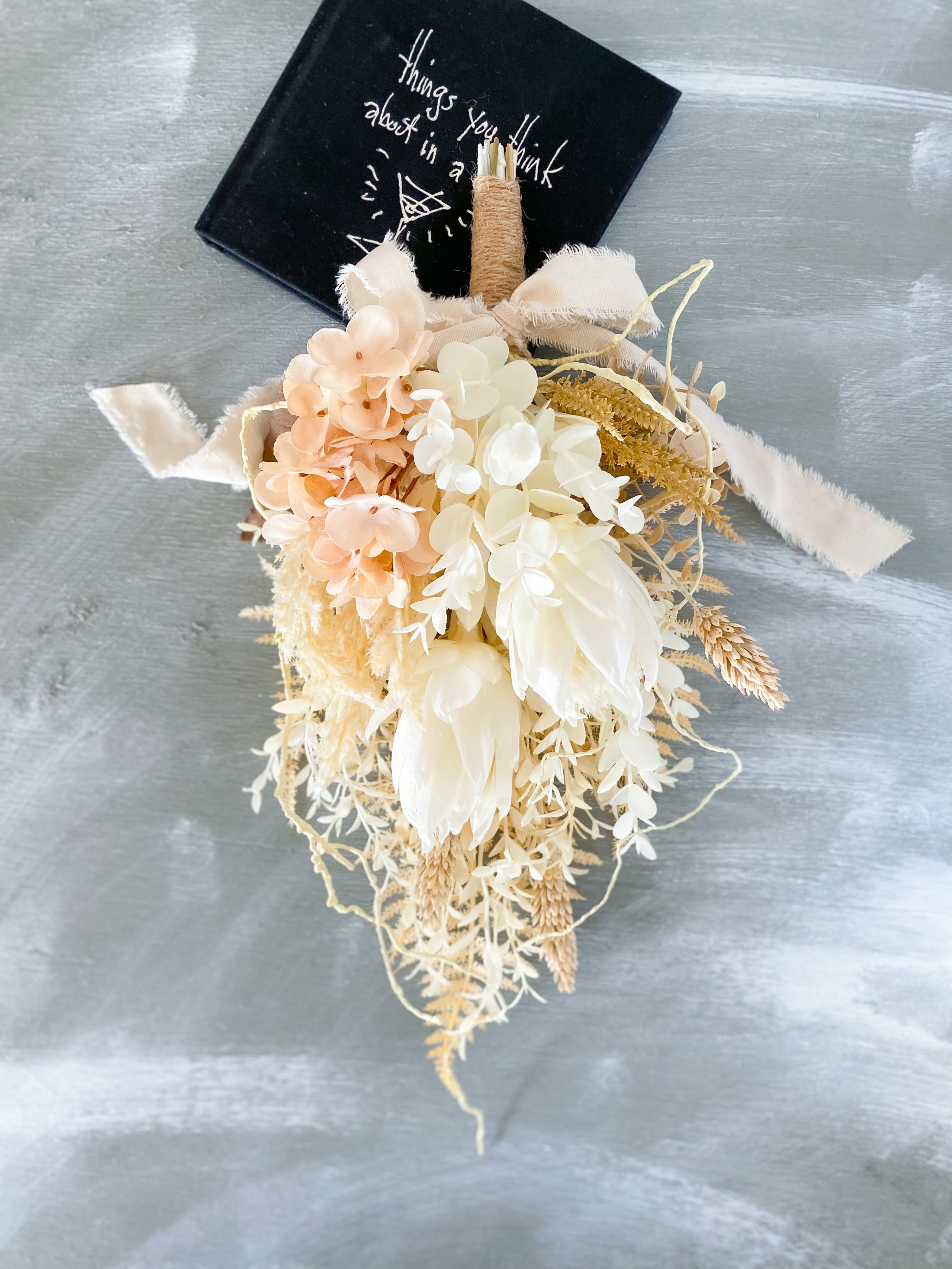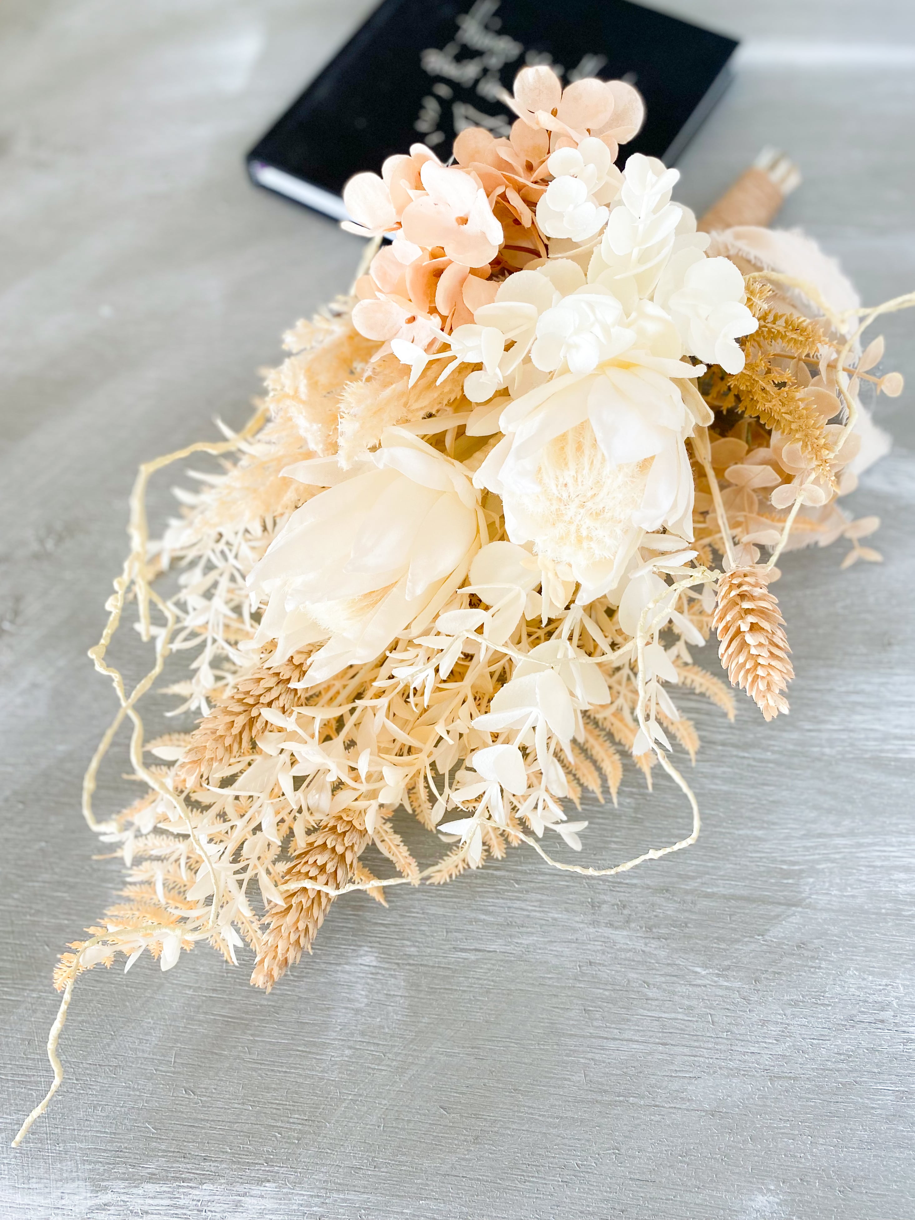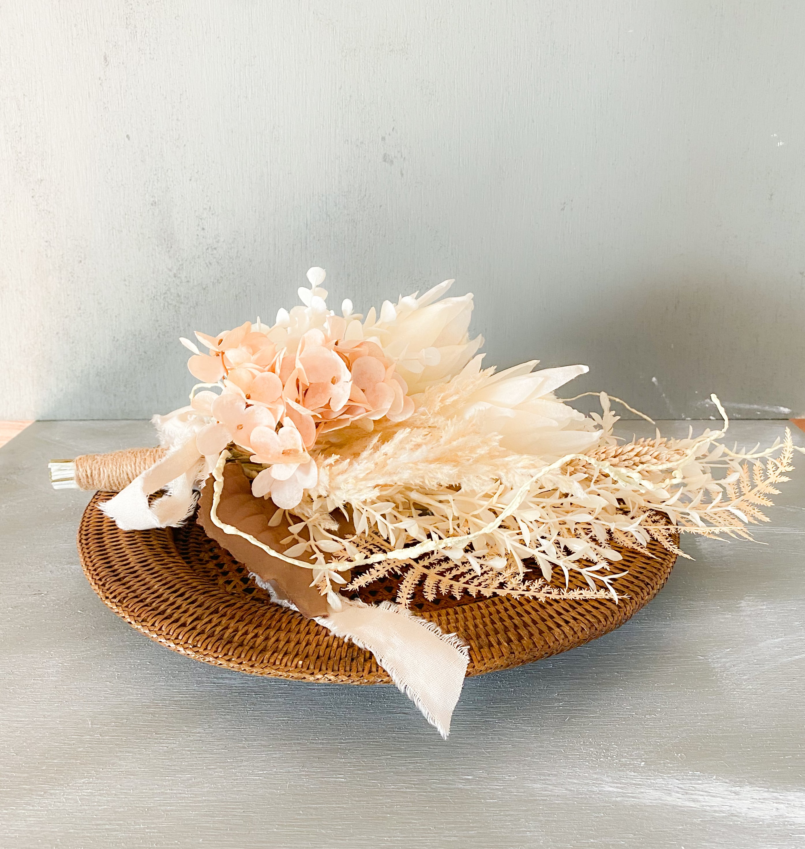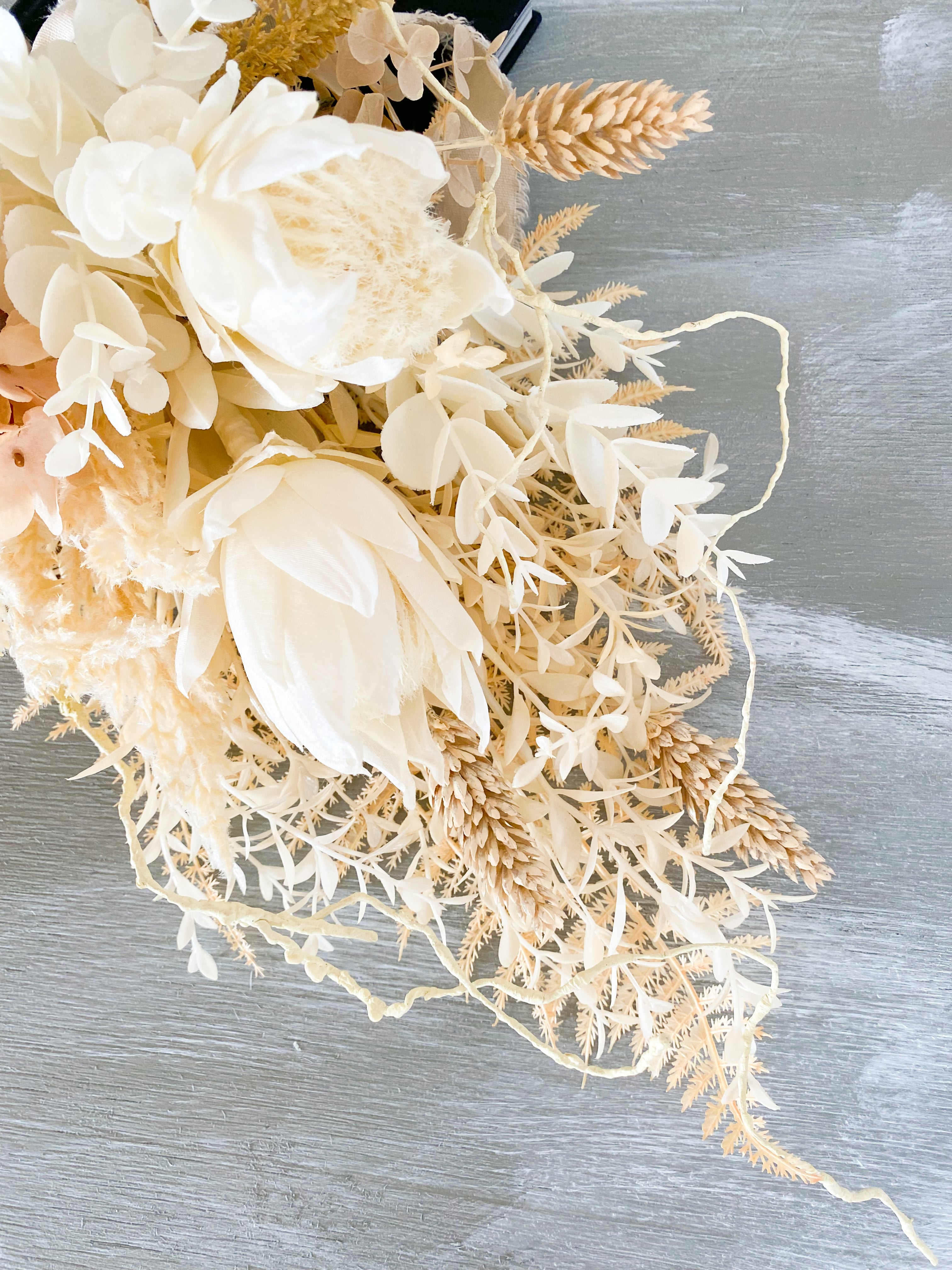 プロテアやパンパス、ウィート(ムギの穂)など個性的な花や葉を組み合わせ