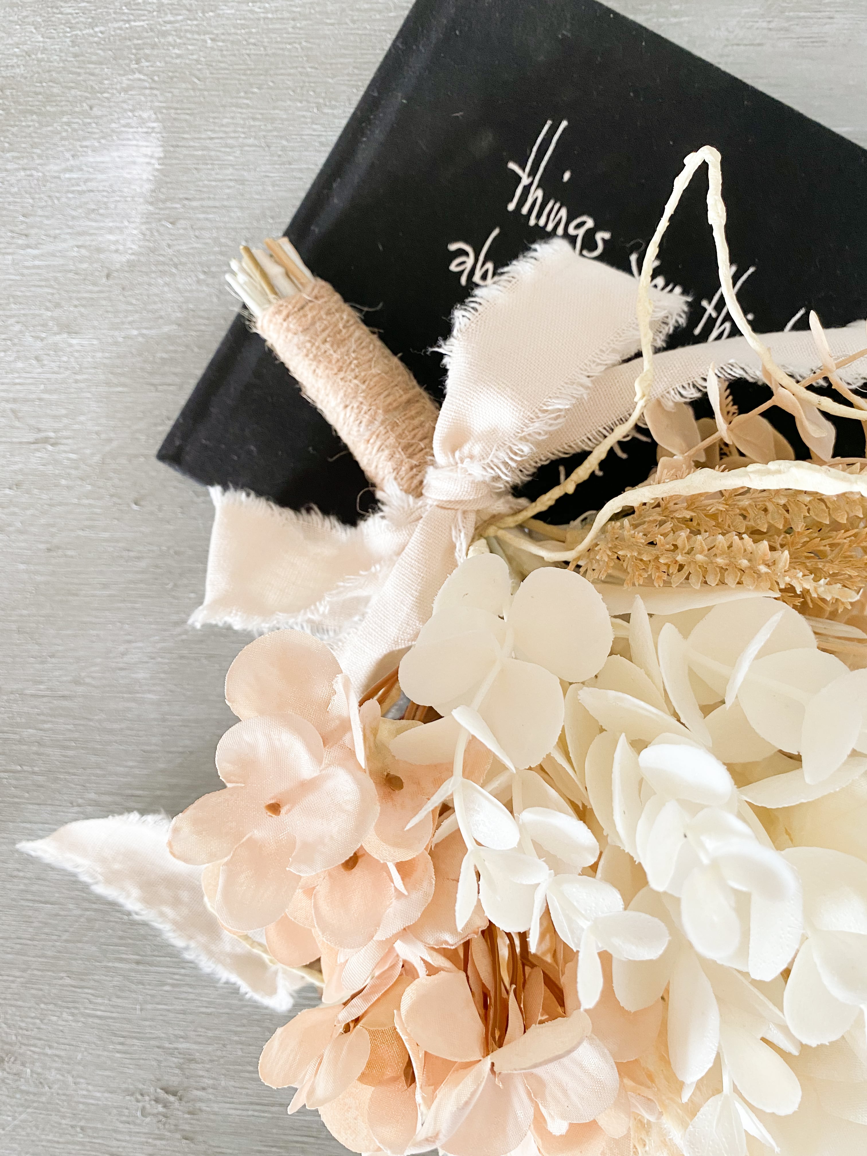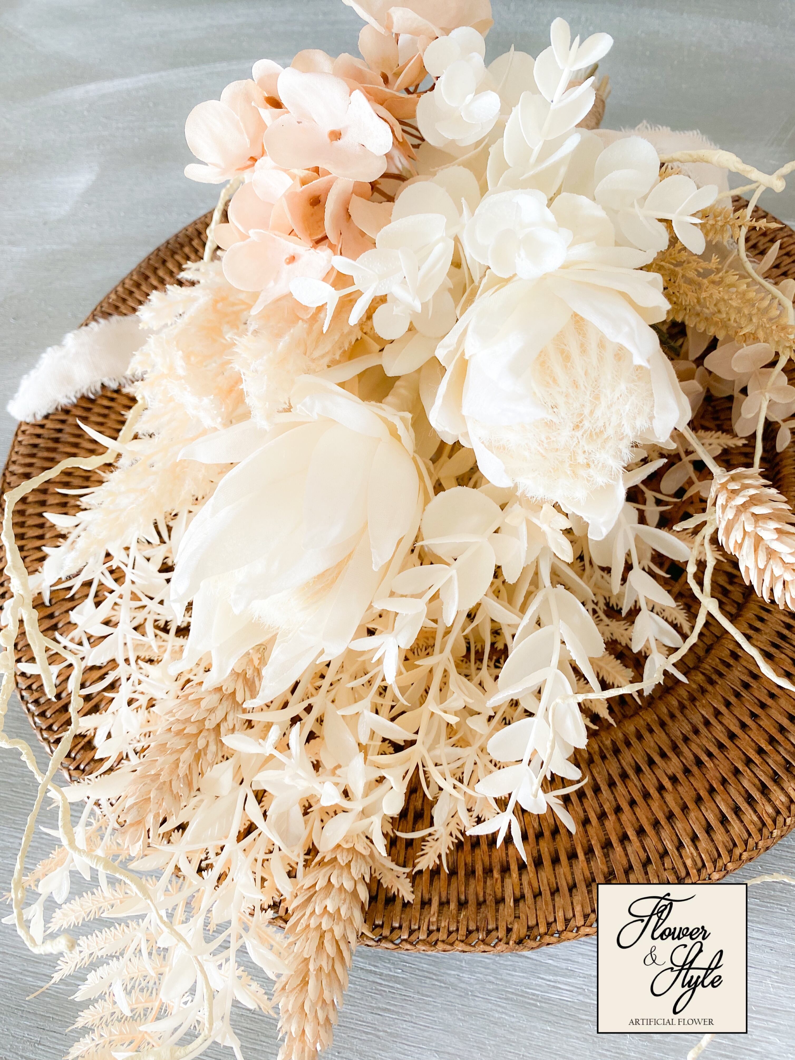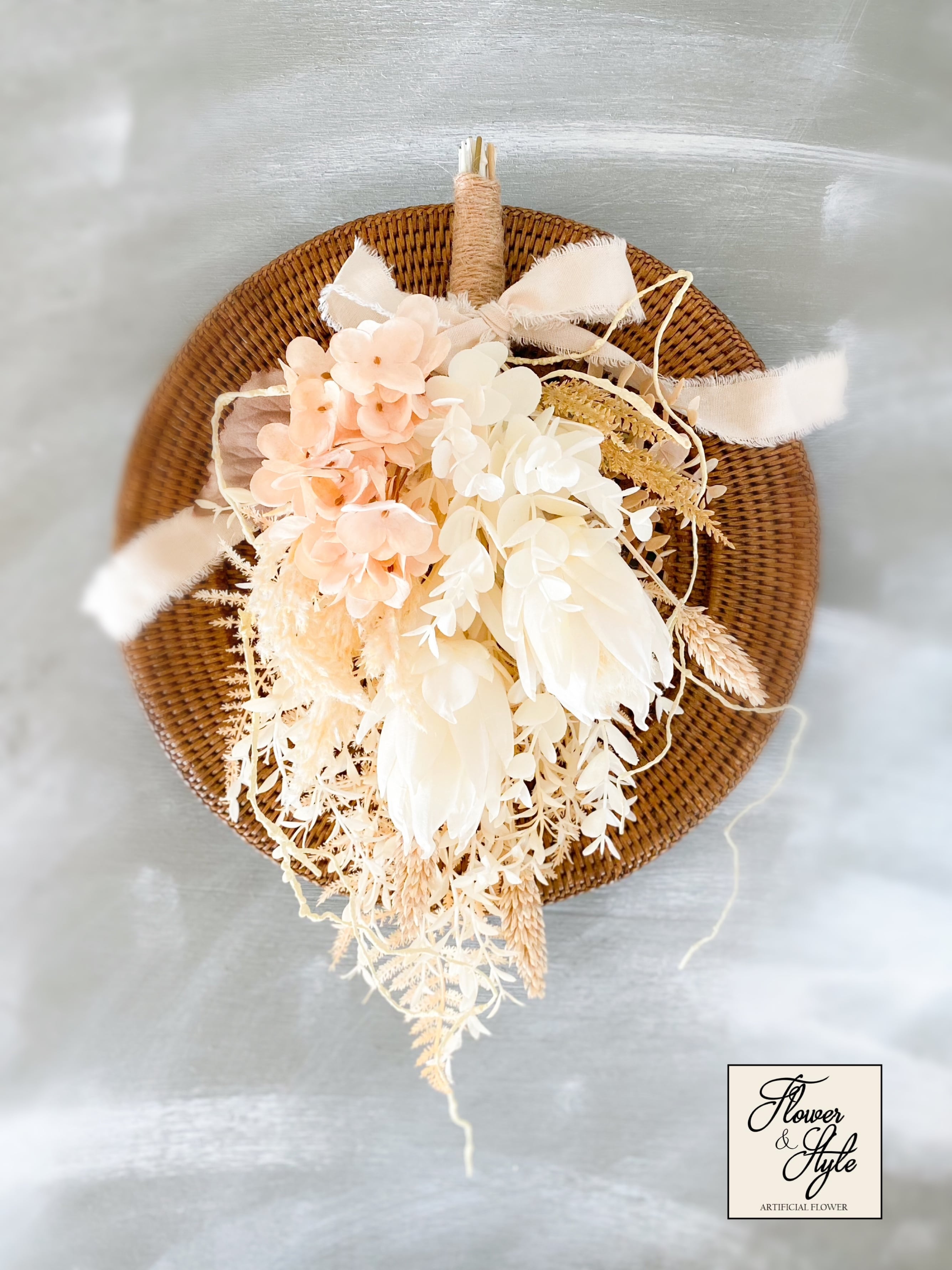 柔らかなアイボリーカラーのアーティフィシャルフラワー(高品質な造花)をたっぷりと使い、スワッグを作りました。