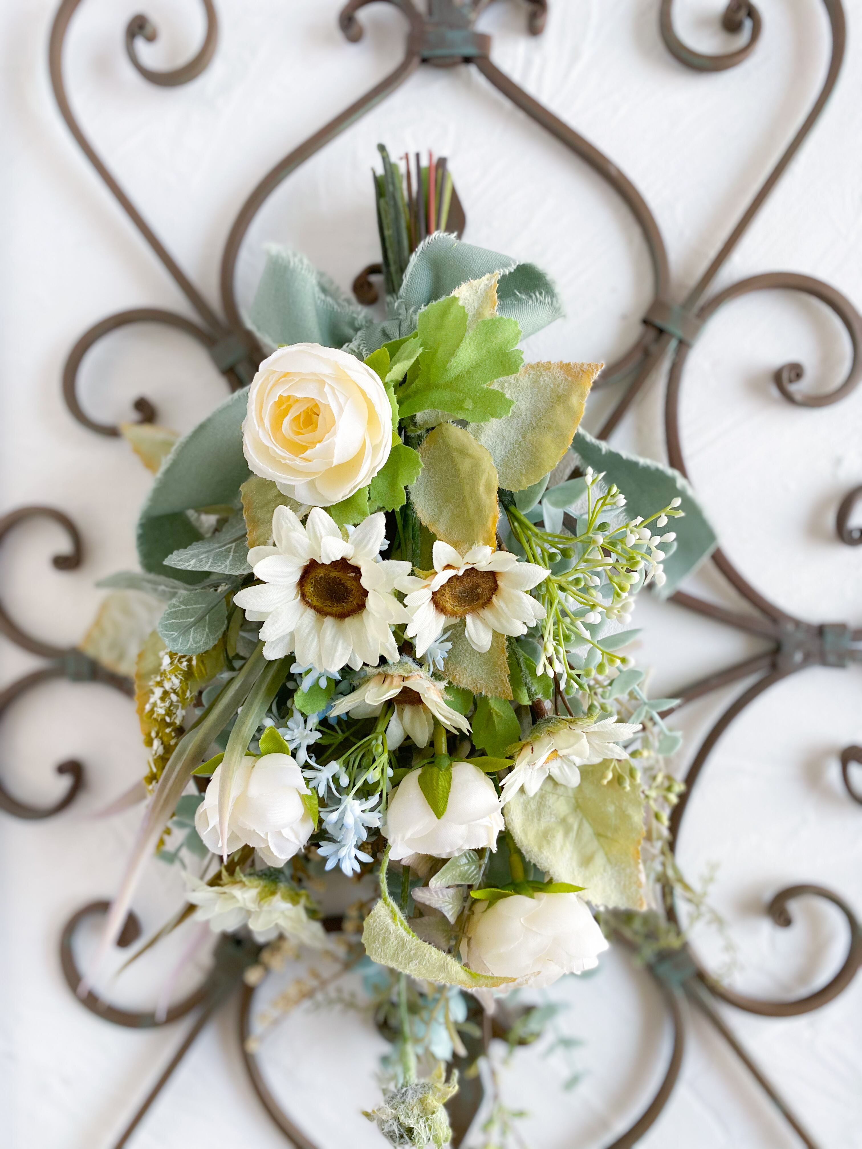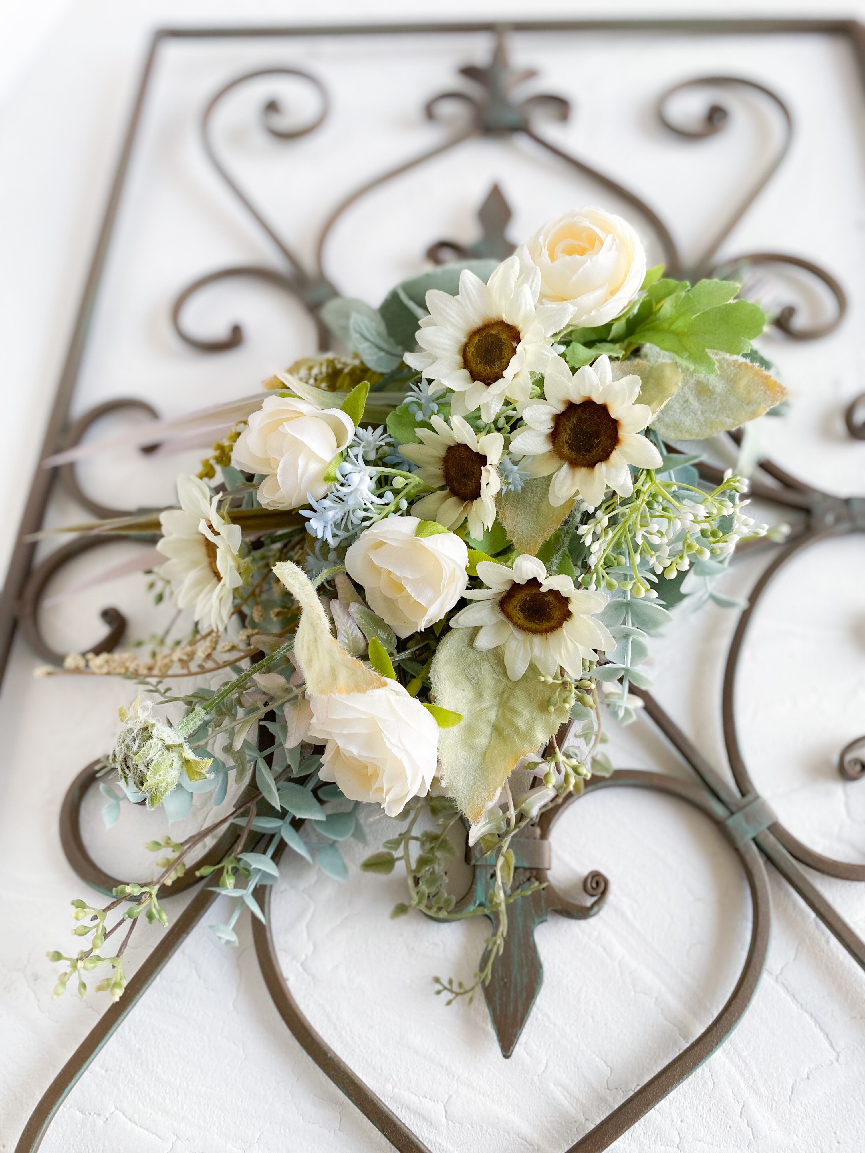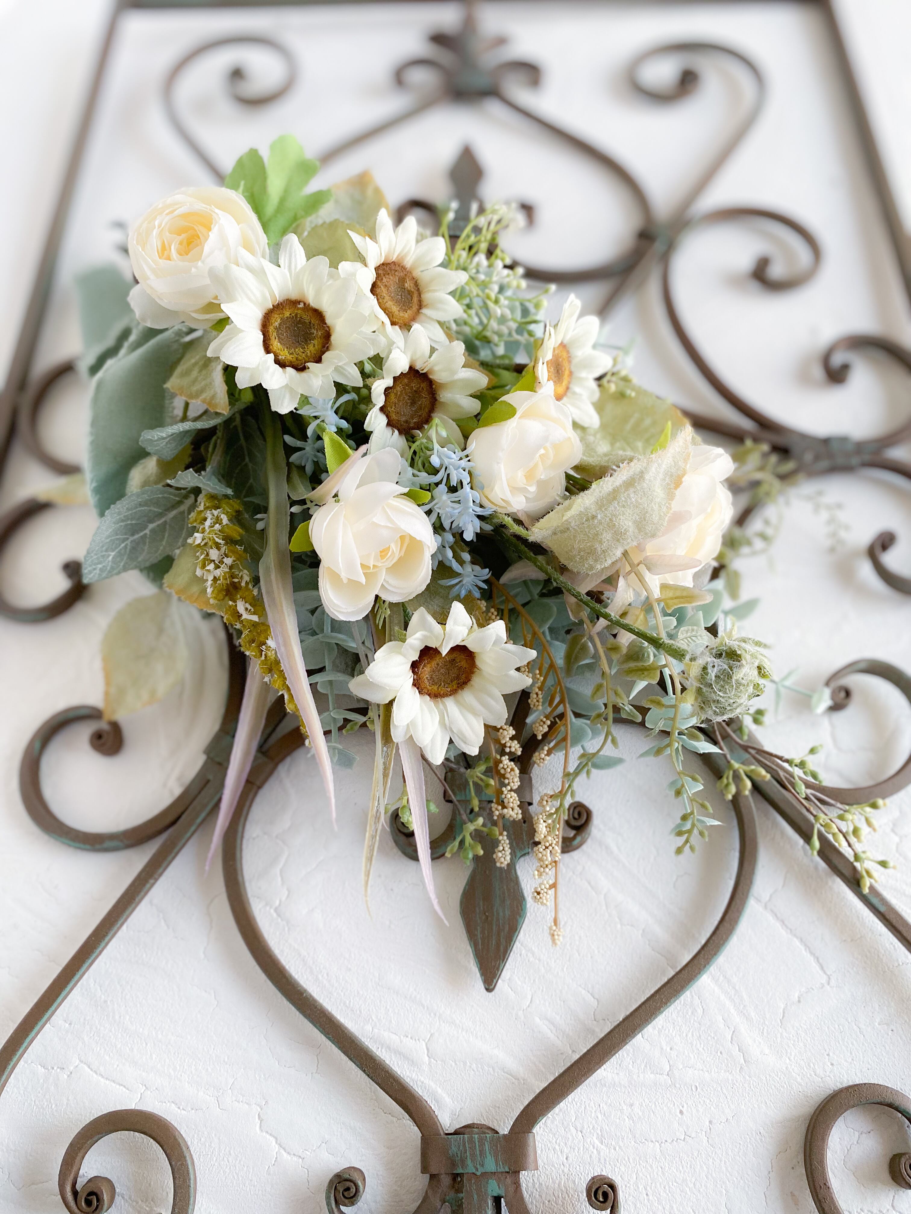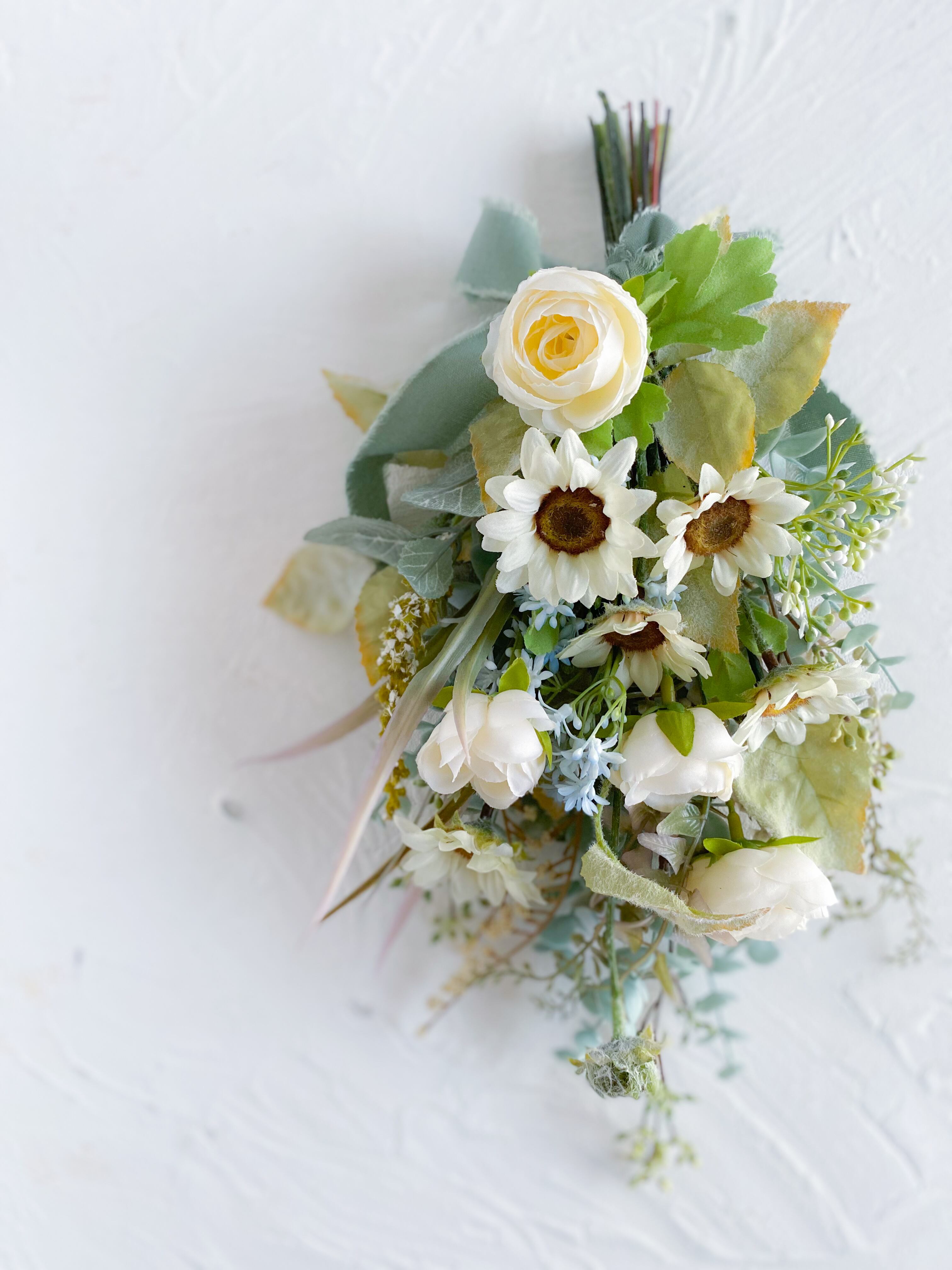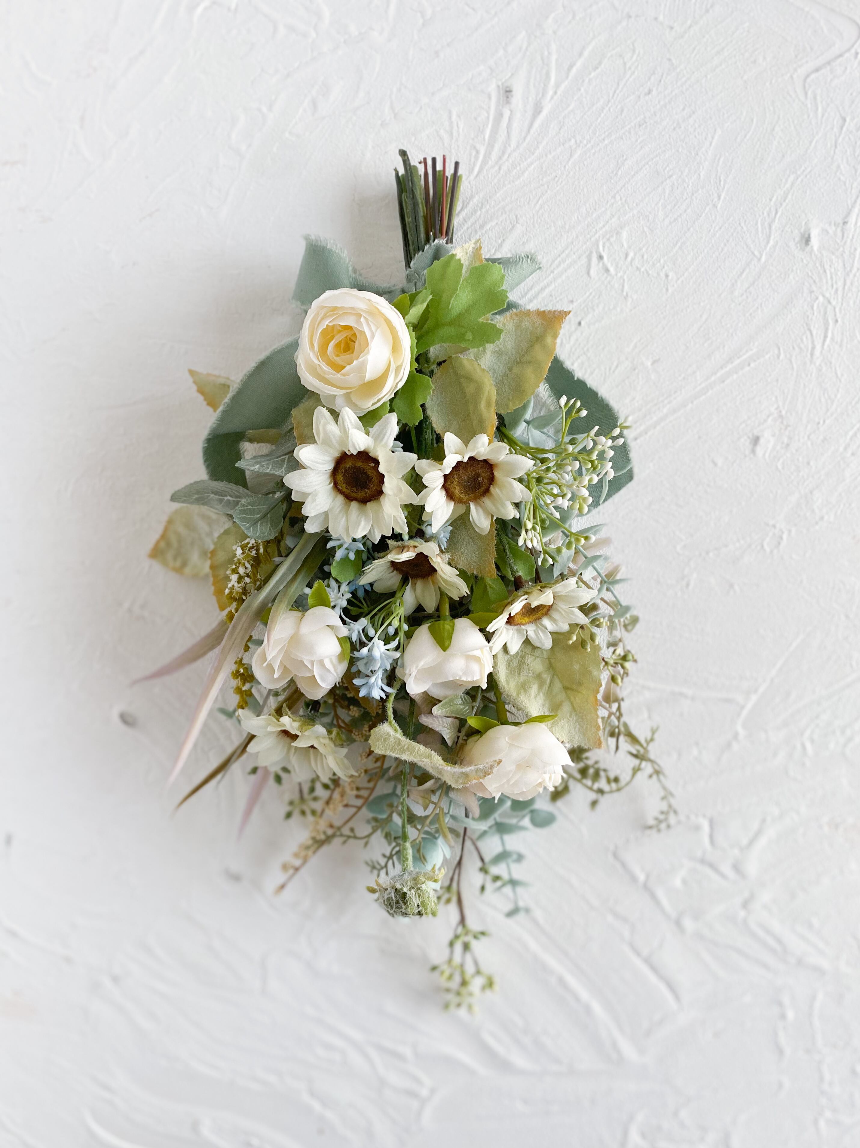 アーティフィシャルフラワー(高品質な造花)の小ぶりなオフホワイトひまわりと出会い そのかわいらしさを皆さまにもお伝えしたくなり 爽やかなスワッグを束ねてみました。
