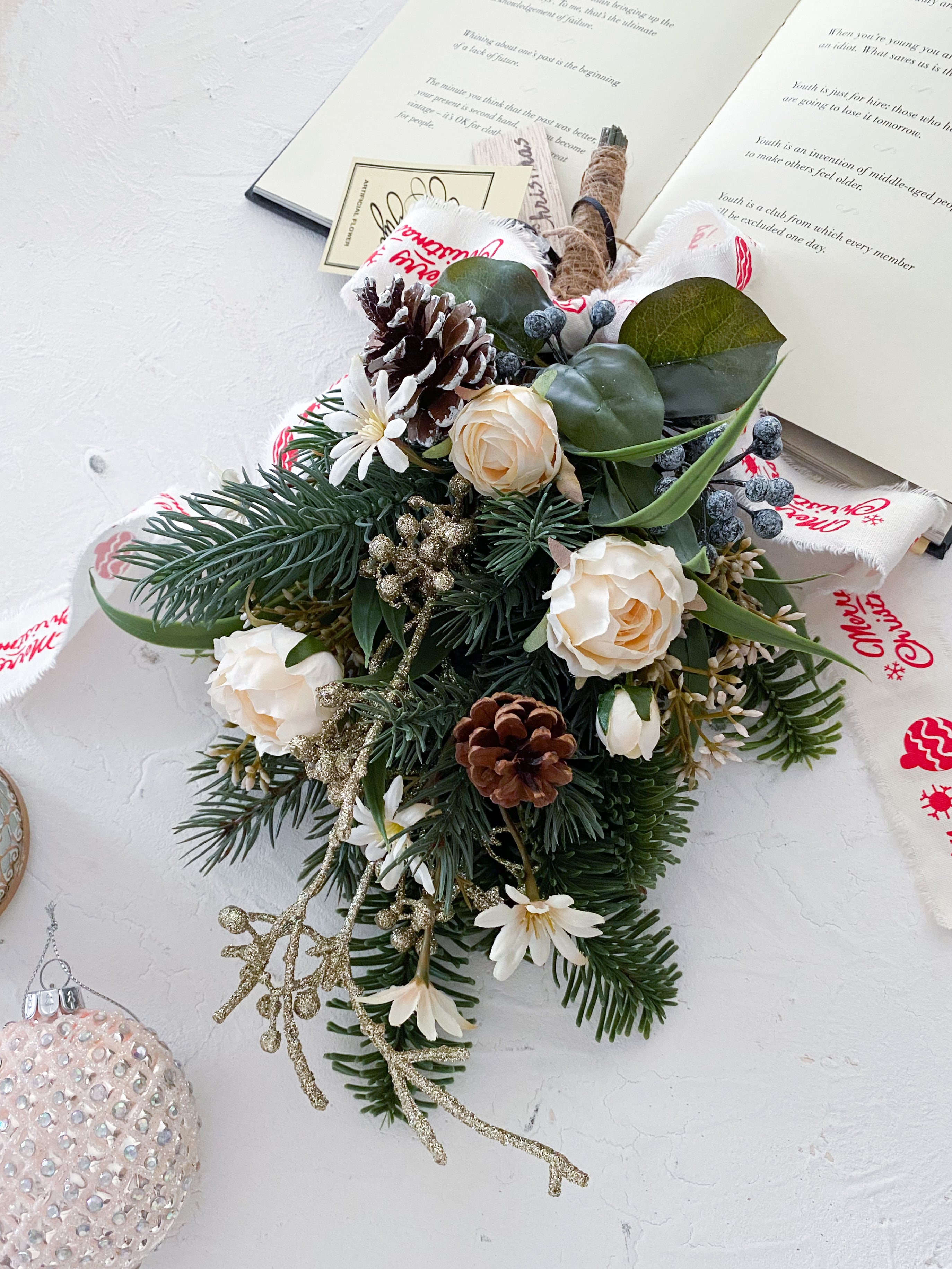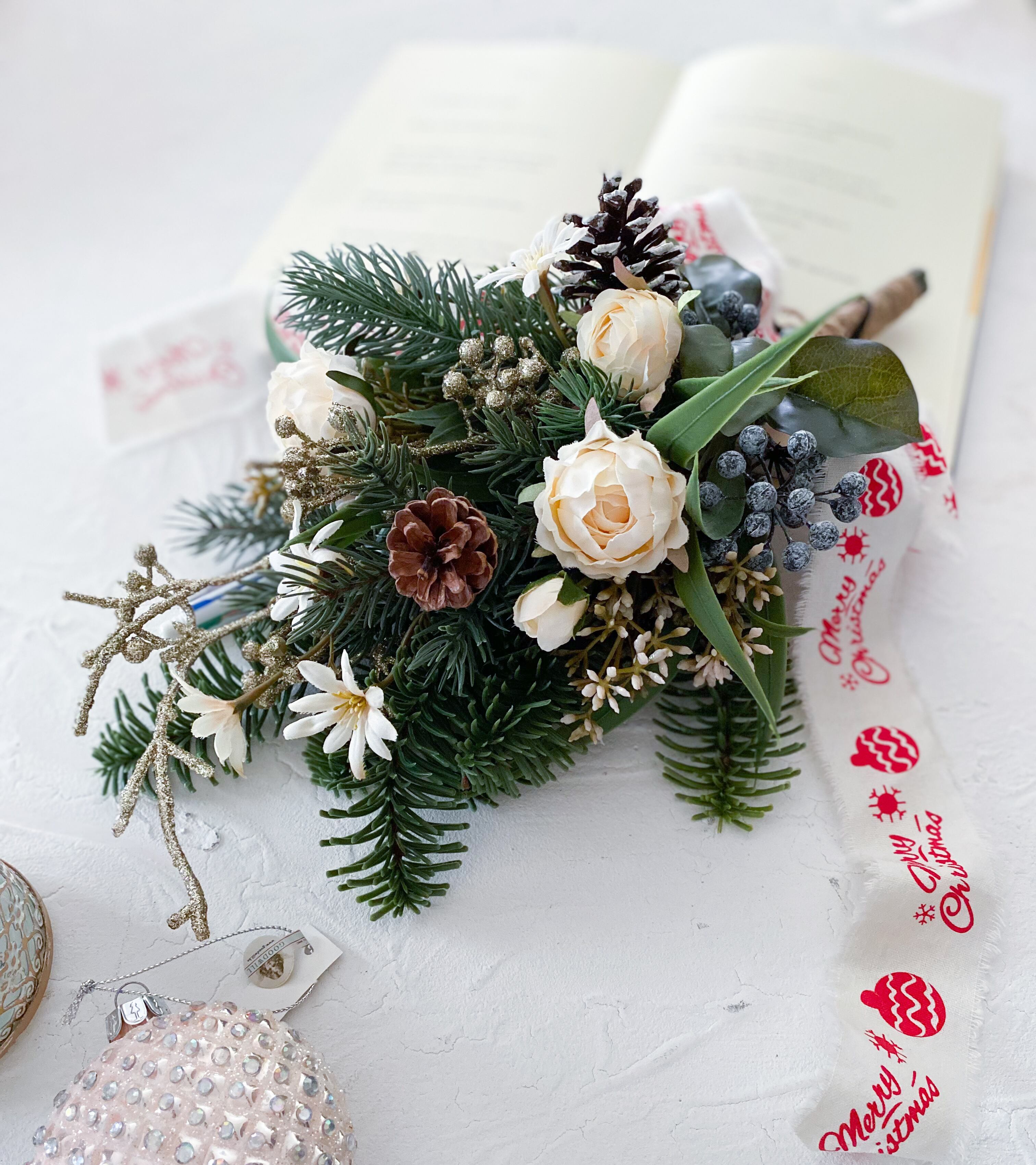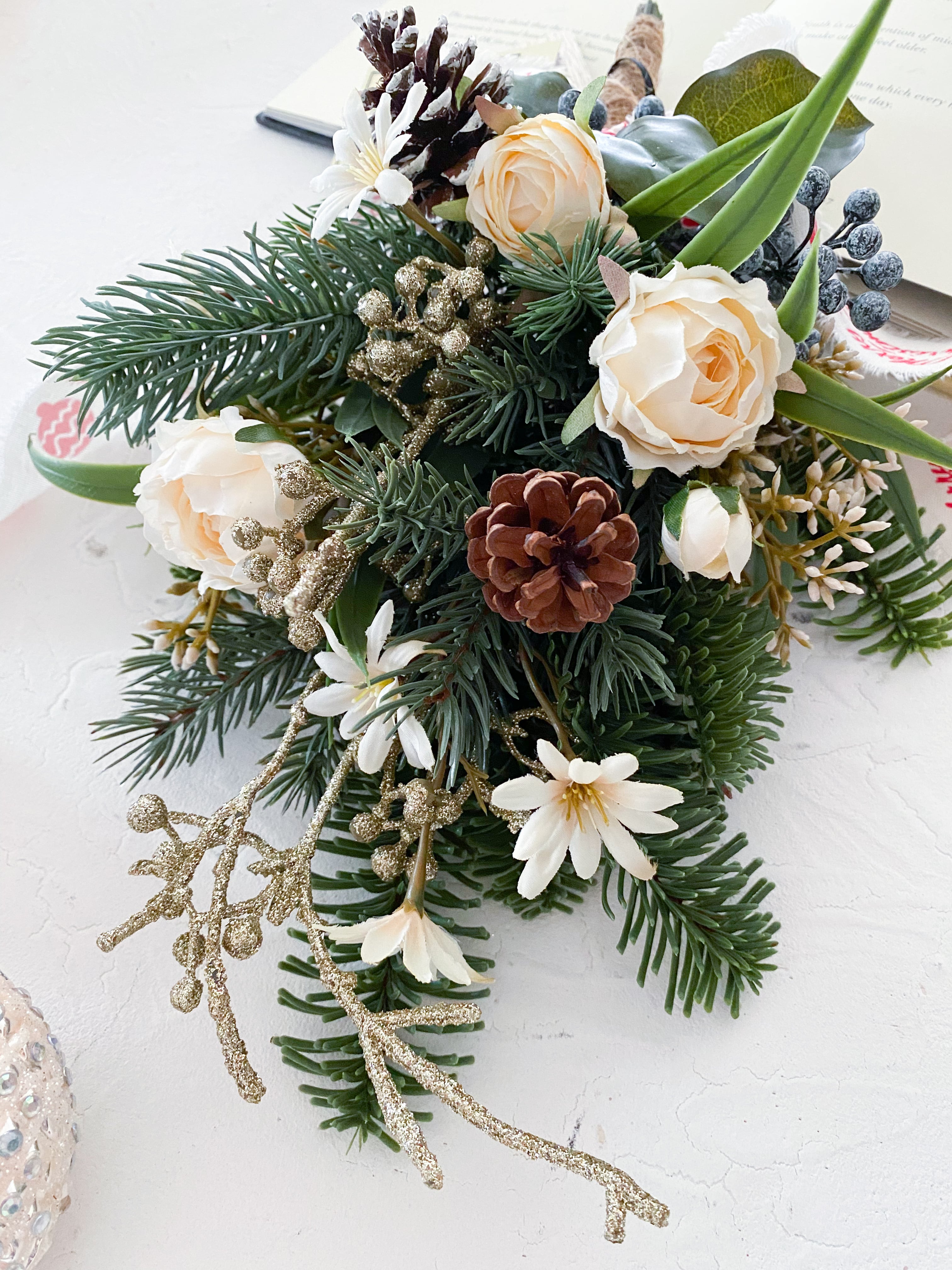 エクリュのまあるいバラや小花、松かさなどを合わせて