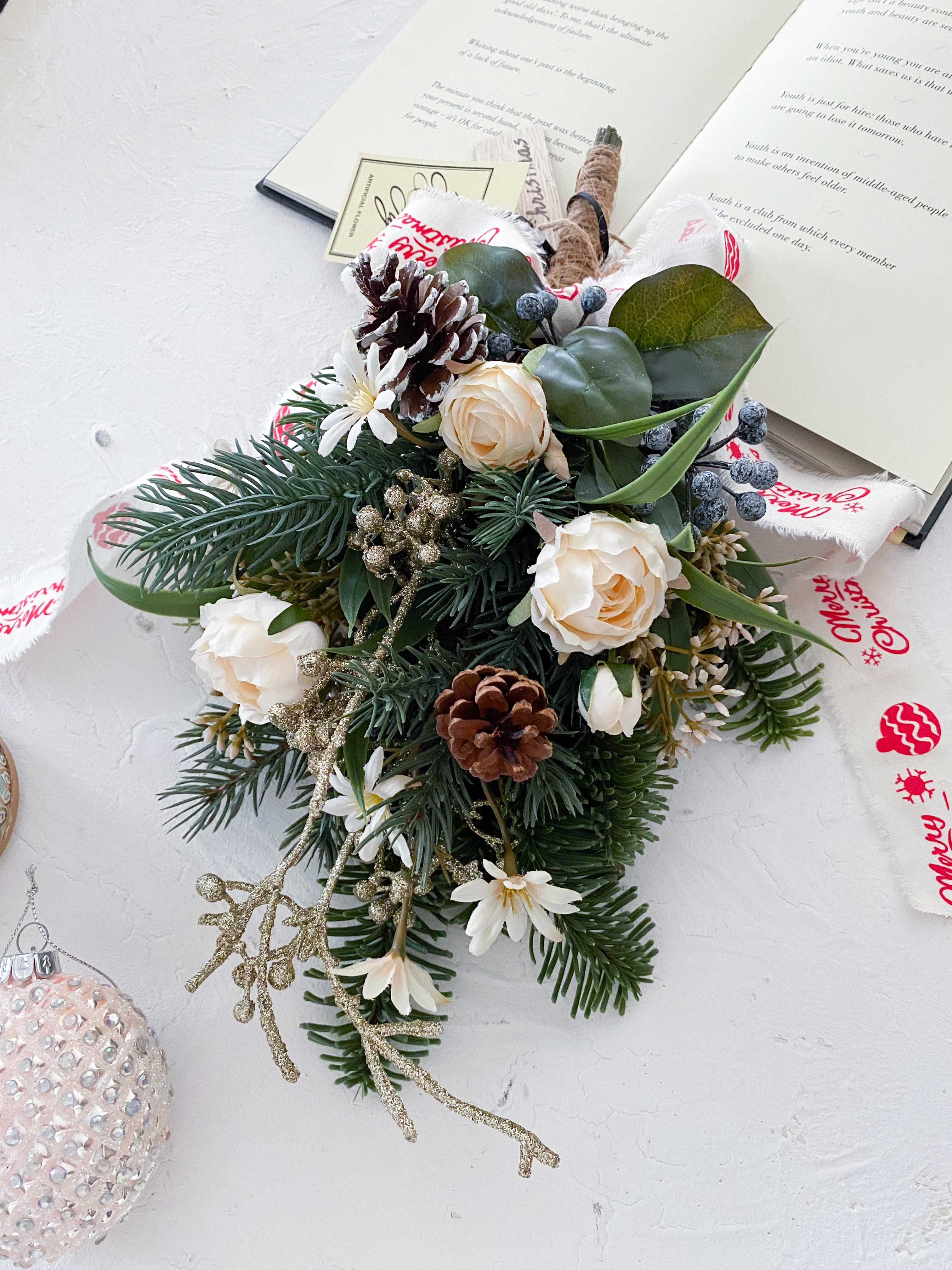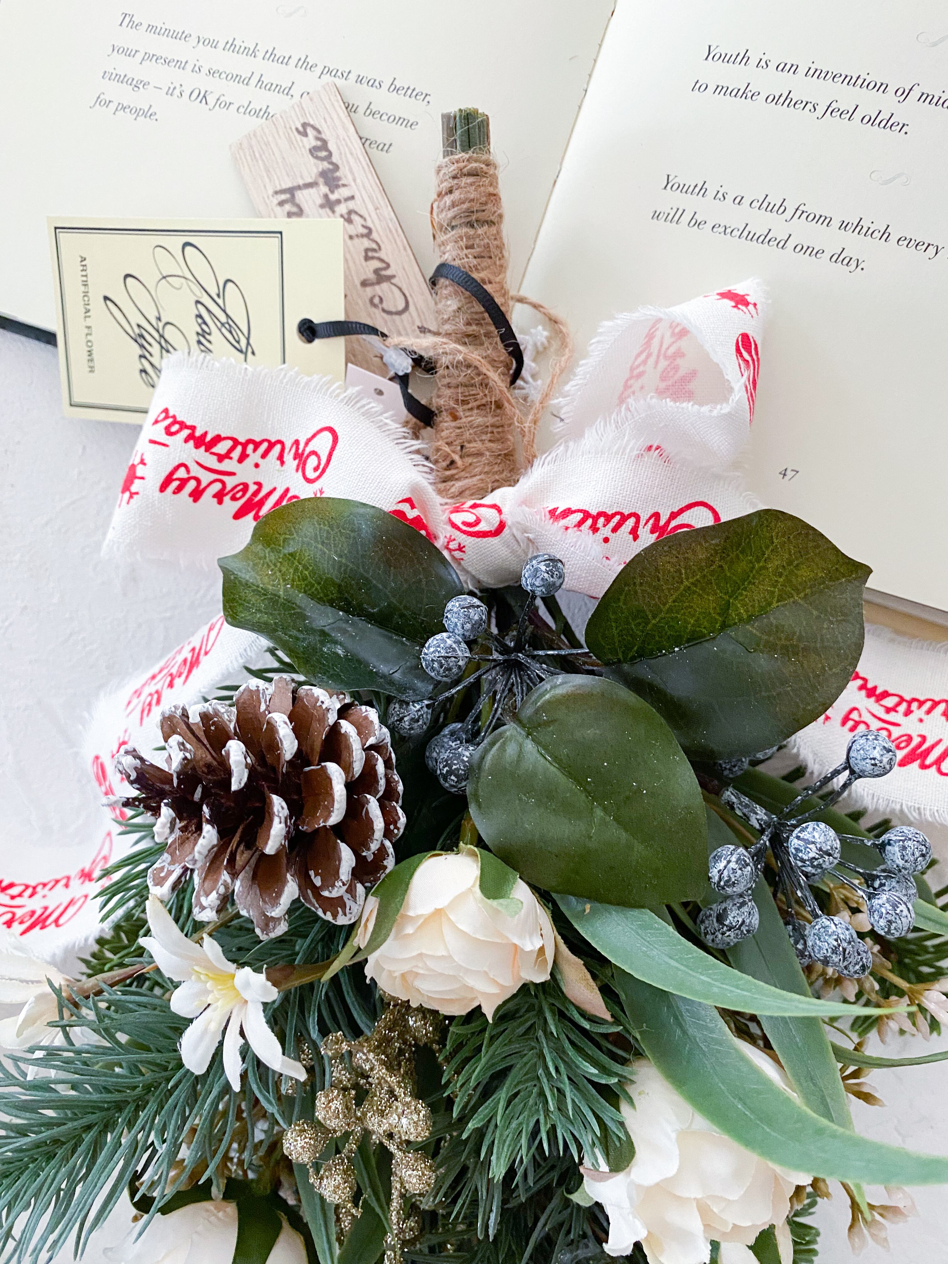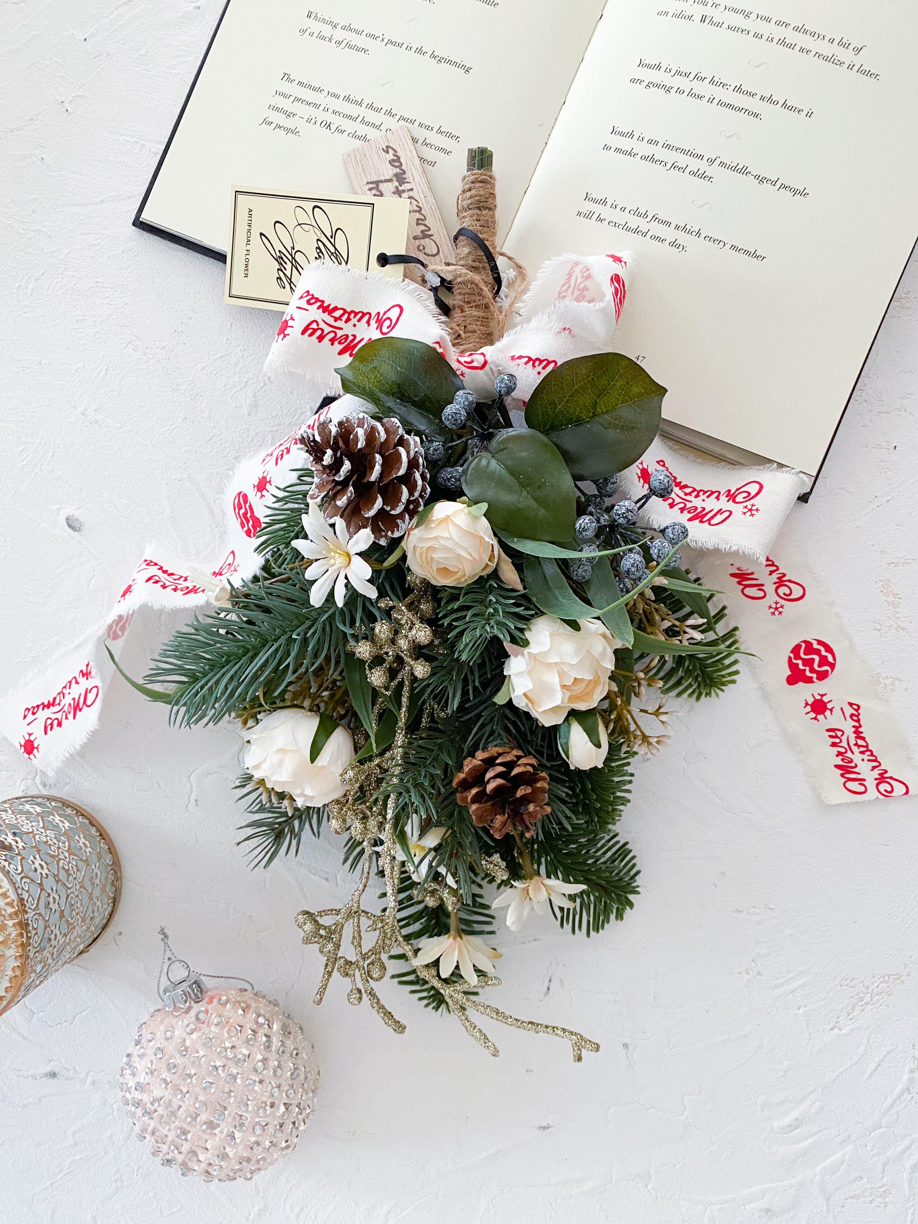 エクリュのまあるいバラや小花、松かさなどを合わせて