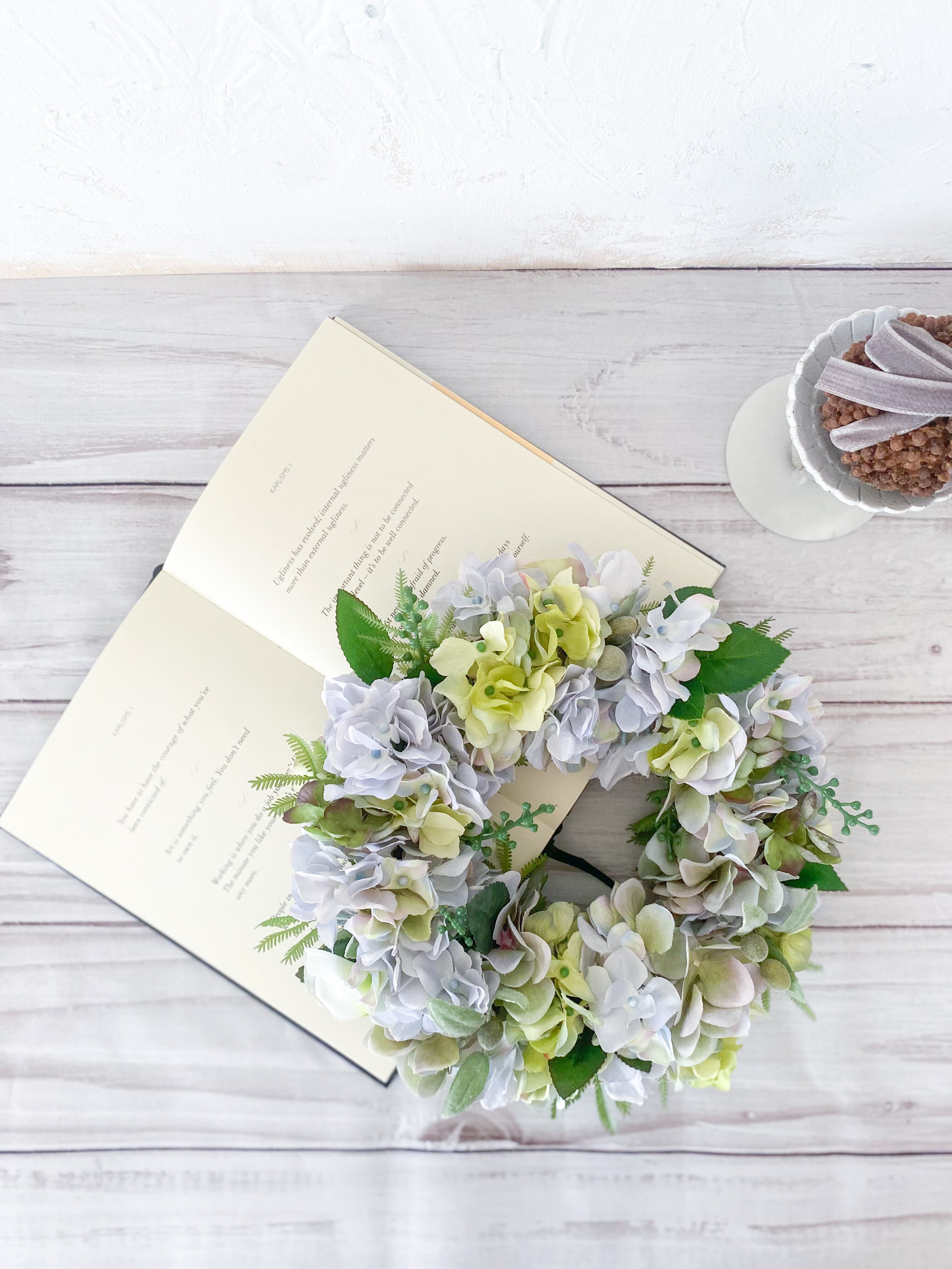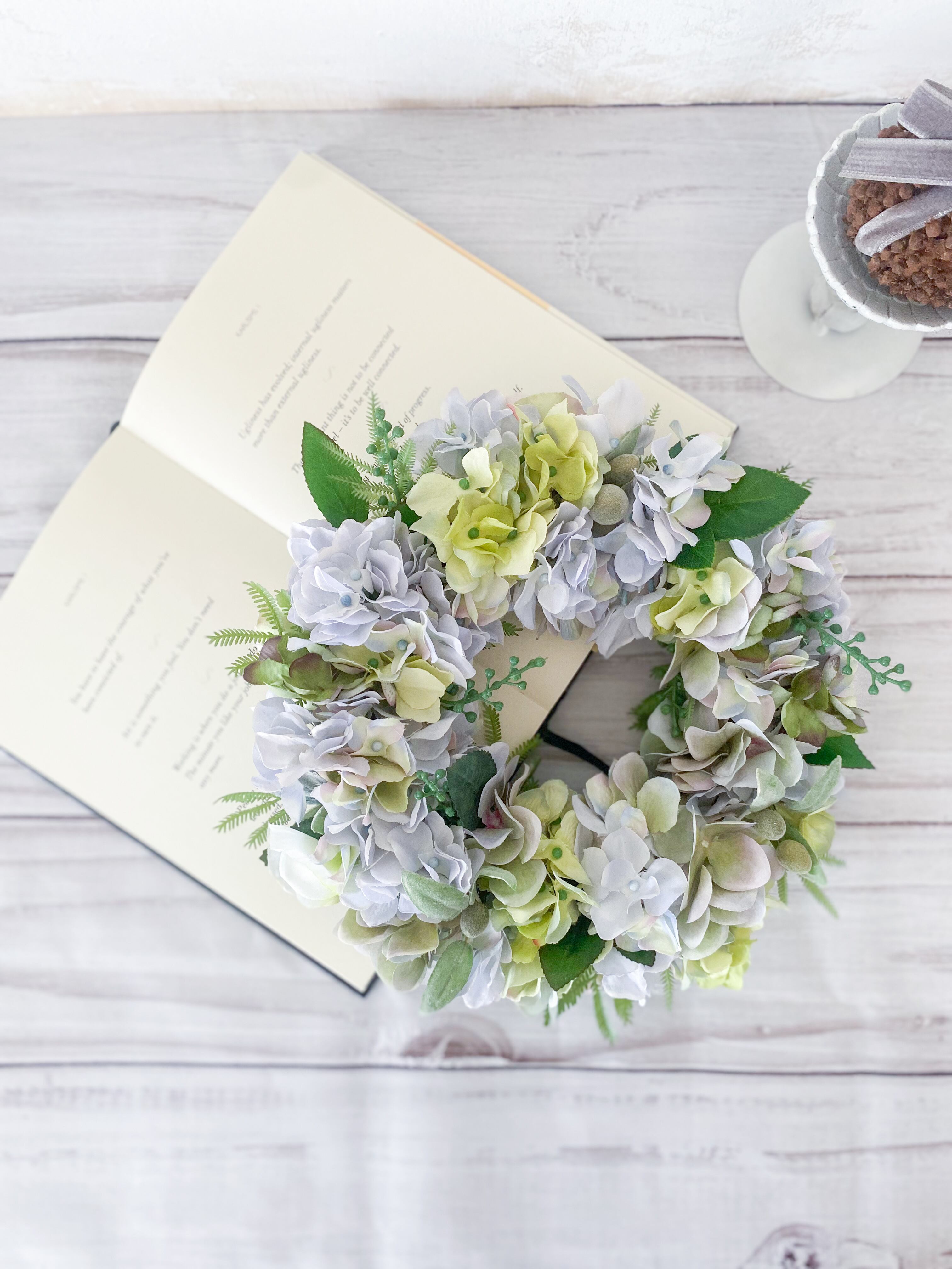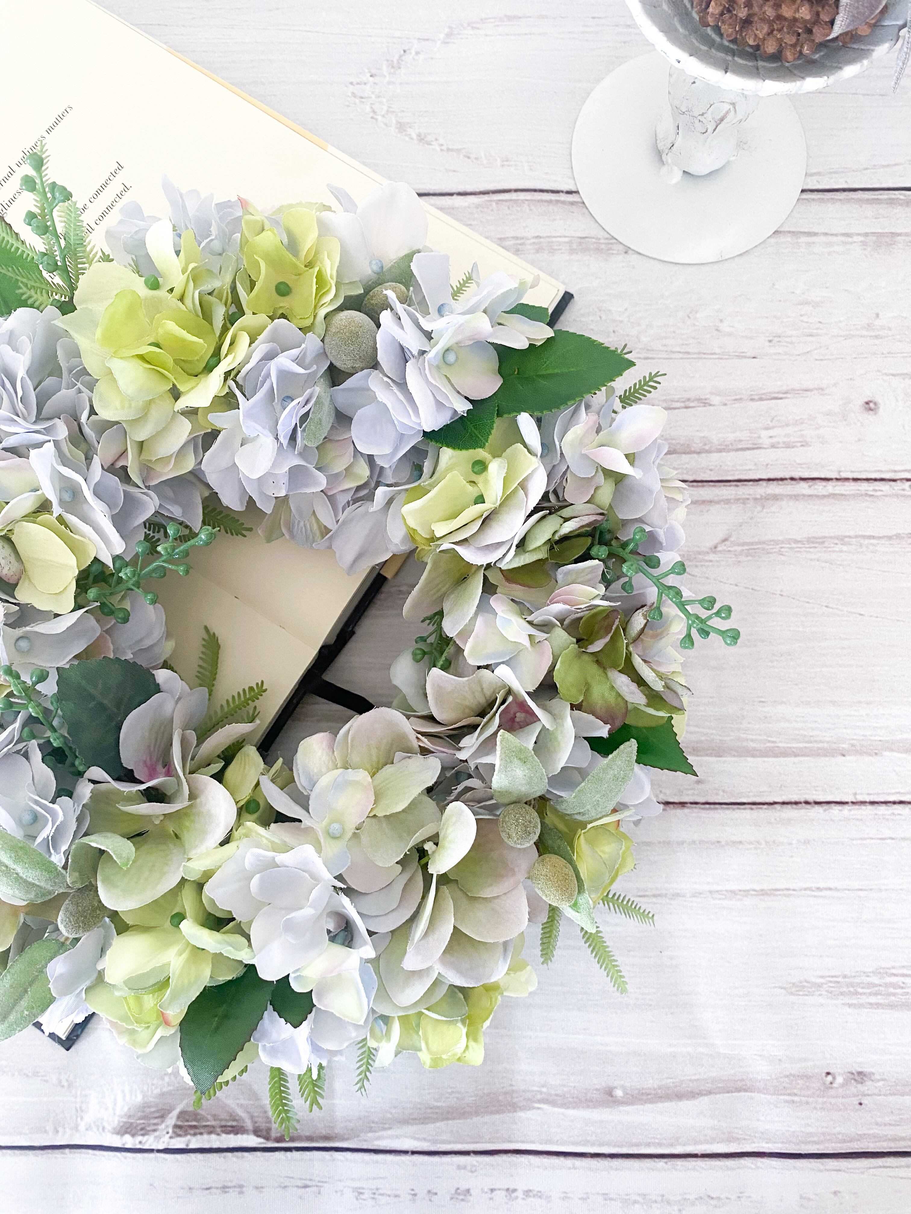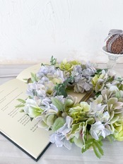 アーティフィシャルフラワー(クオリティの高い造花)のアジサイを主役に、爽やか&涼やかな雰囲気のリースを作りました。