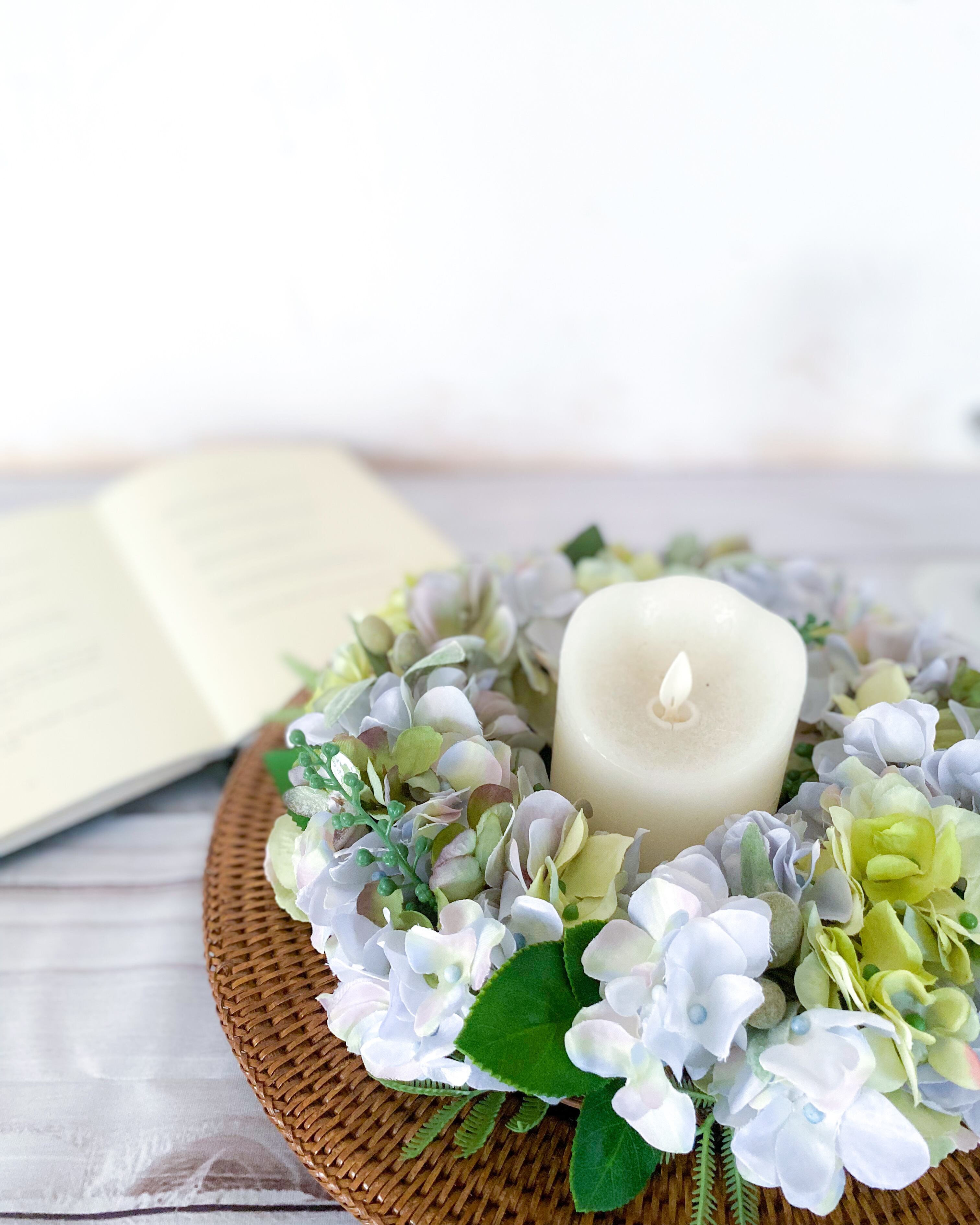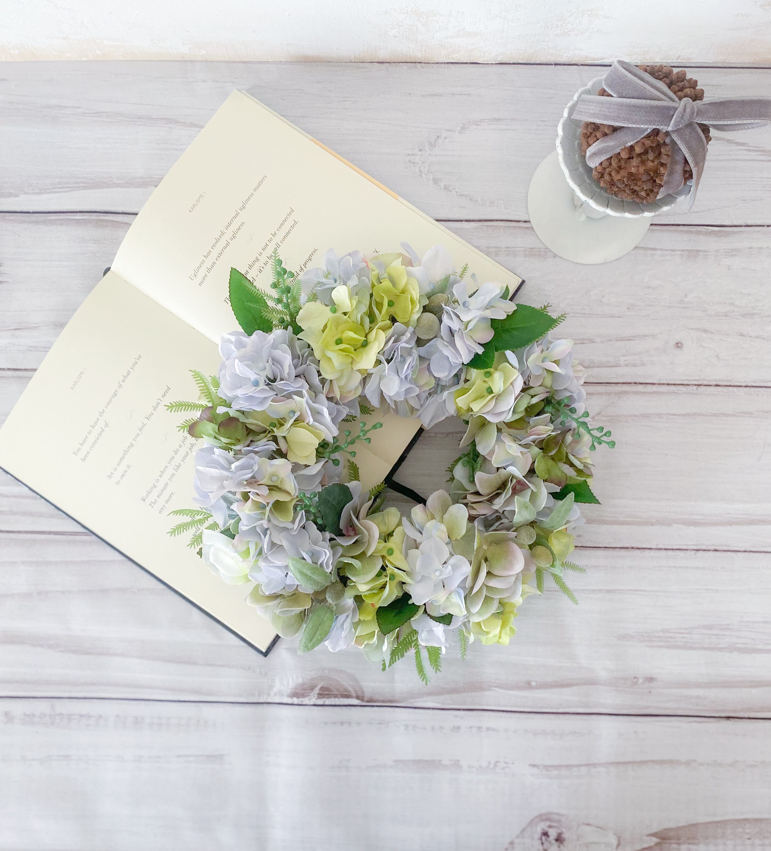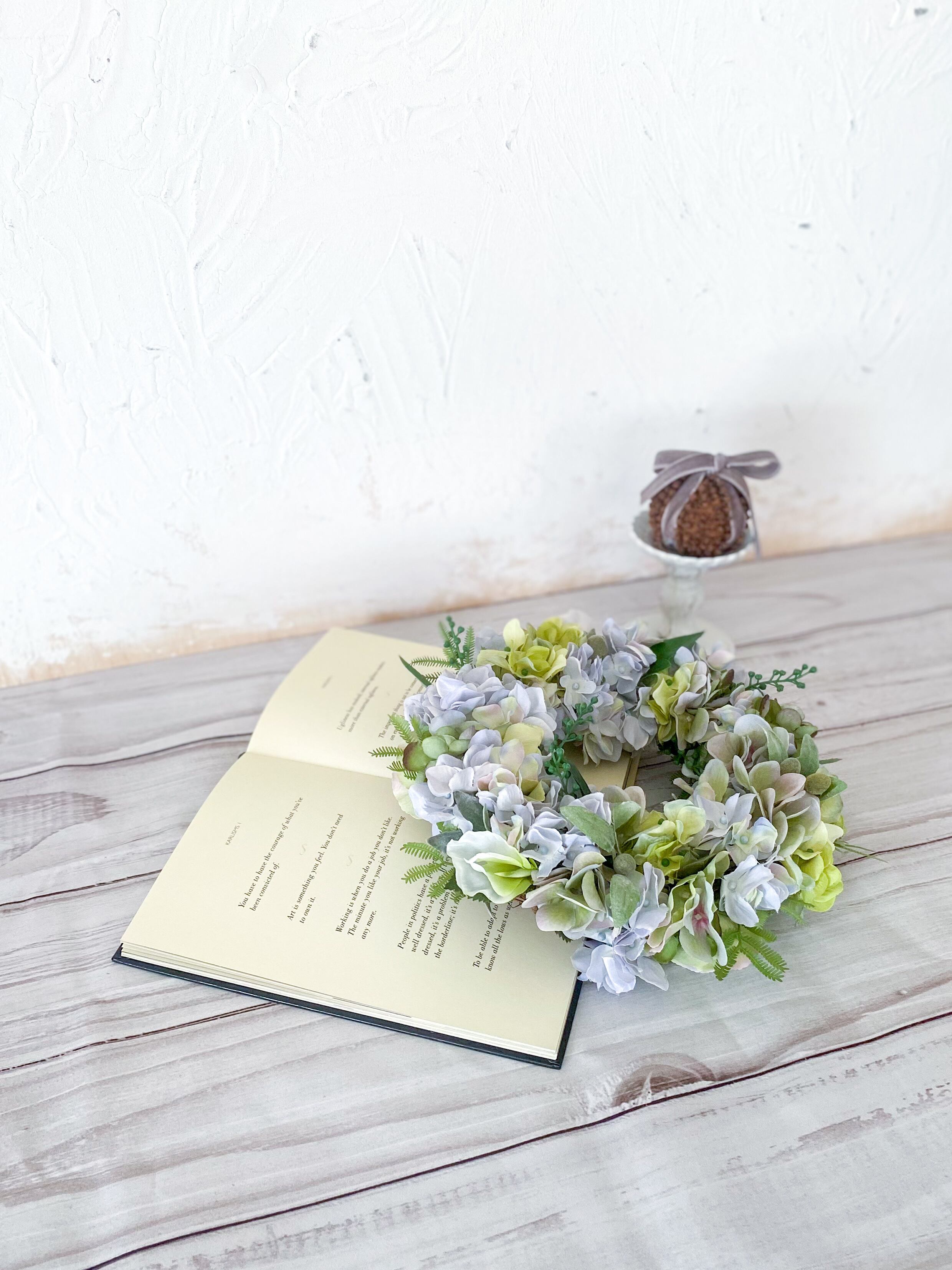 アーティフィシャルフラワー(クオリティの高い造花)のアジサイを主役に、爽やか&涼やかな雰囲気のリースを作りました。