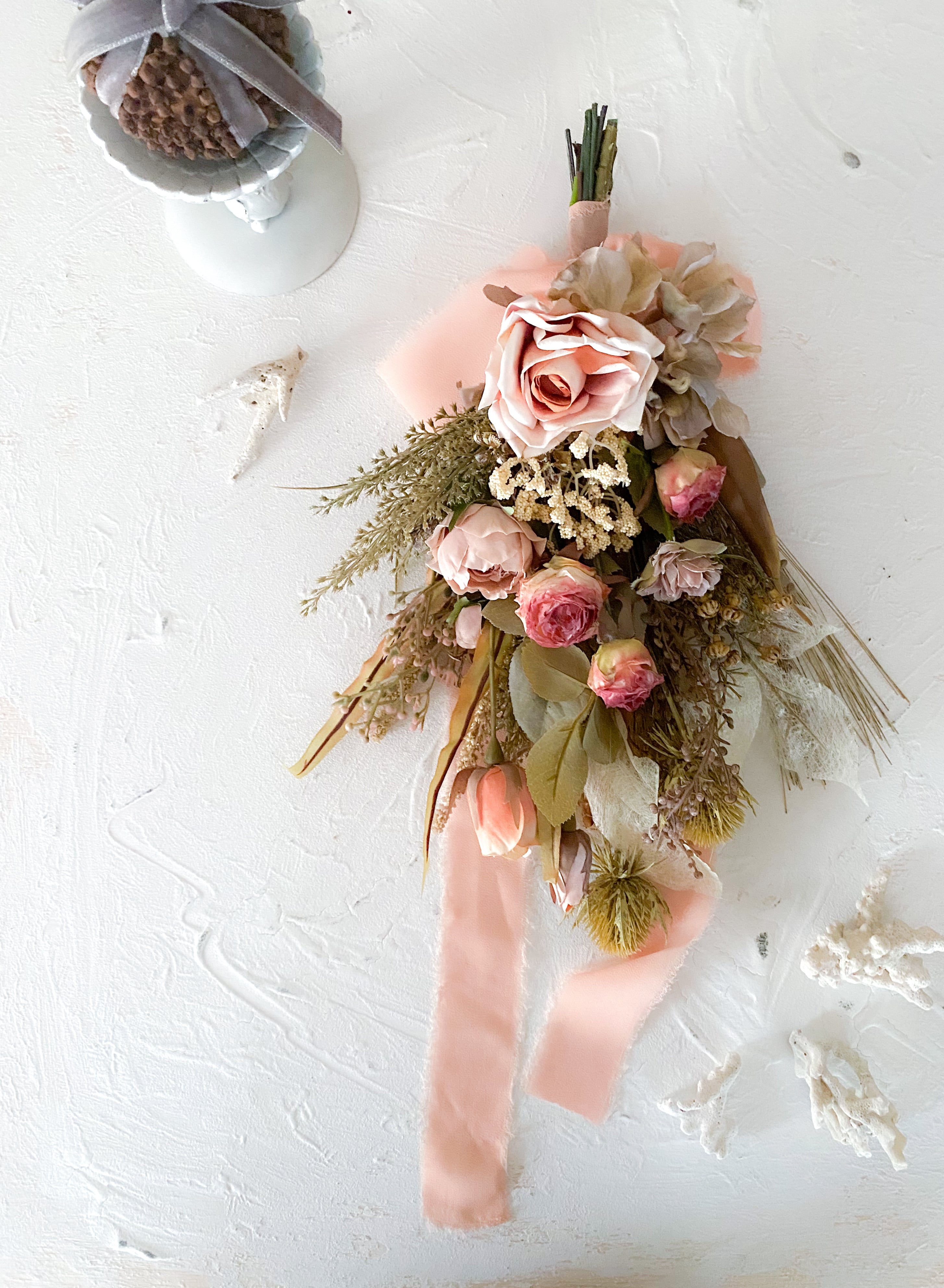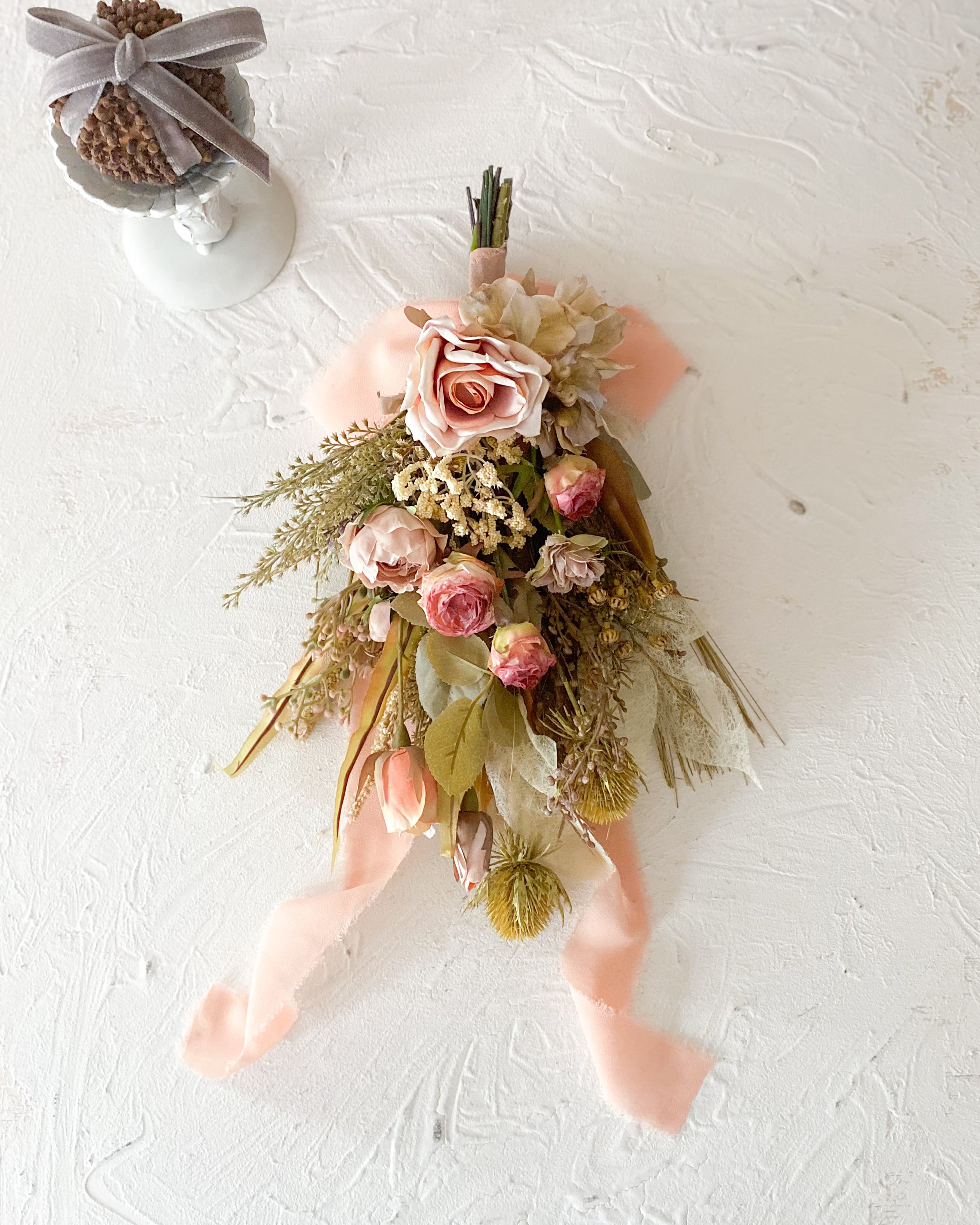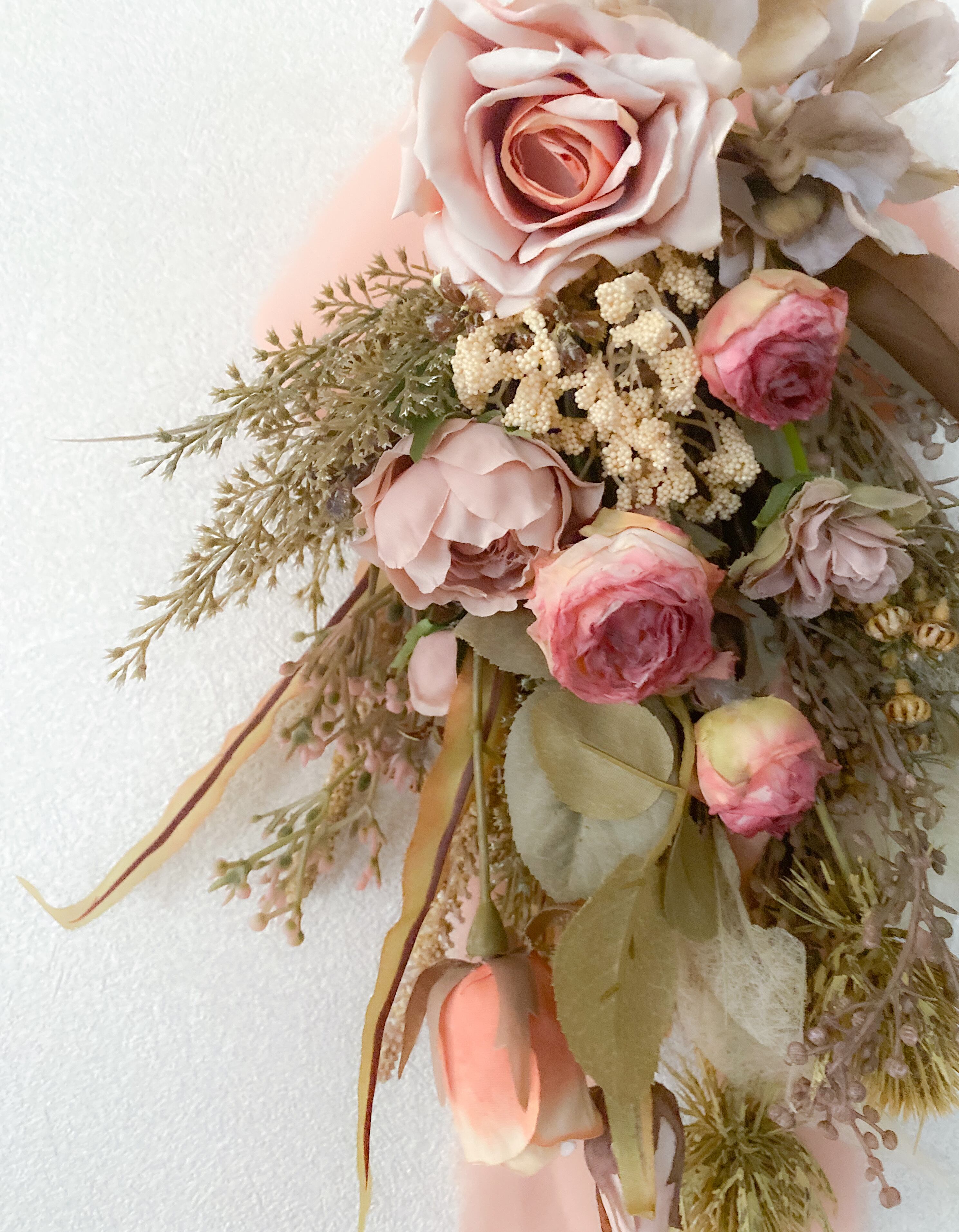 それぞれ、淡いアプリコットやピンク色を含んだドライフラワー風のバラやピンクベージュのバラたちに、なんとも言えないシックな雰囲気のアジサイ、様々な個性を持つ実ものや葉などを合わせて、落ち着きのある中にも華やかさが漂うデザインに仕上げました