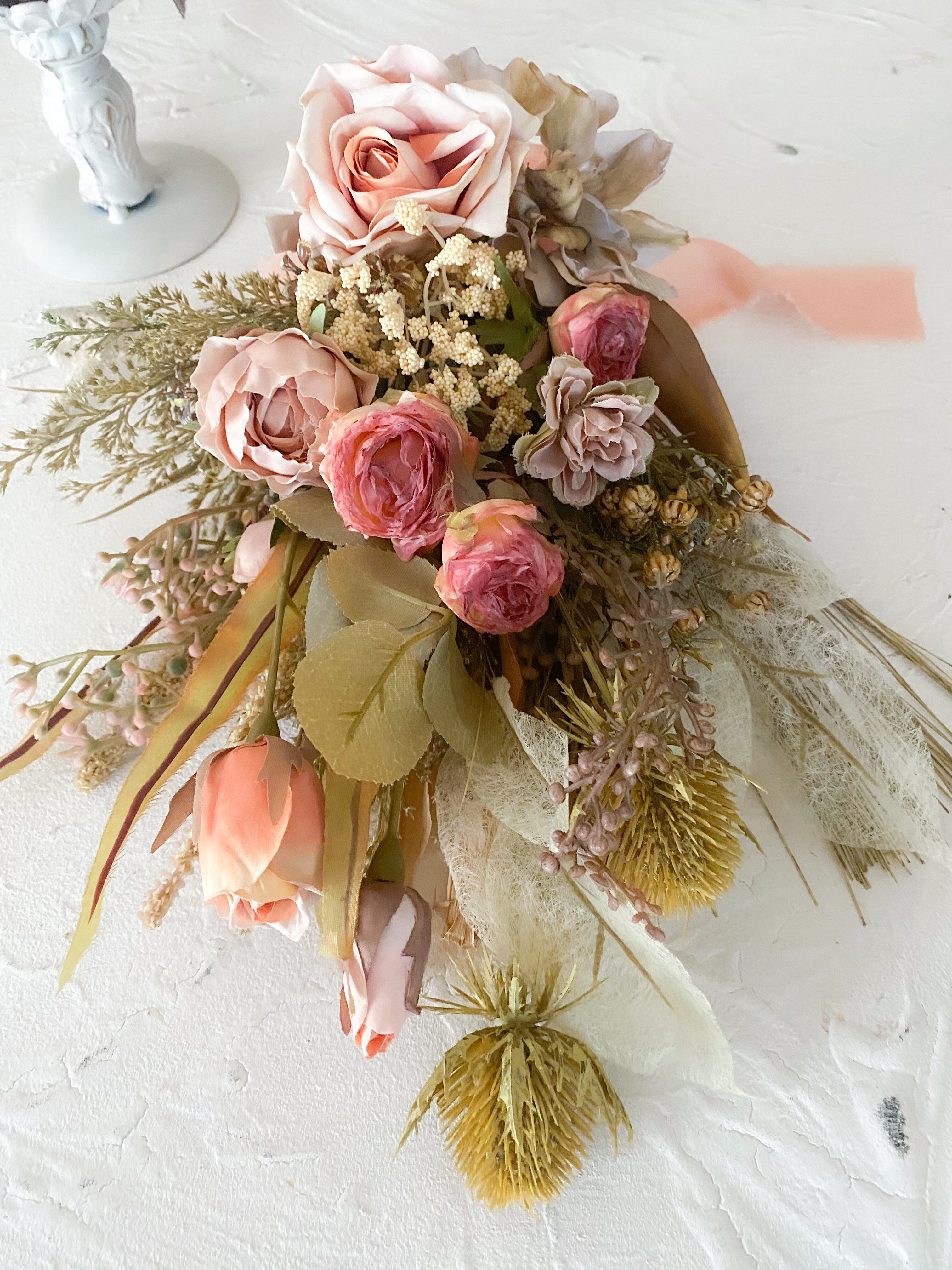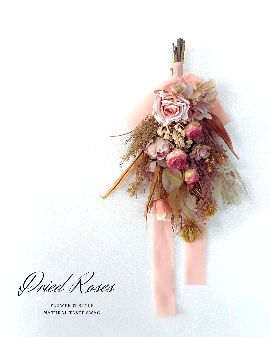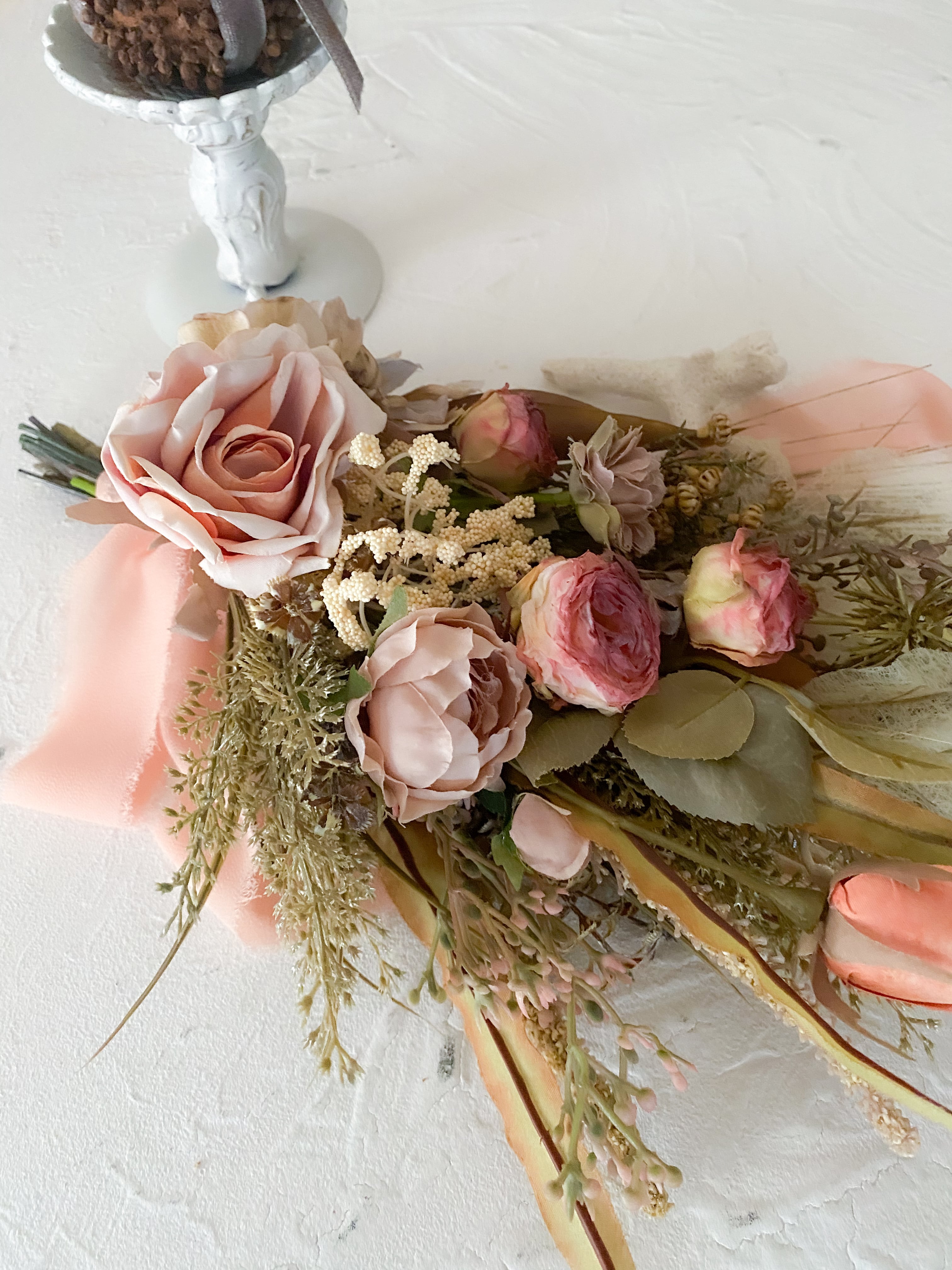 アーティフィシャルフラワー(クオリティの高い造花)のドライフラワー風のバラを主役に、ナチュラルなムードいっぱいのスワッグを作りました