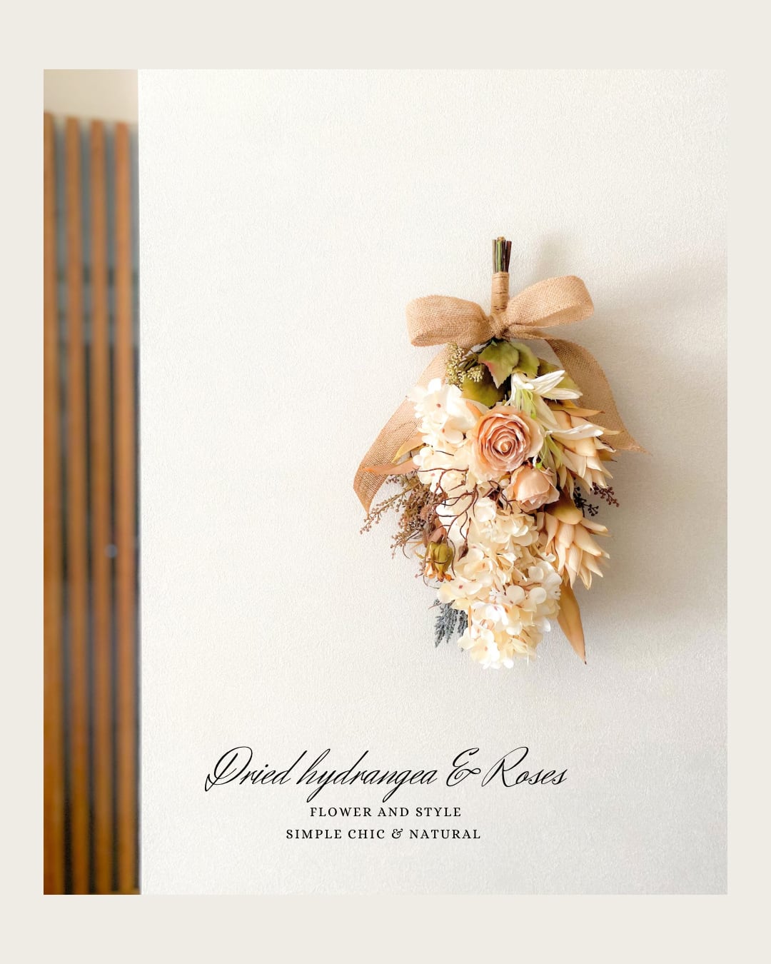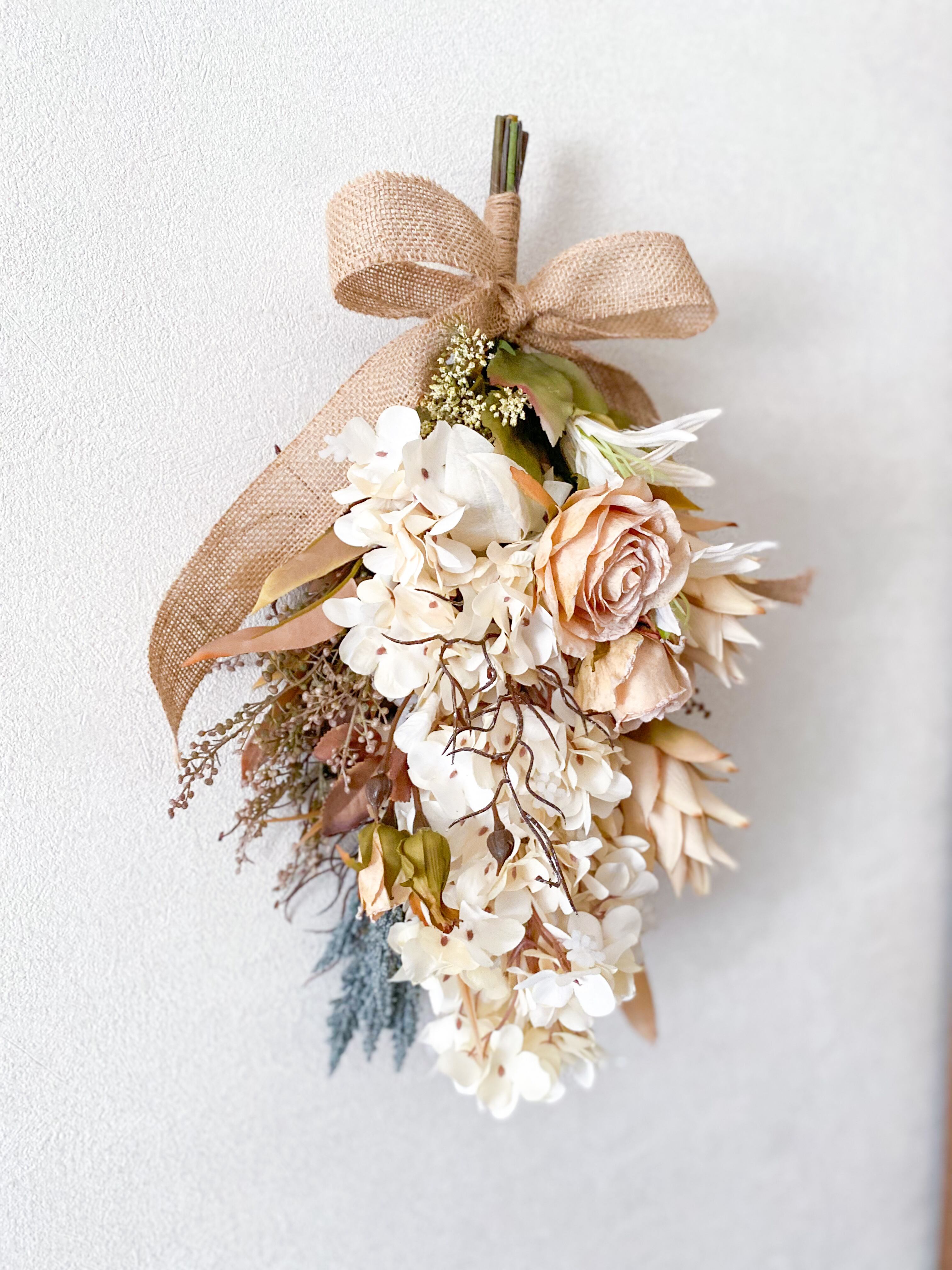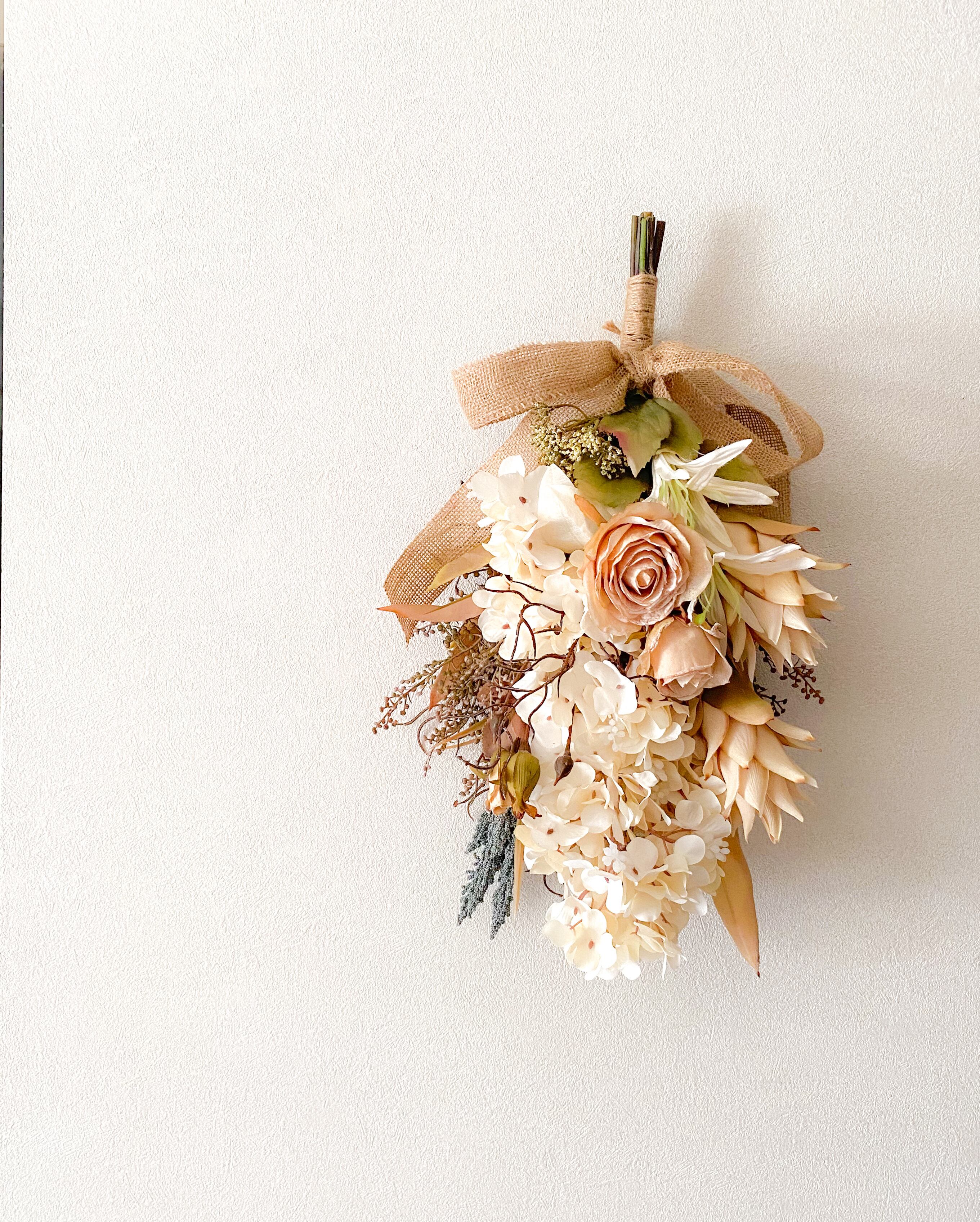 ドライフラワー特有の「枯れ感」を見事に再現したクオリティの高いアーティフィシャルフラワーたちを組み合わせ、ナチュラル感たっぷりで気負わずに飾れるデザインに仕上げました
