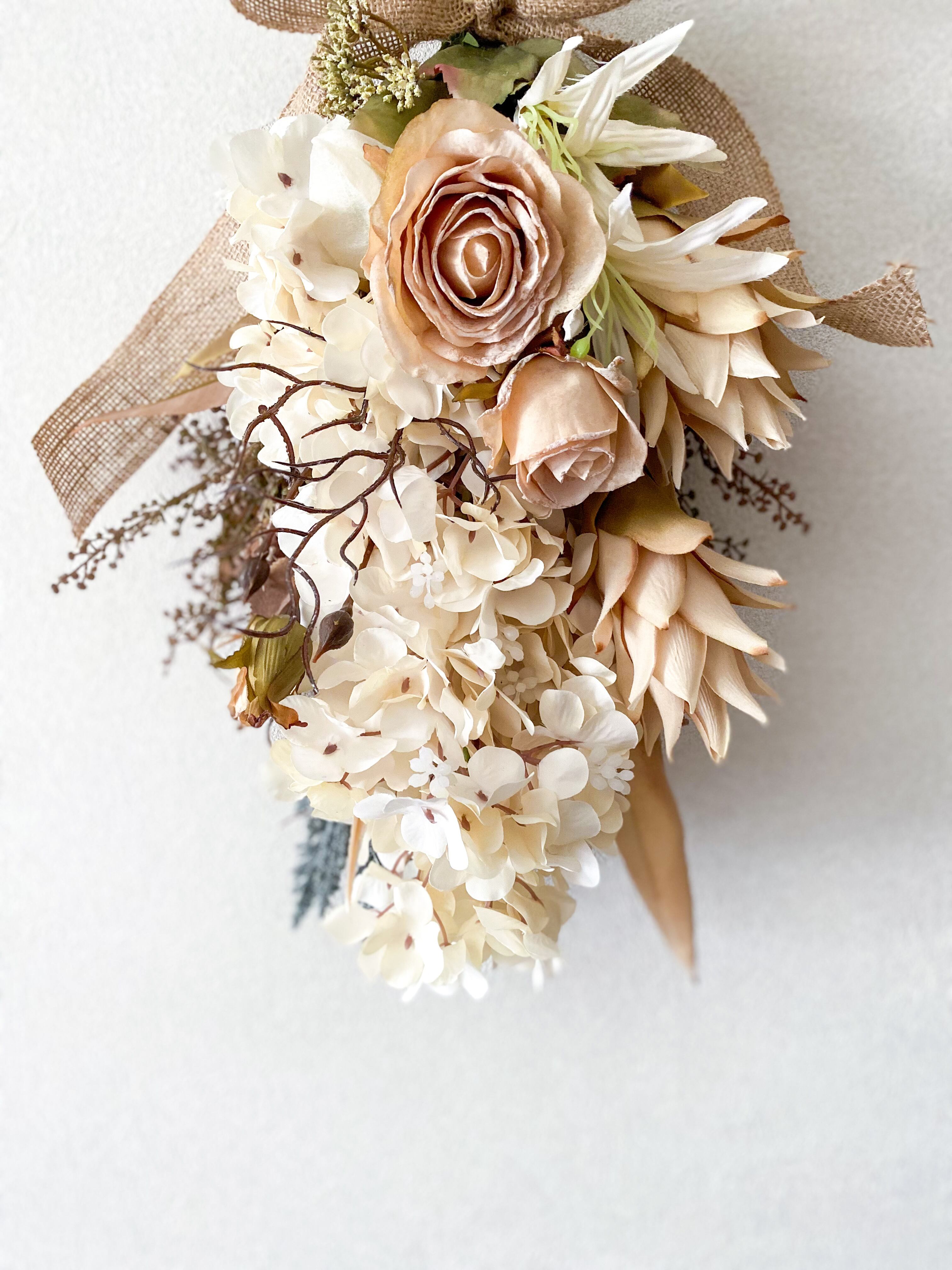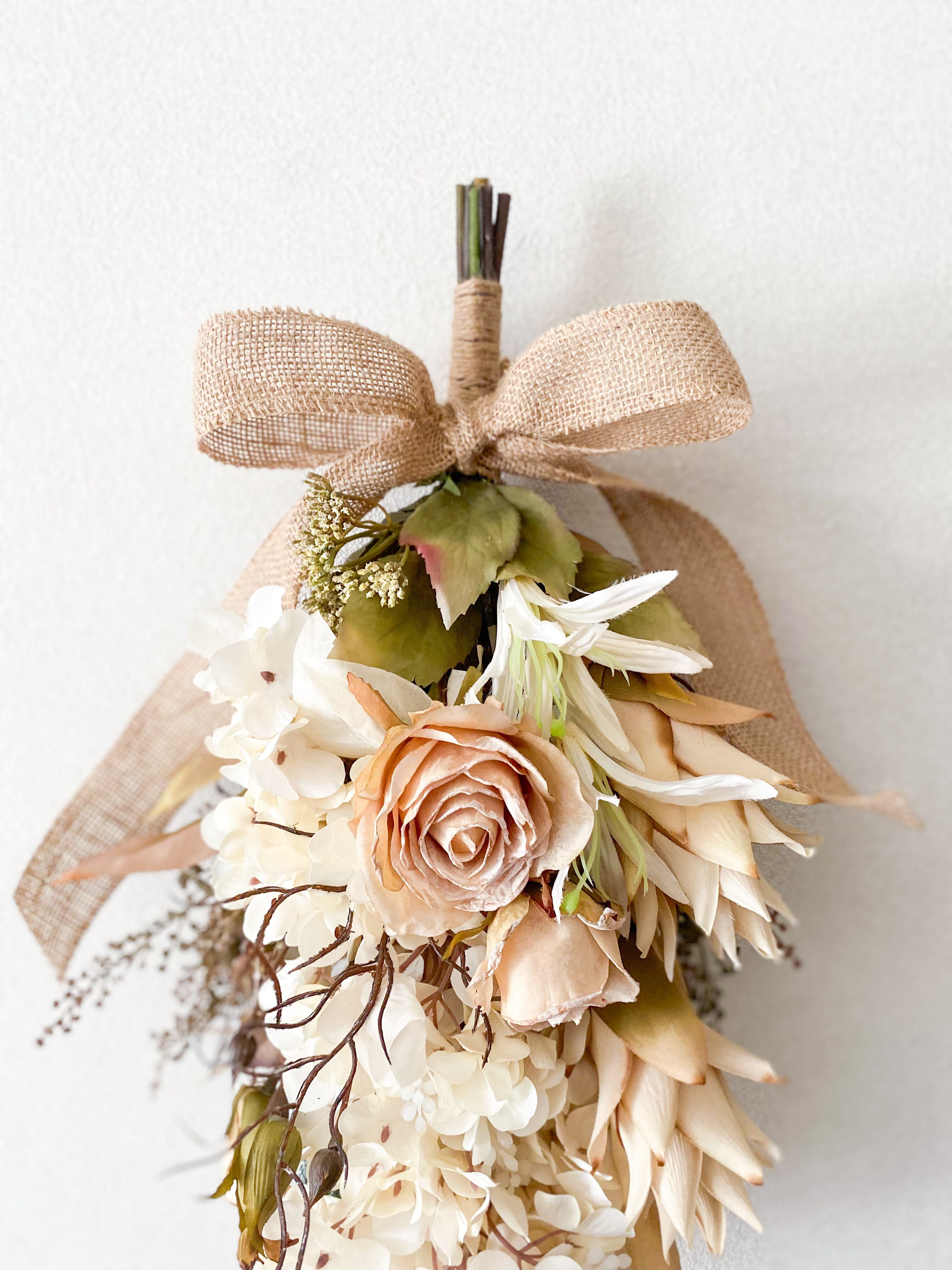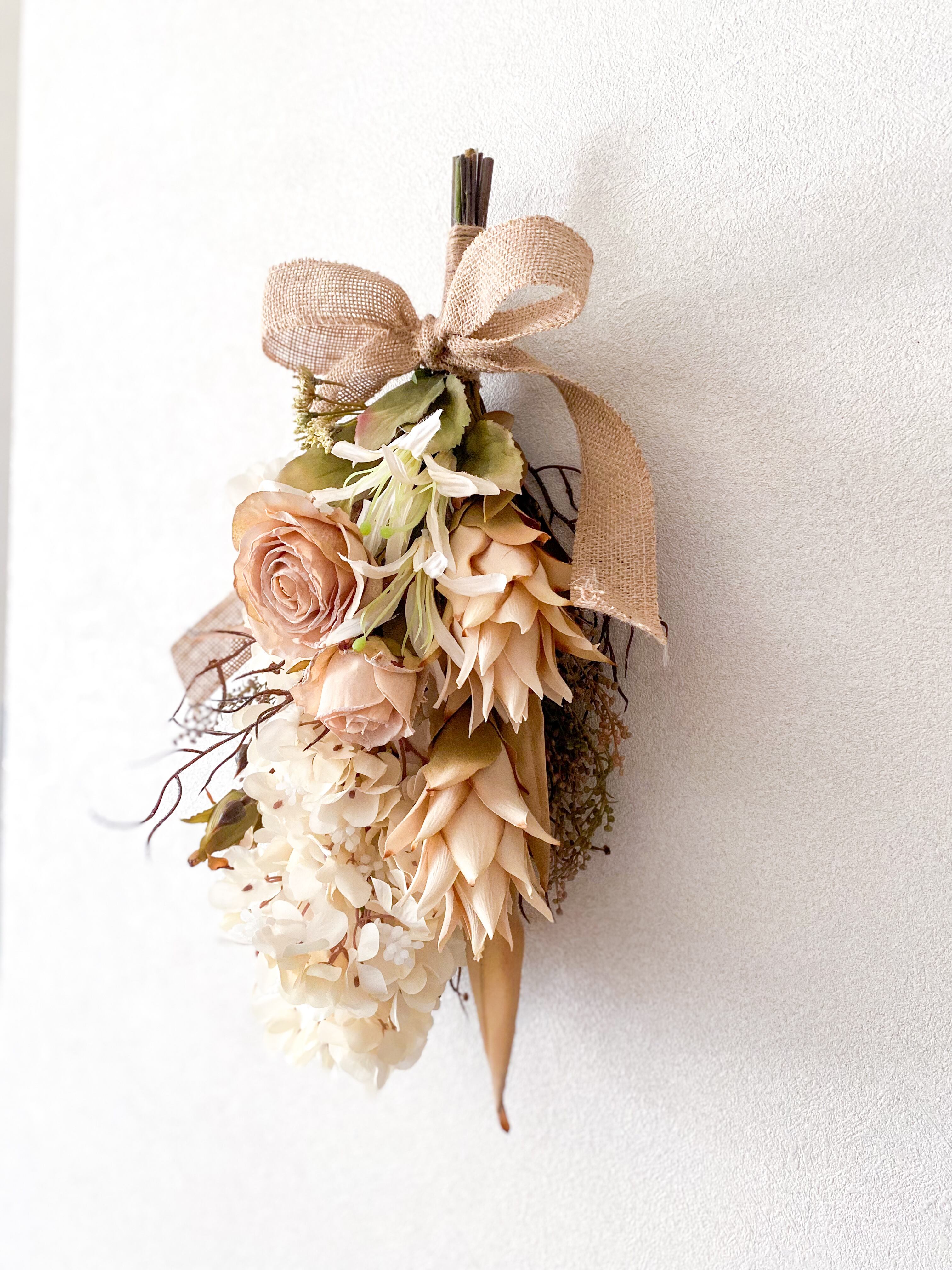ドライフラワー特有の「枯れ感」を見事に再現したクオリティの高いアーティフィシャルフラワーたちを組み合わせ、ナチュラル感たっぷりで気負わずに飾れるデザインに仕上げました