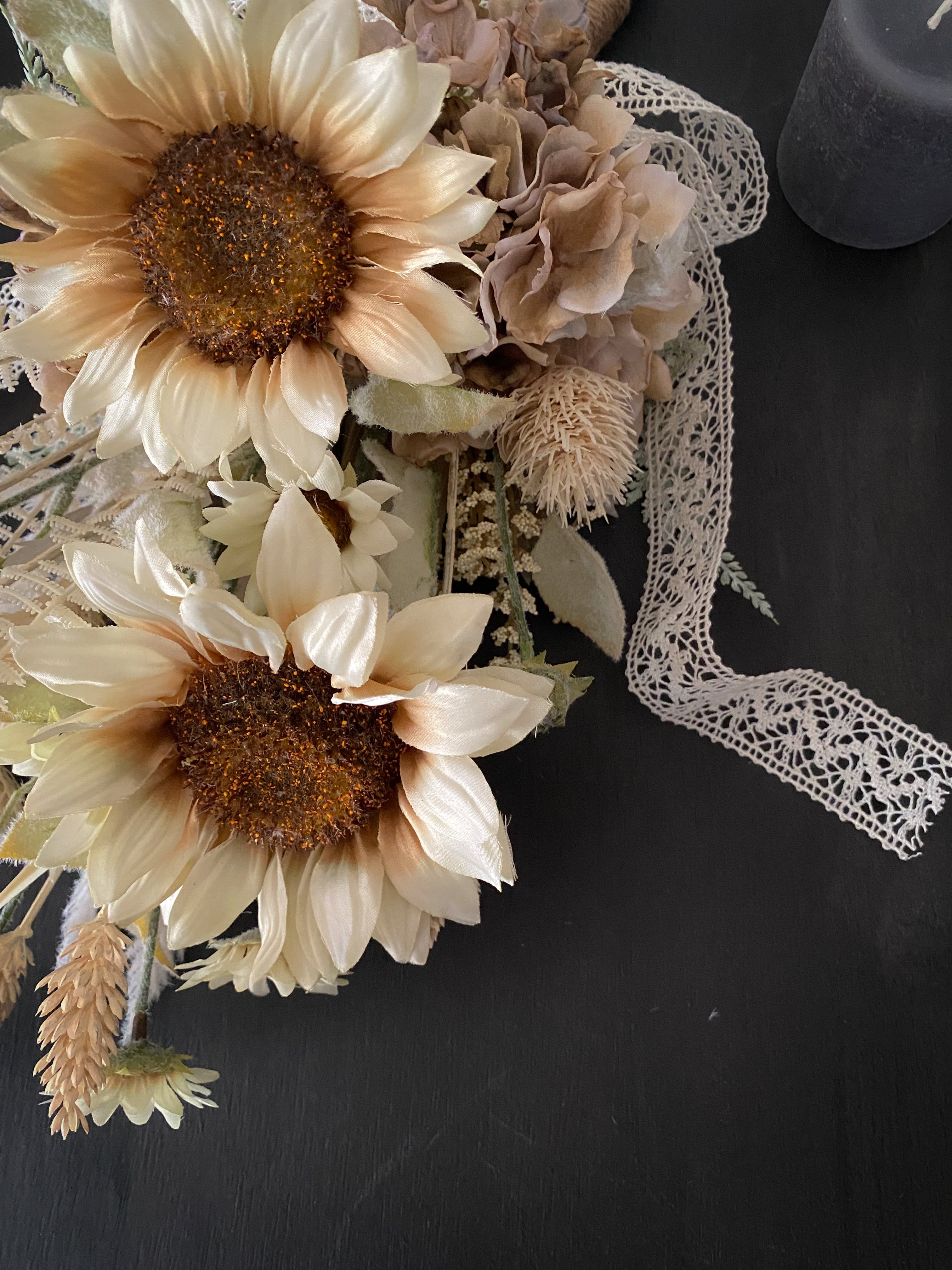 アーティフィシャルフラワー(クオリティの高い造花)のベージュカラーのひまわりを主役に、シックで涼やかなムードいっぱいのスワッグを作りました
