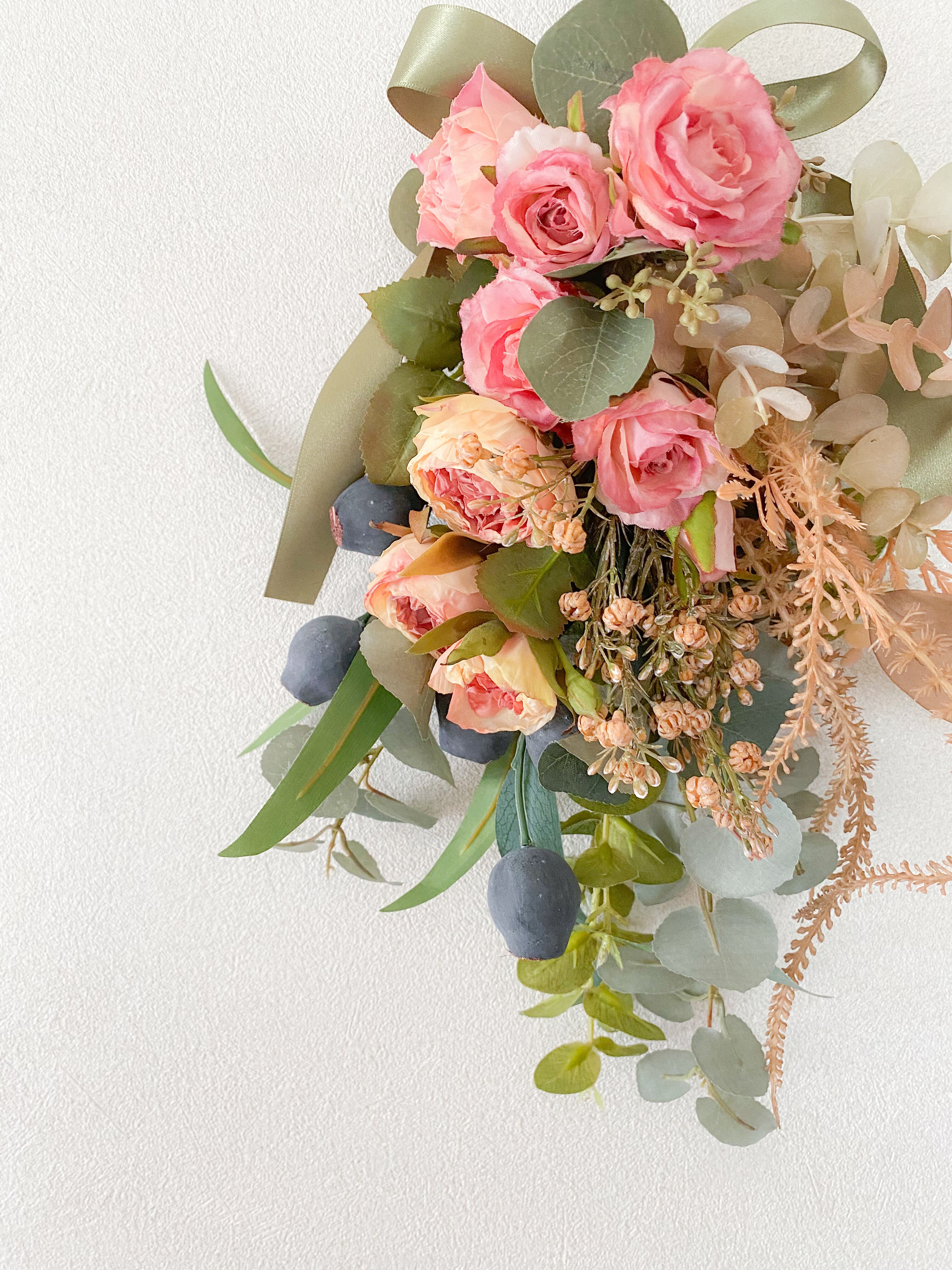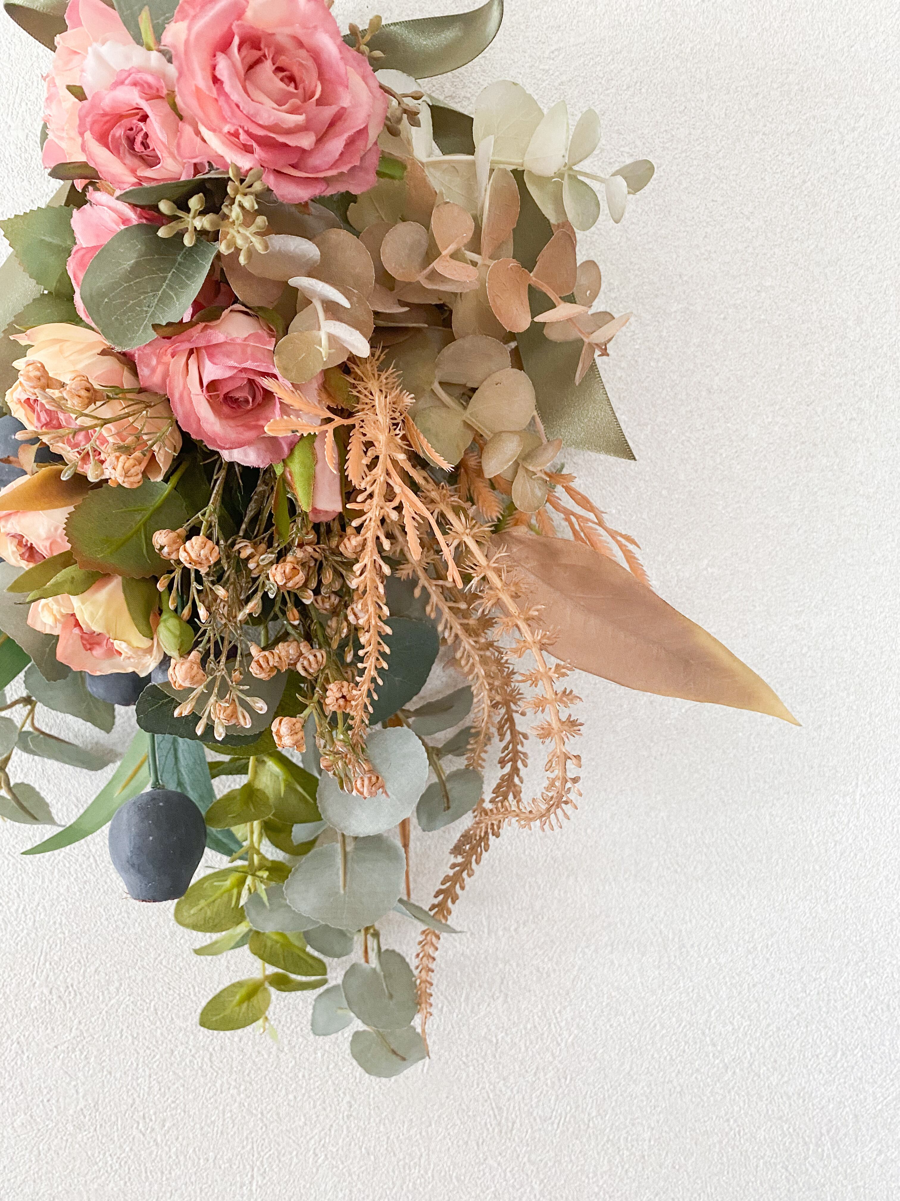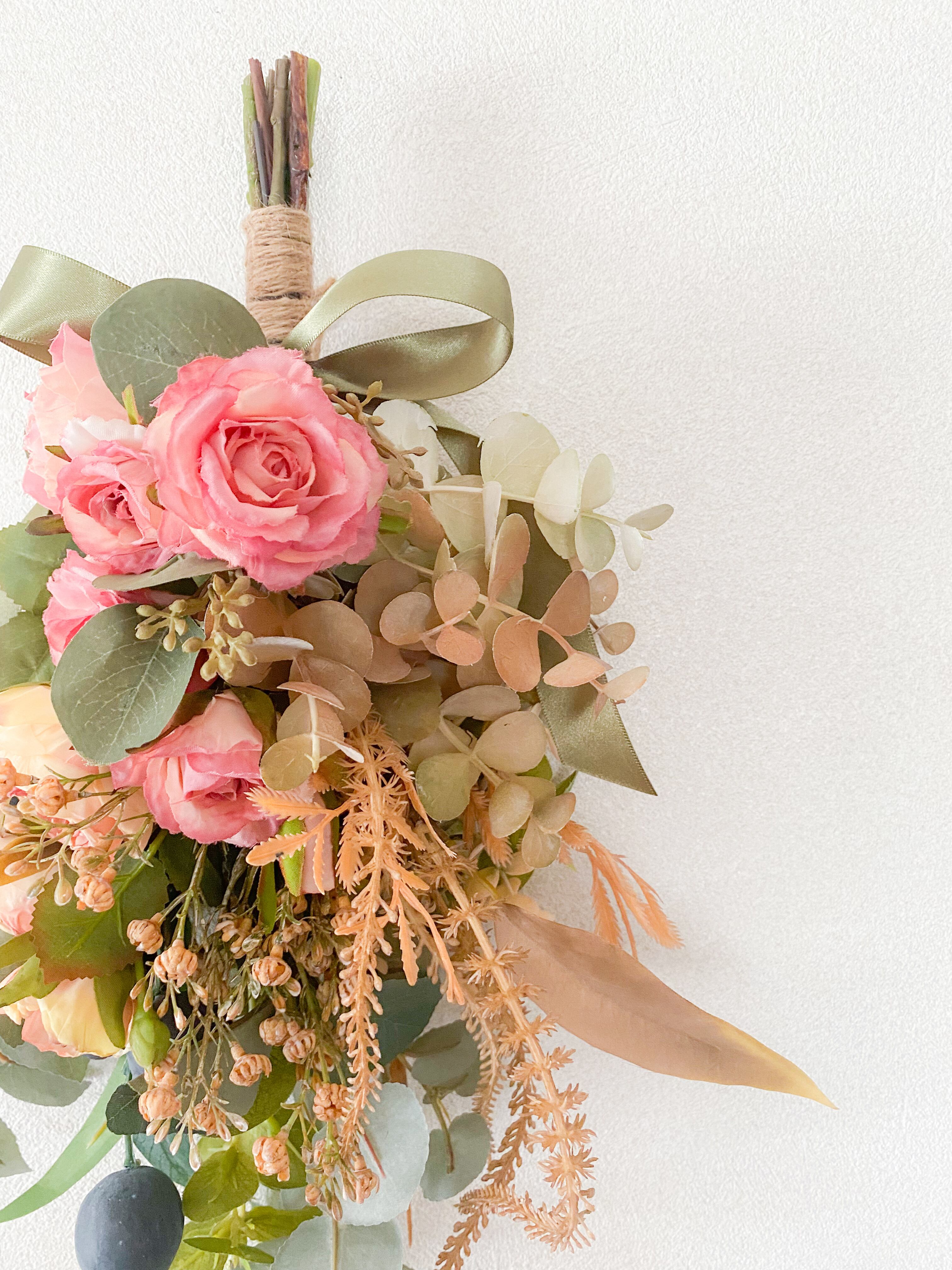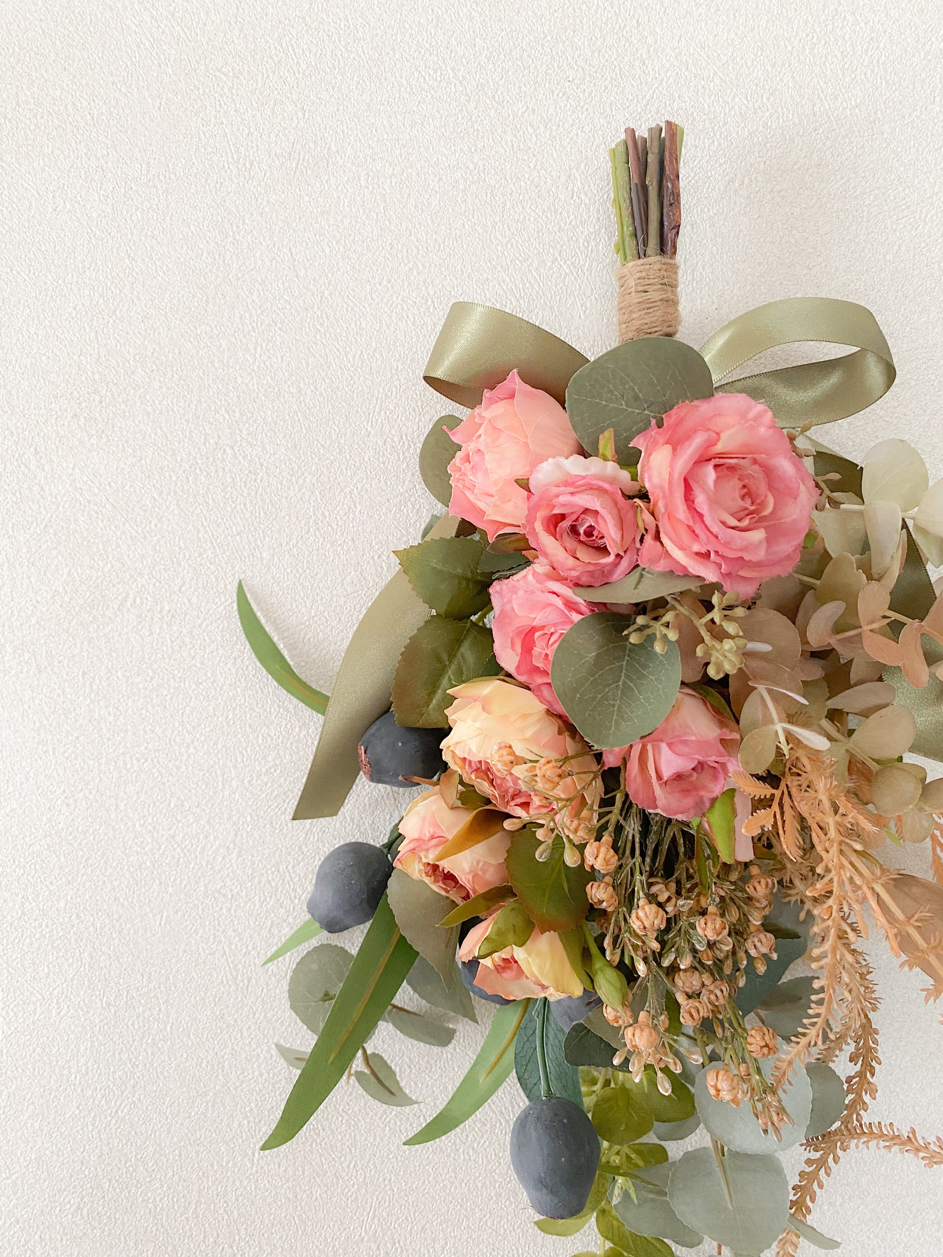 アーティフィシャルフラワー(クオリティの高い造花)のドライフラワー風の3種のバラたちを主役に、シックでボタニカルなムードいっぱいのスワッグを作りました