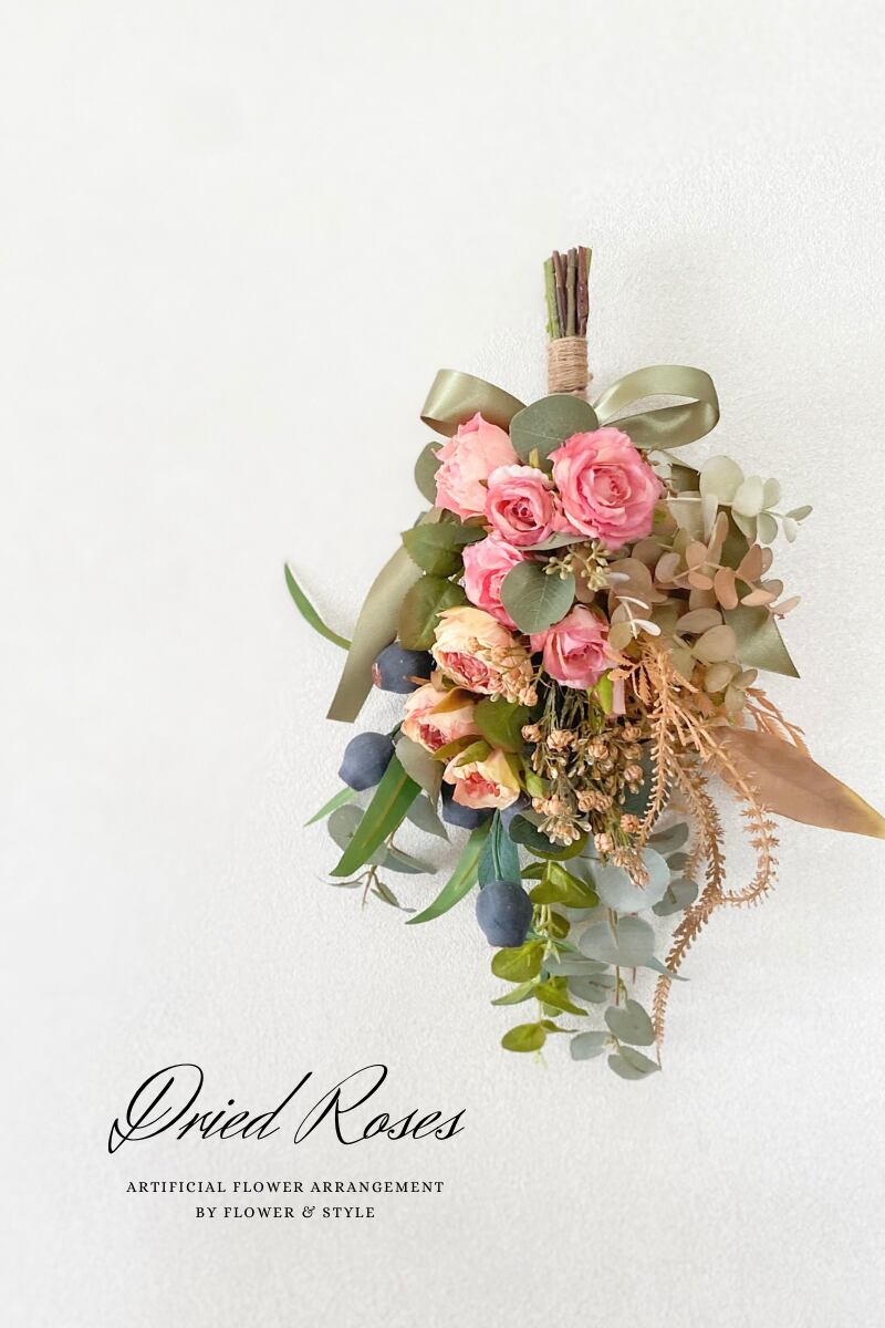 ドライフラワー特有の「枯れ感」やシックな色合いを見事に再現したクオリティの高いアーティフィシャルフラワーたちを組み合わせ、ナチュラル感たっぷりで気負わずに飾れるデザインに仕上げました