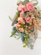 【使用花材】バラ3種、ユーカリ4種、ジブソ ほか