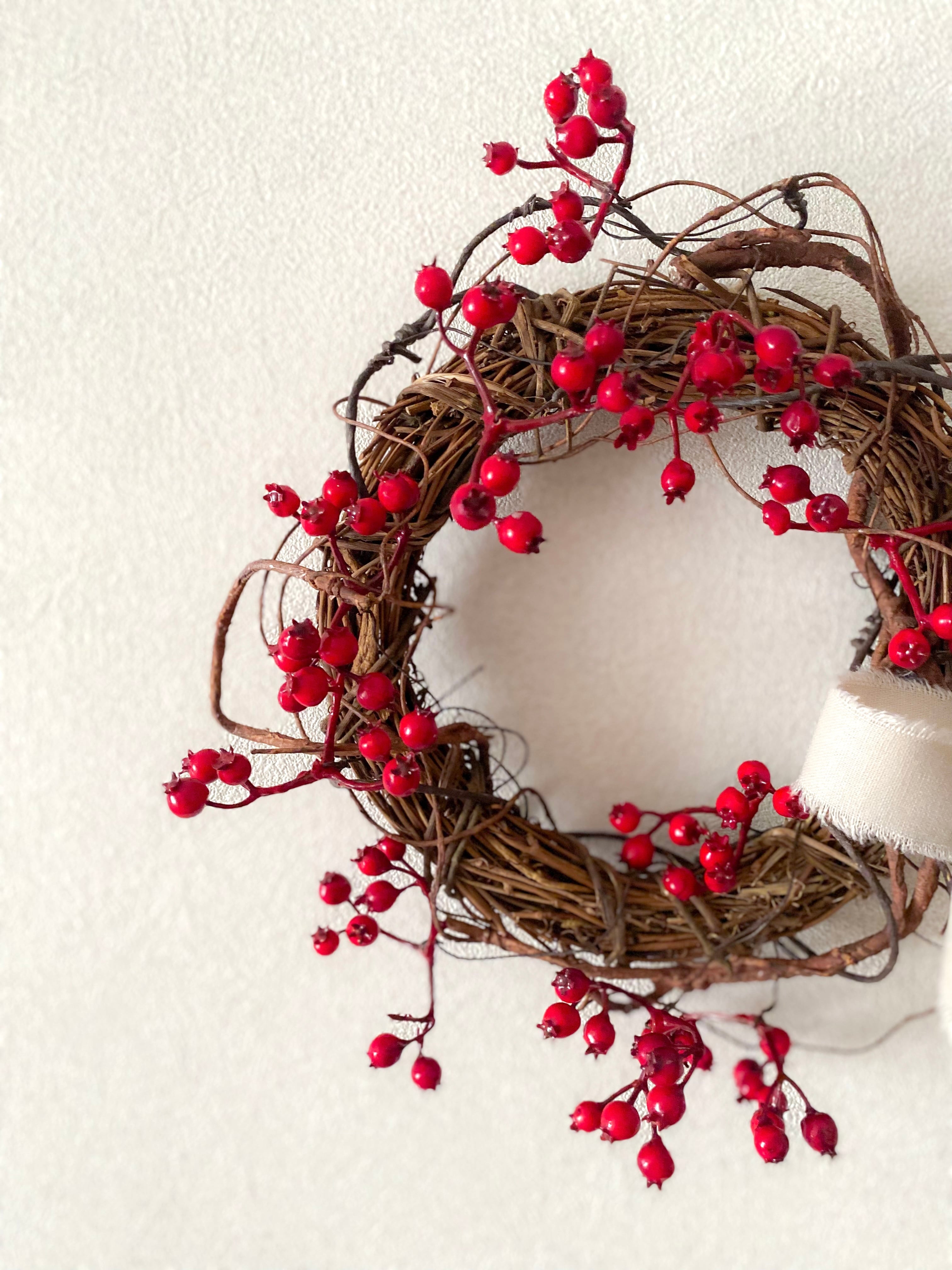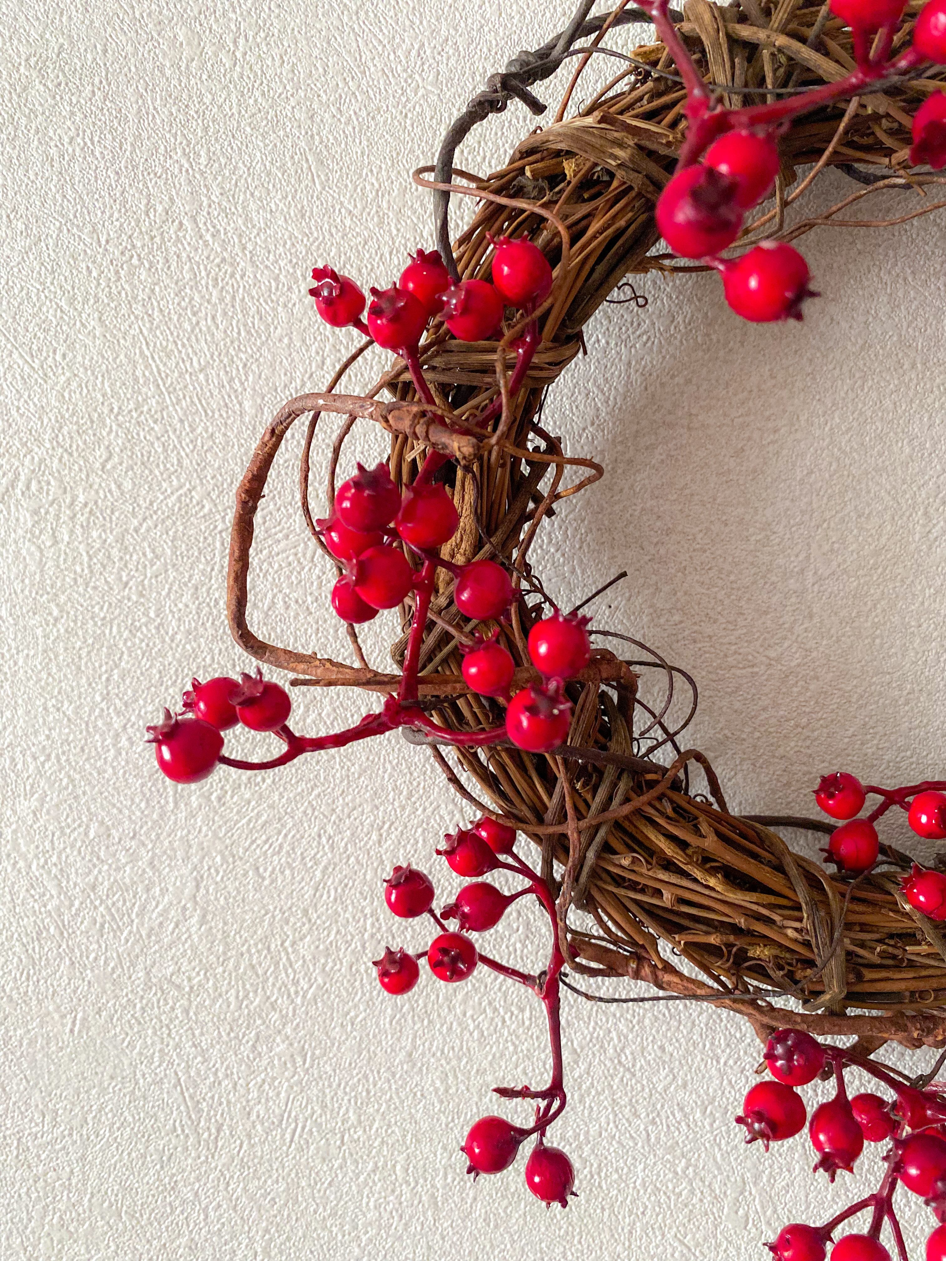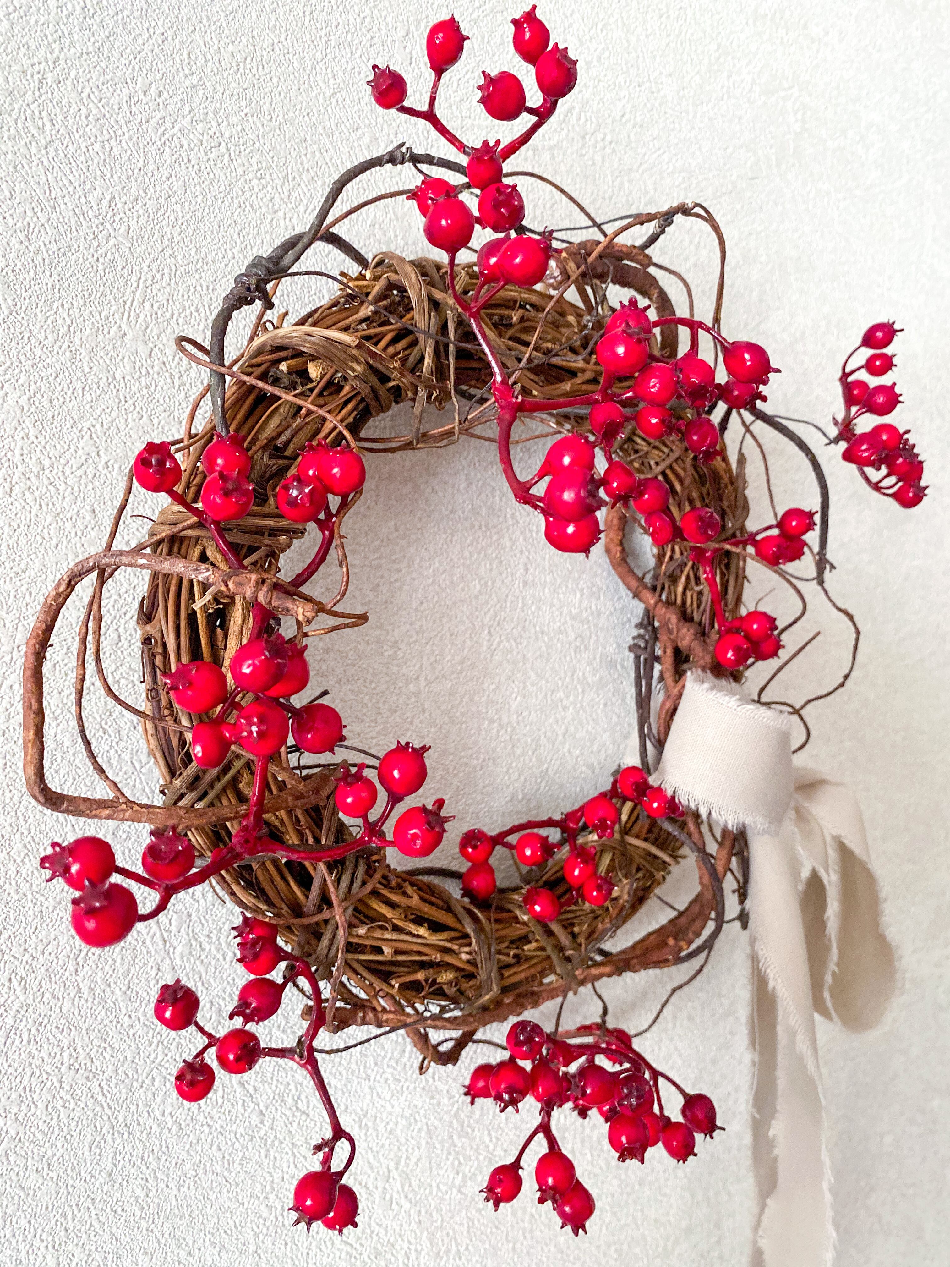 ダークブラウンの枝の絡まりや曲線と赤いサンキライの実の組み合わせは、