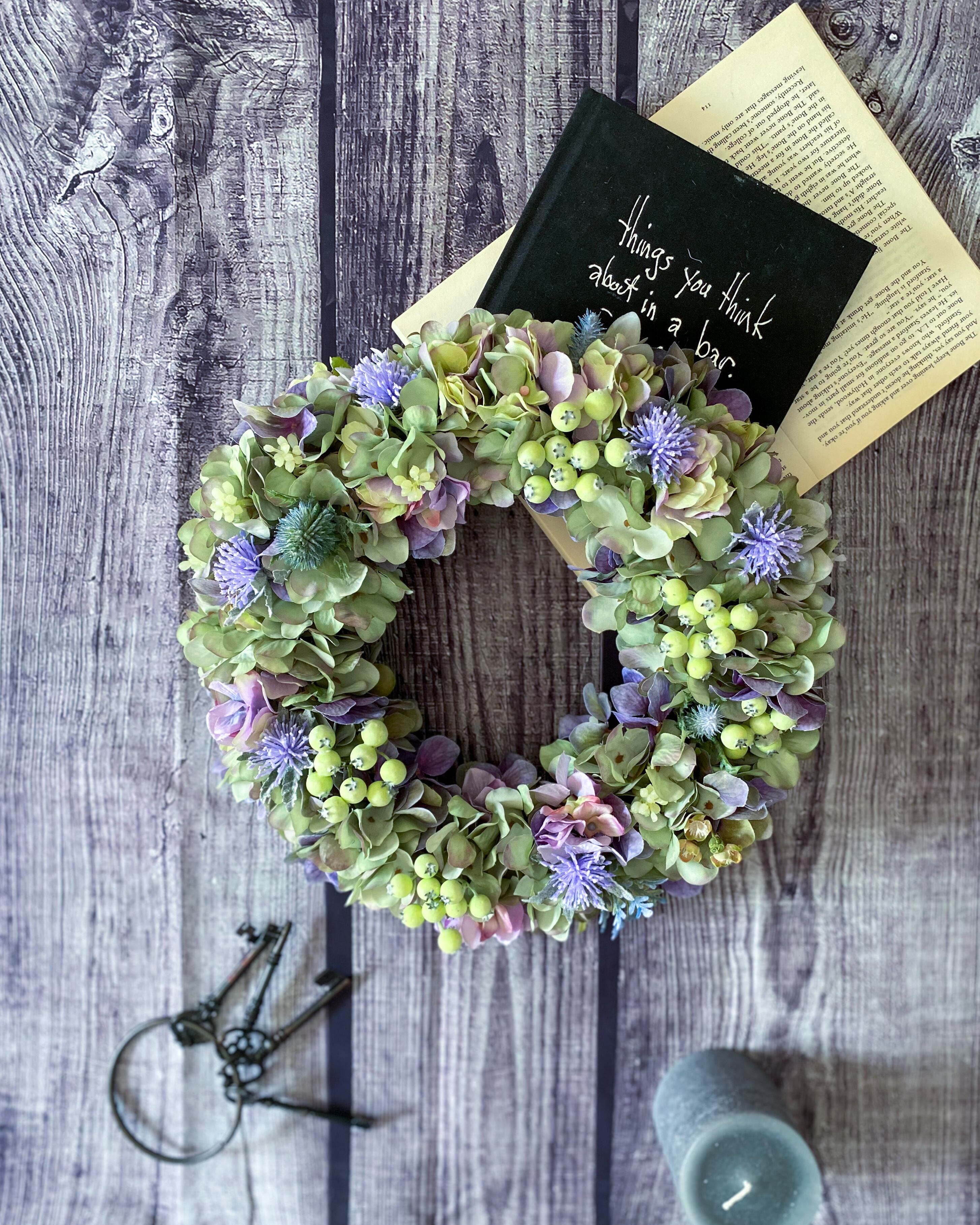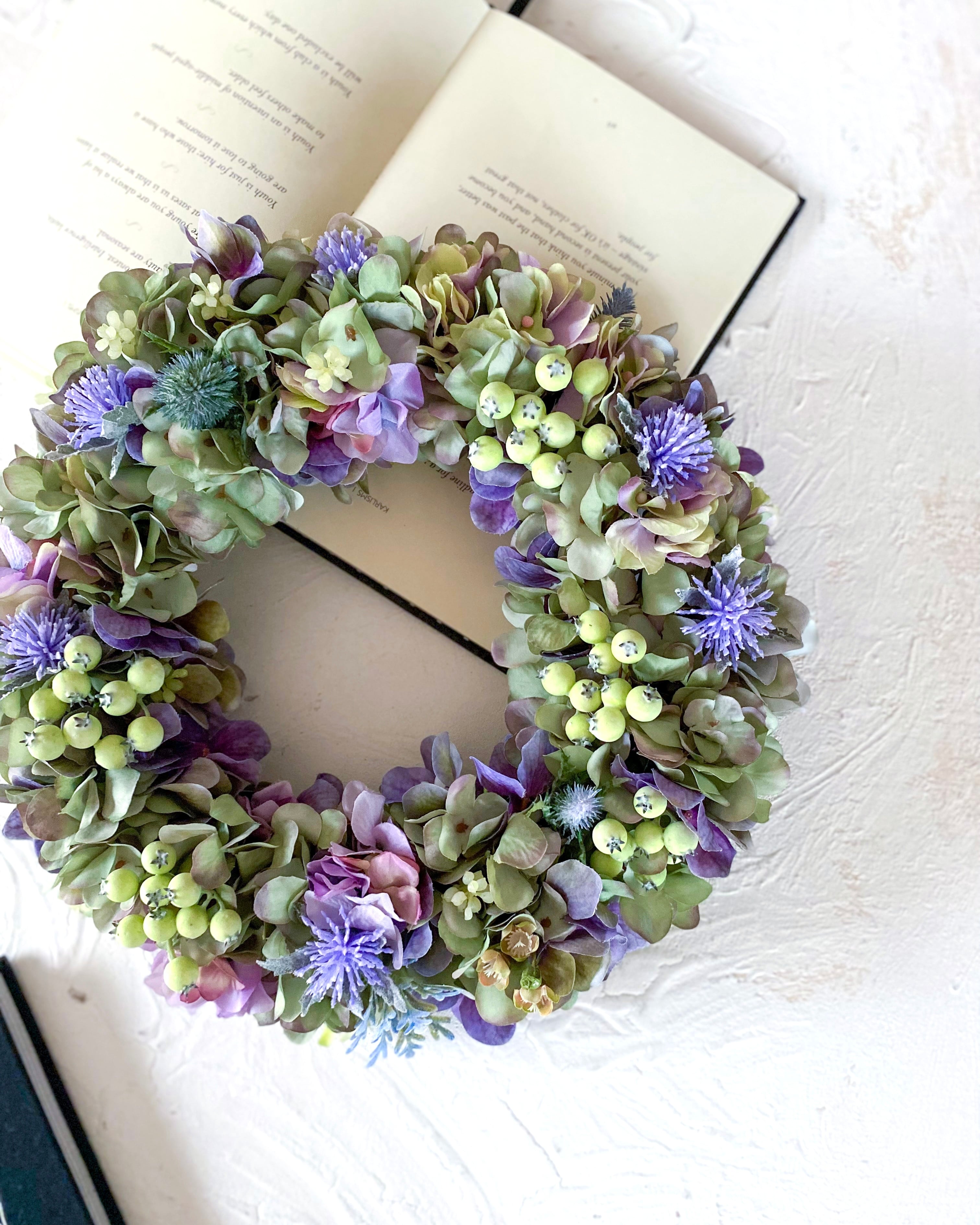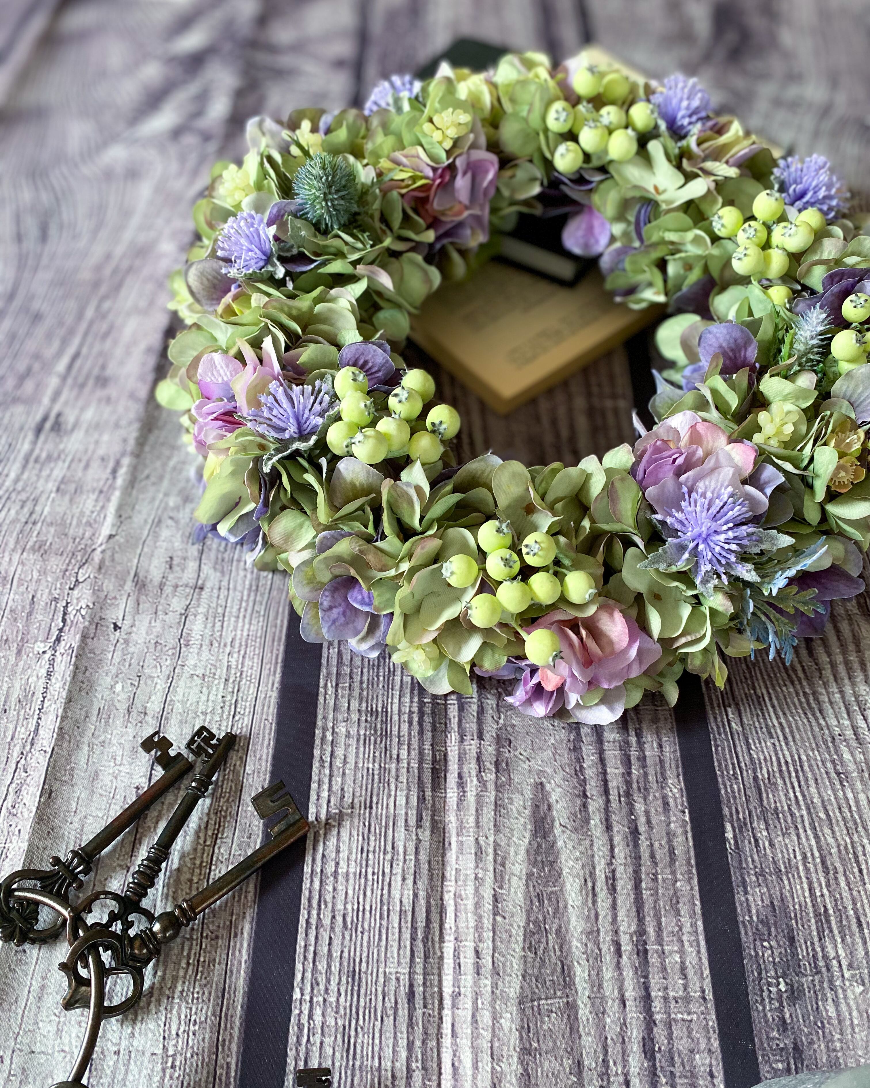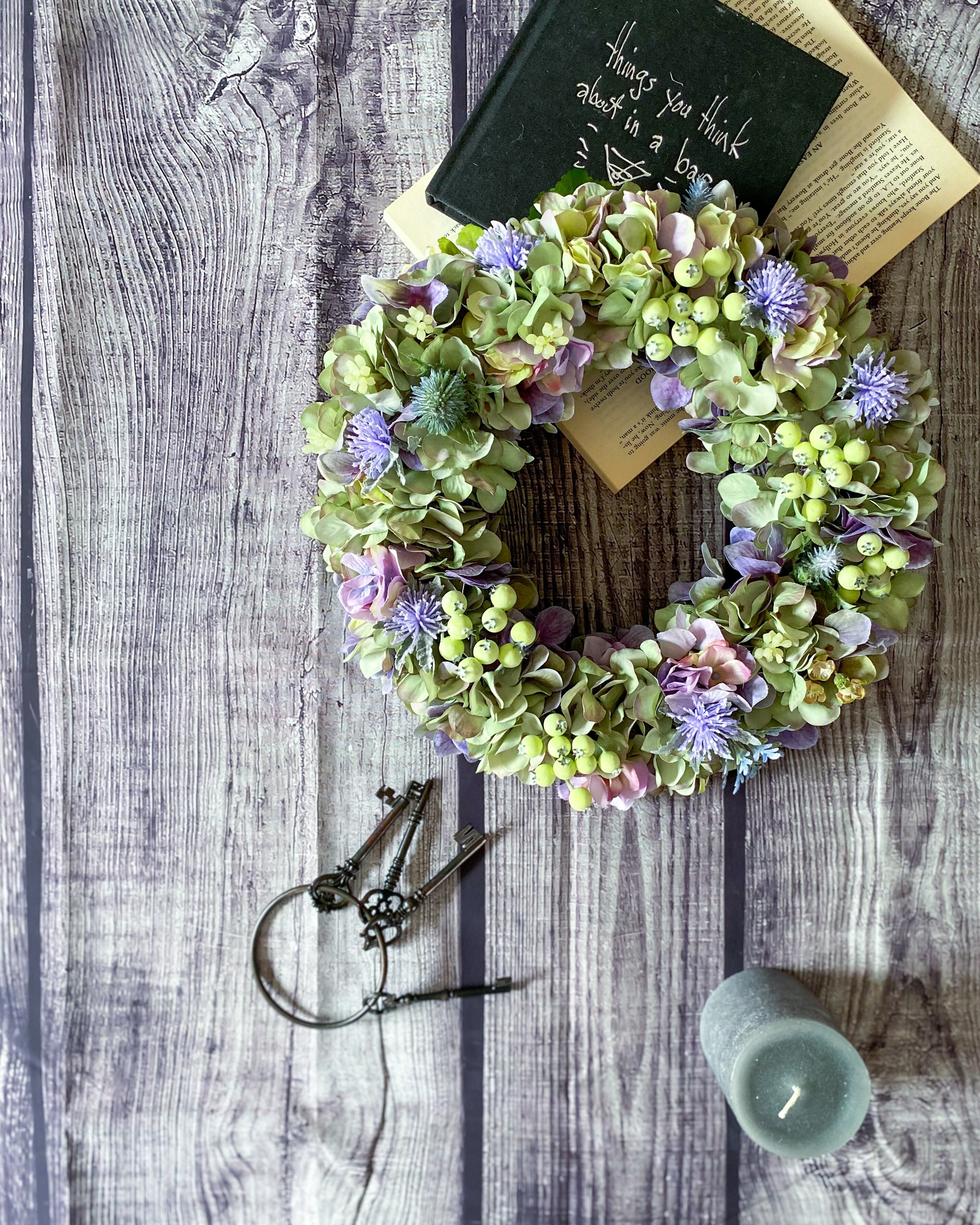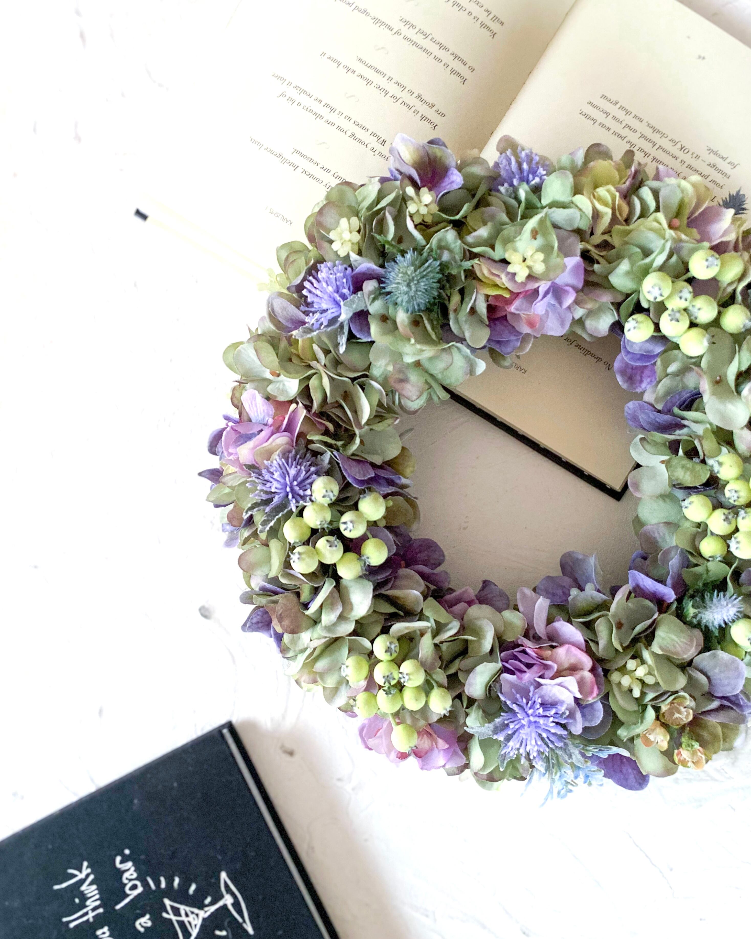 アーティフィシャルフラワー(クオリティの高い造花)のアジサイをたっぷりと使って、シックでやわらかな雰囲気のリースを作りました