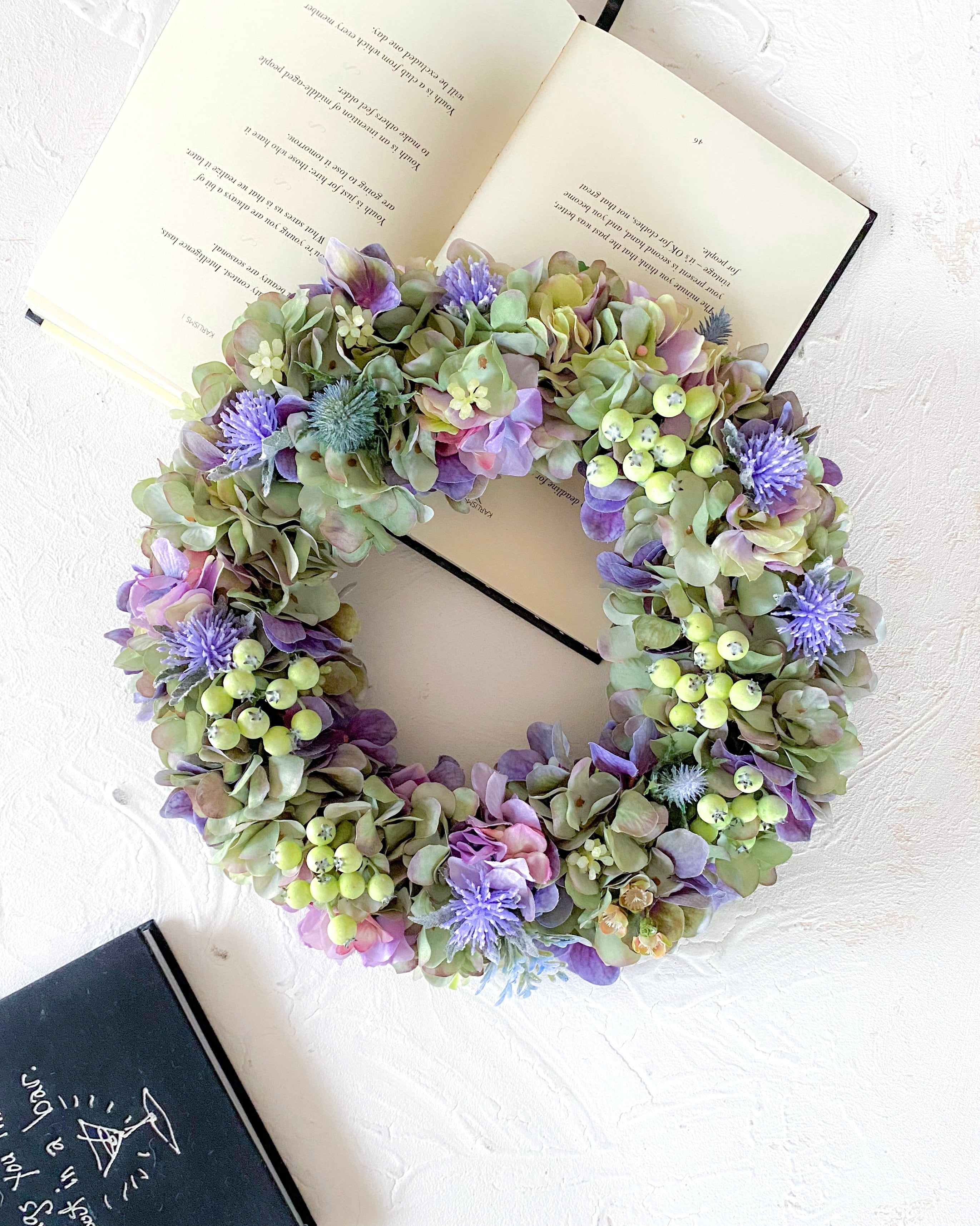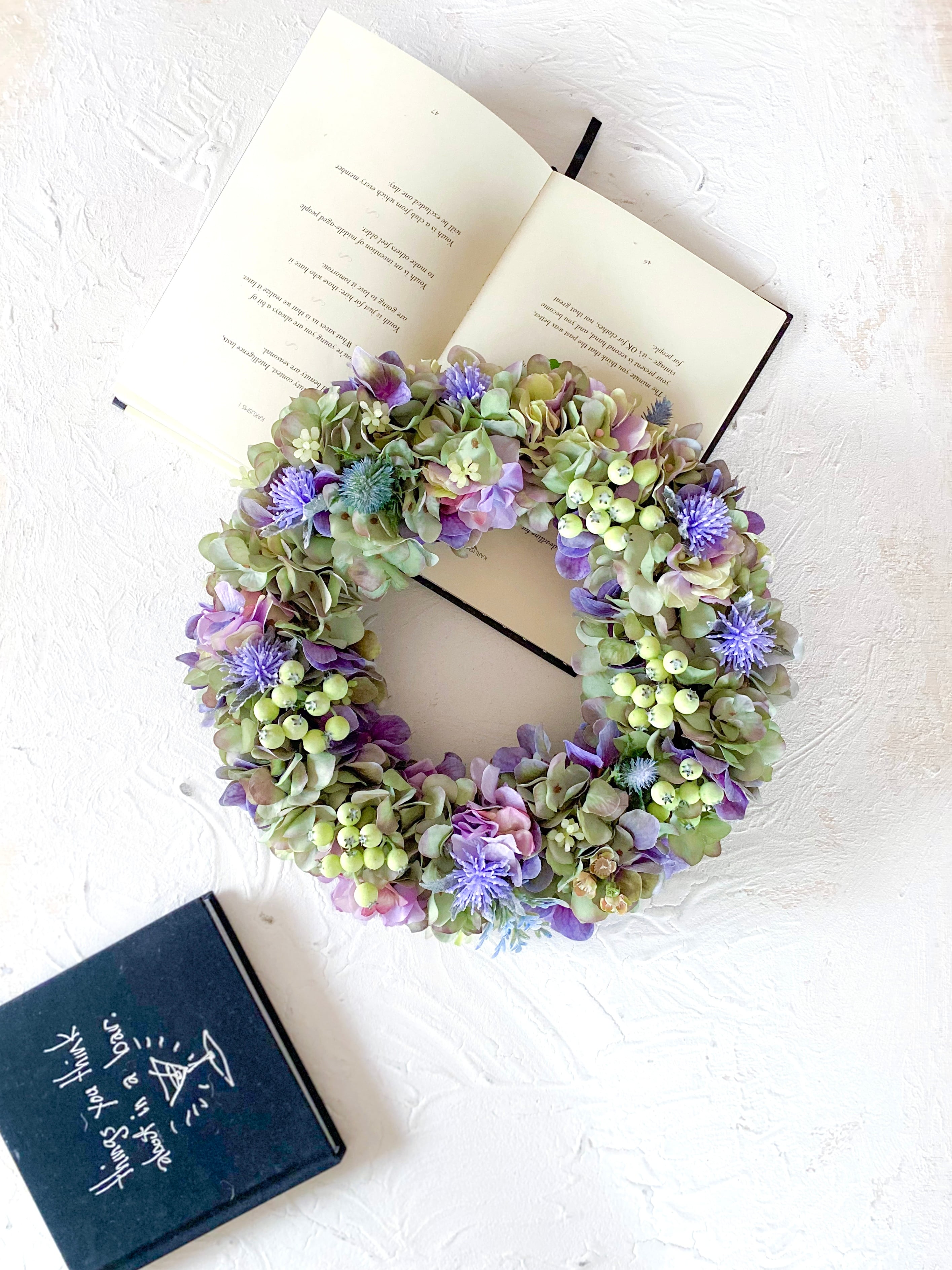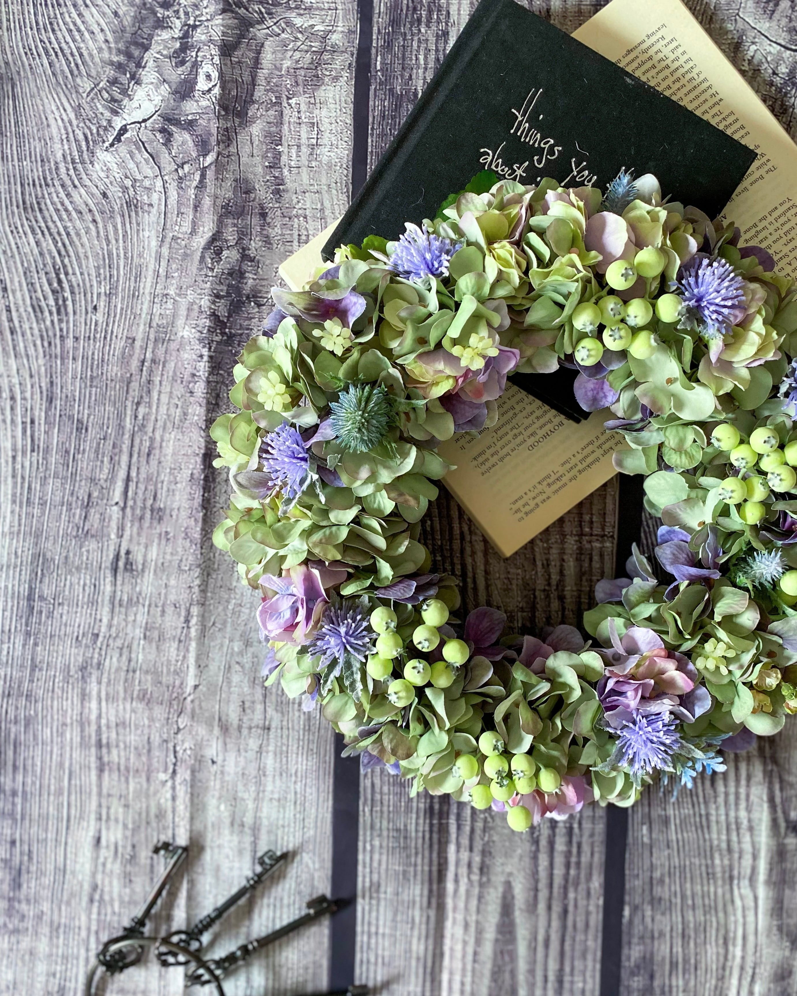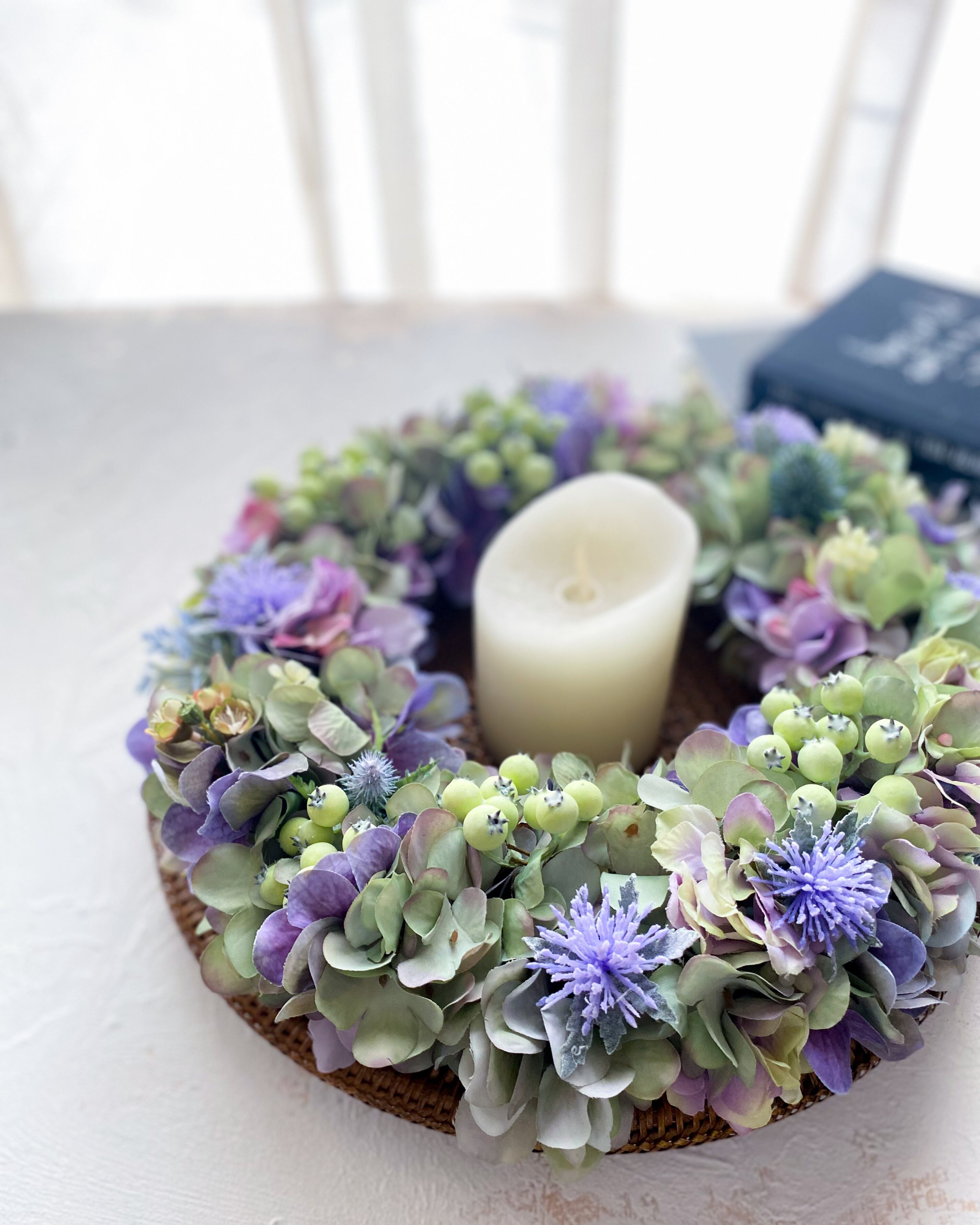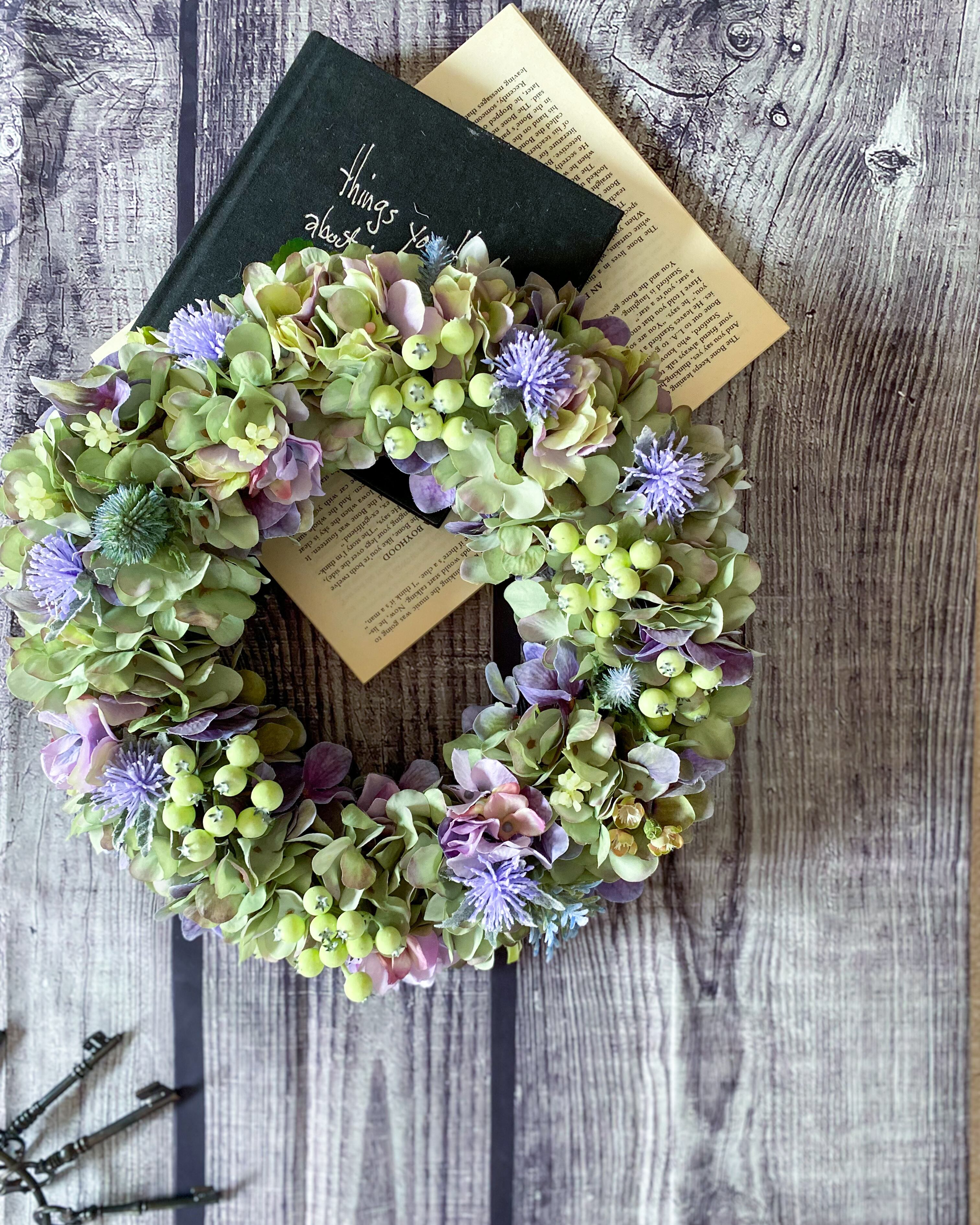 アーティフィシャルフラワー(クオリティの高い造花)のアジサイをたっぷりと使って、シックでやわらかな雰囲気のリースを作りました