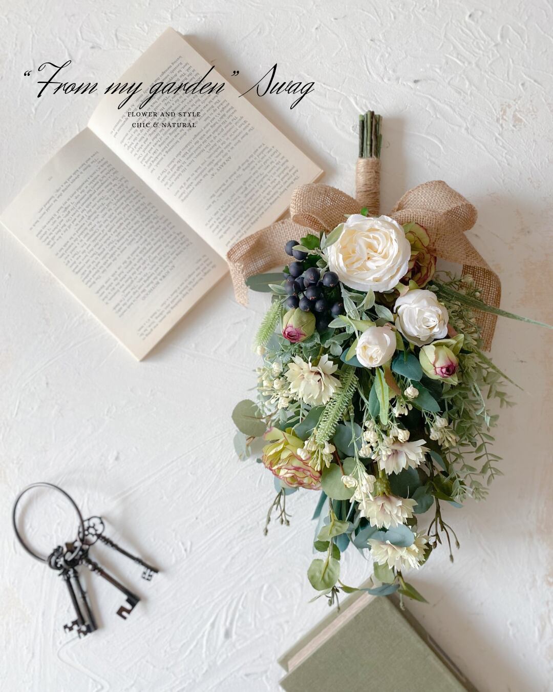 ナチュラル感溢れるアーティフィシャルフラワー(クオリティの高い造花)を使って、シックでボタニカルなムードいっぱいのスワッグを作りました