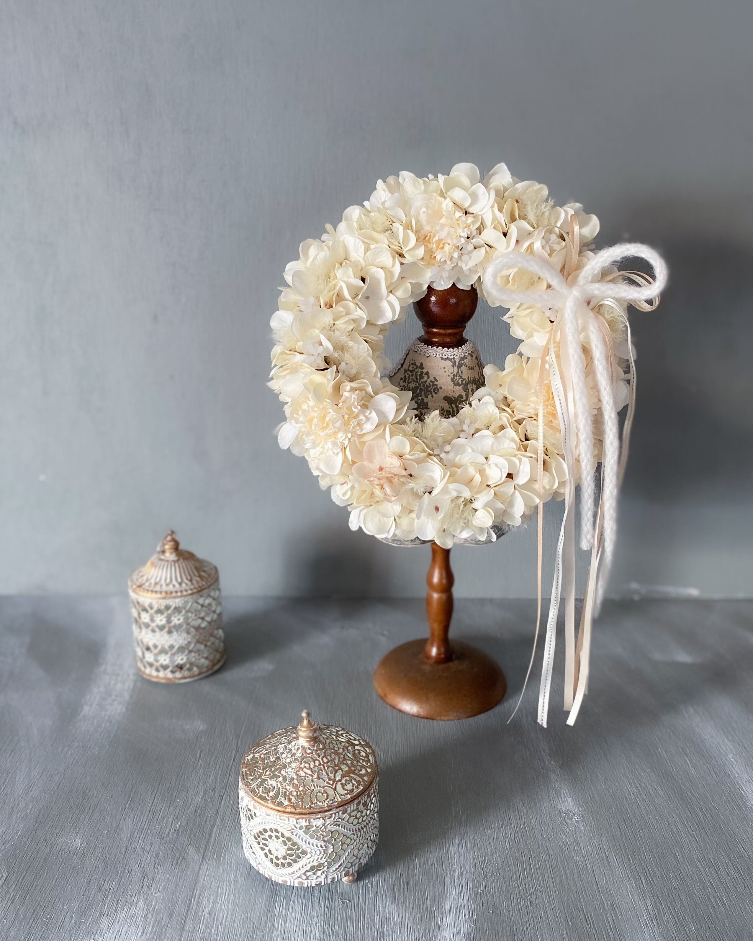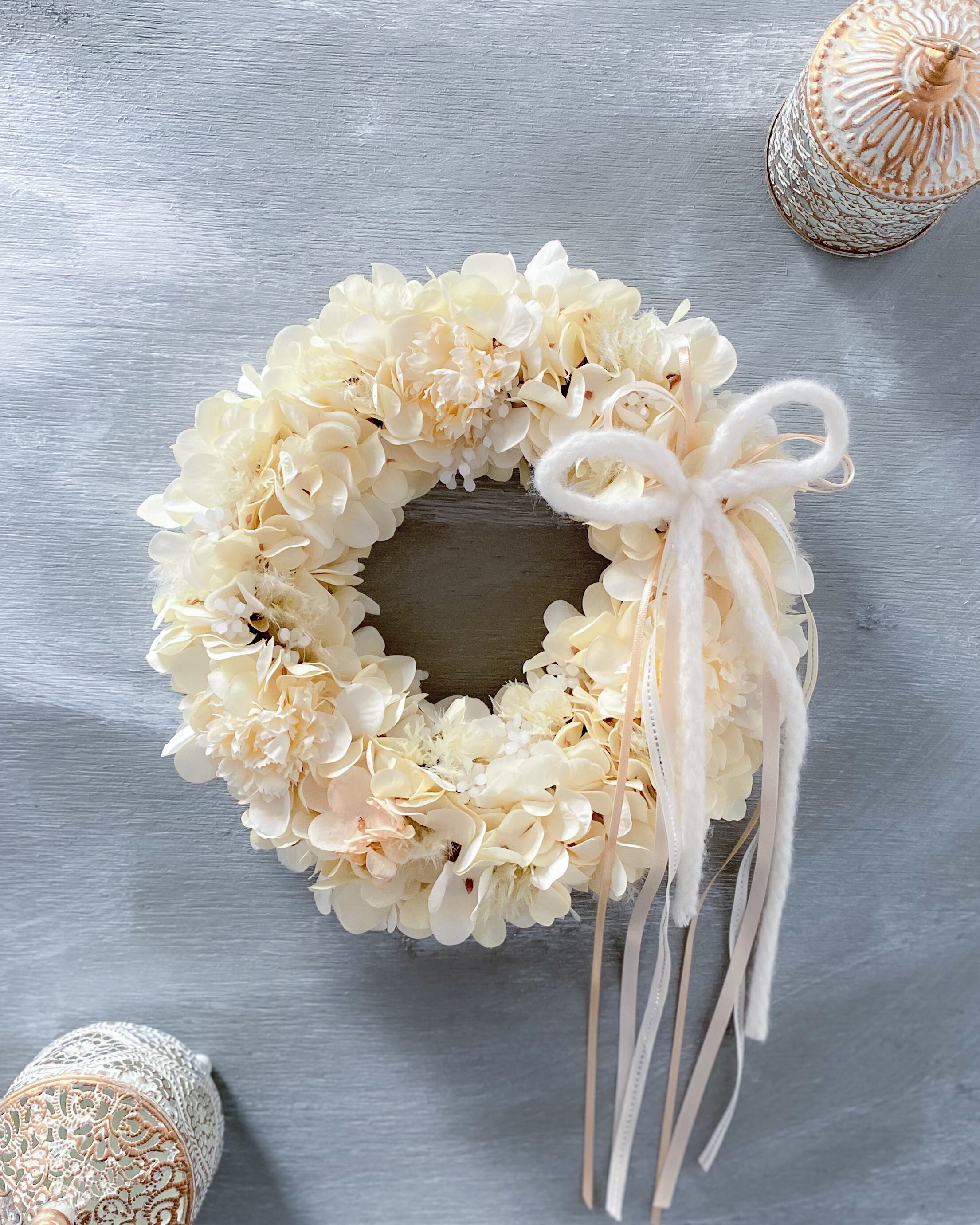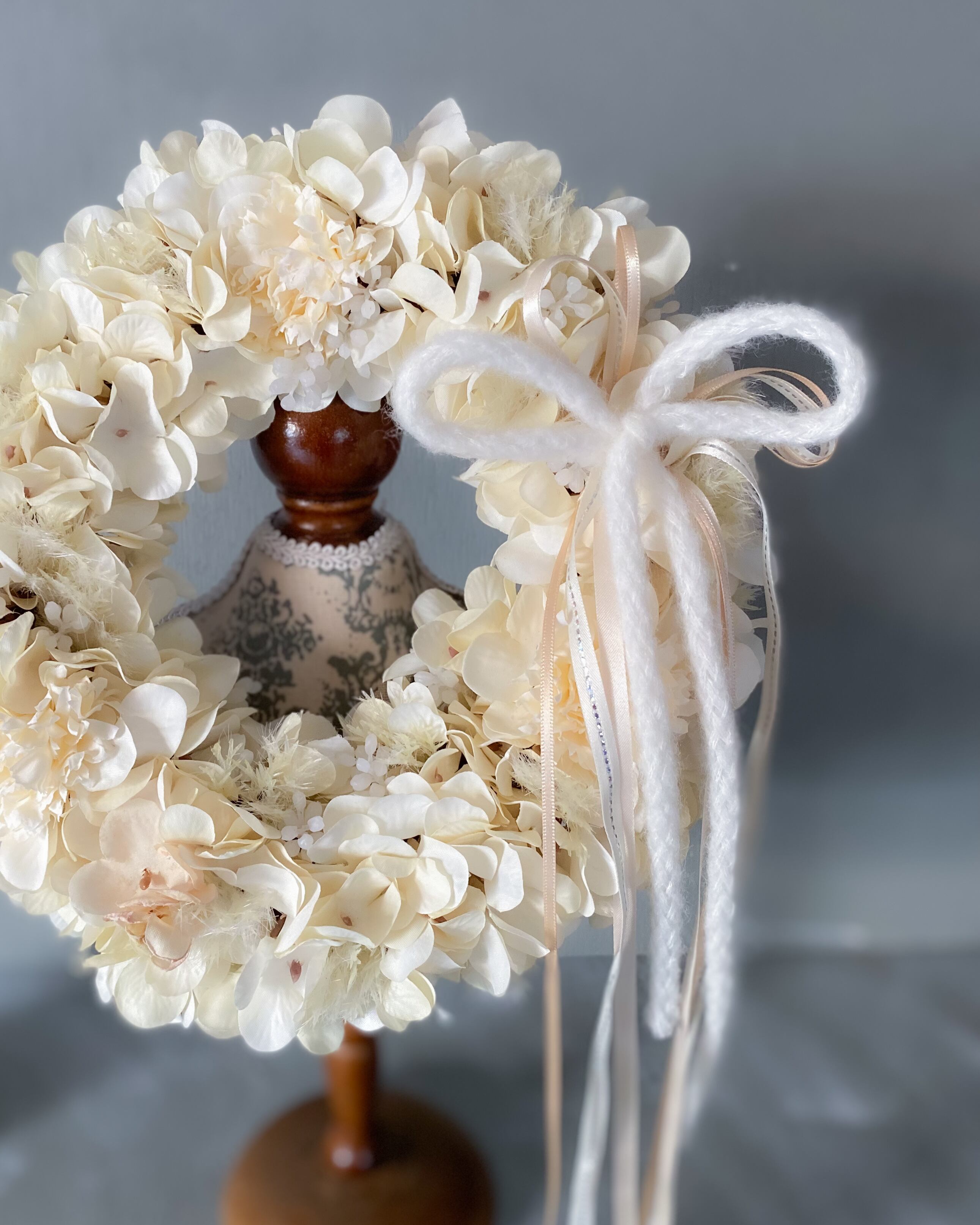 ふんわりと優しいアイボリーカラーのアジサイを、丸くてふんわりとしたリースにデザインしました
