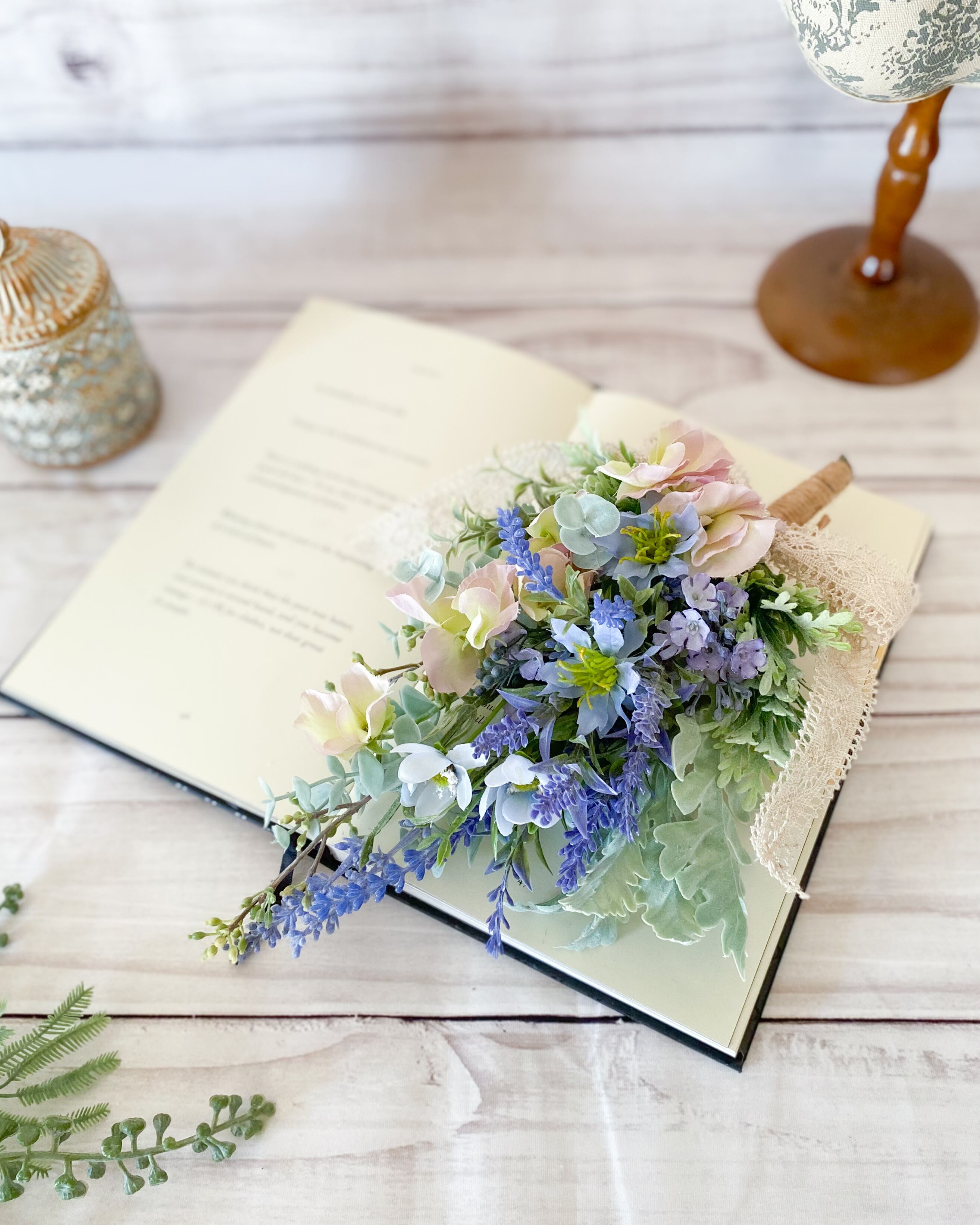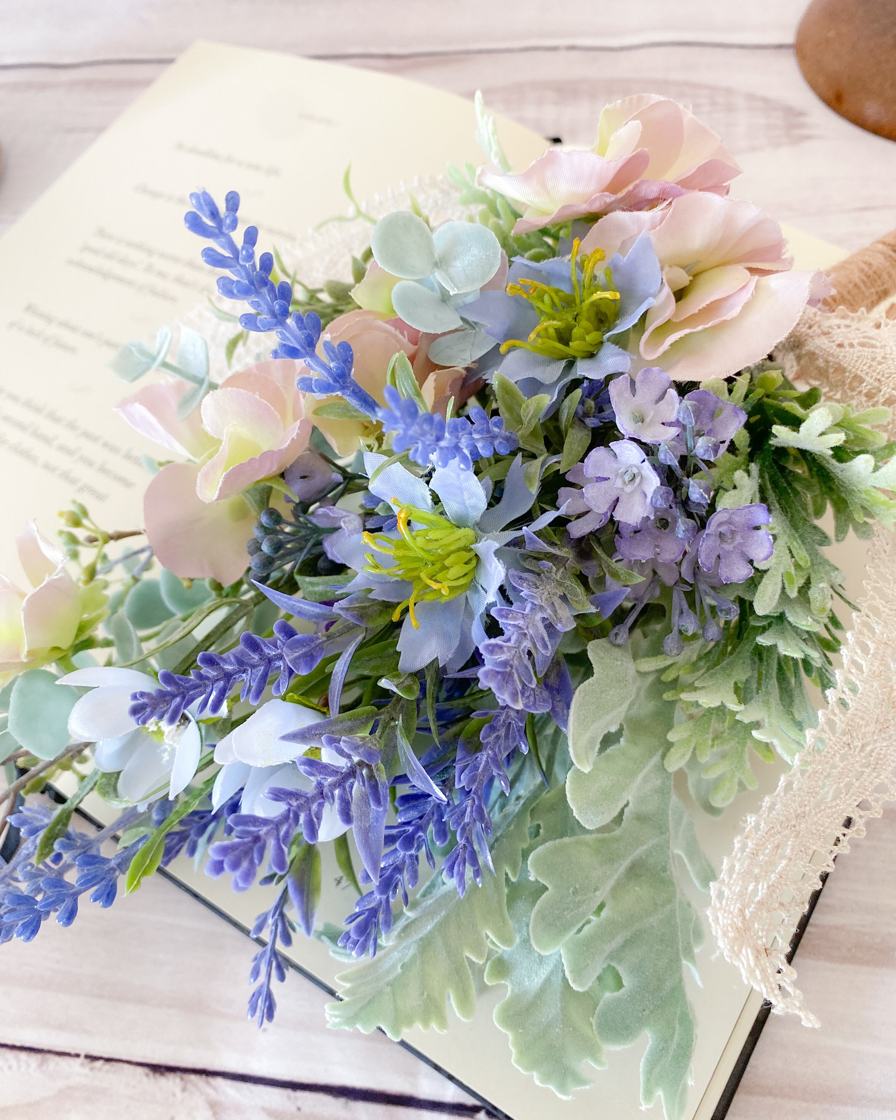 【使用花材】スイートピー、ラベンダー、ニゲラ、ミスミソウ、ユーカリなど