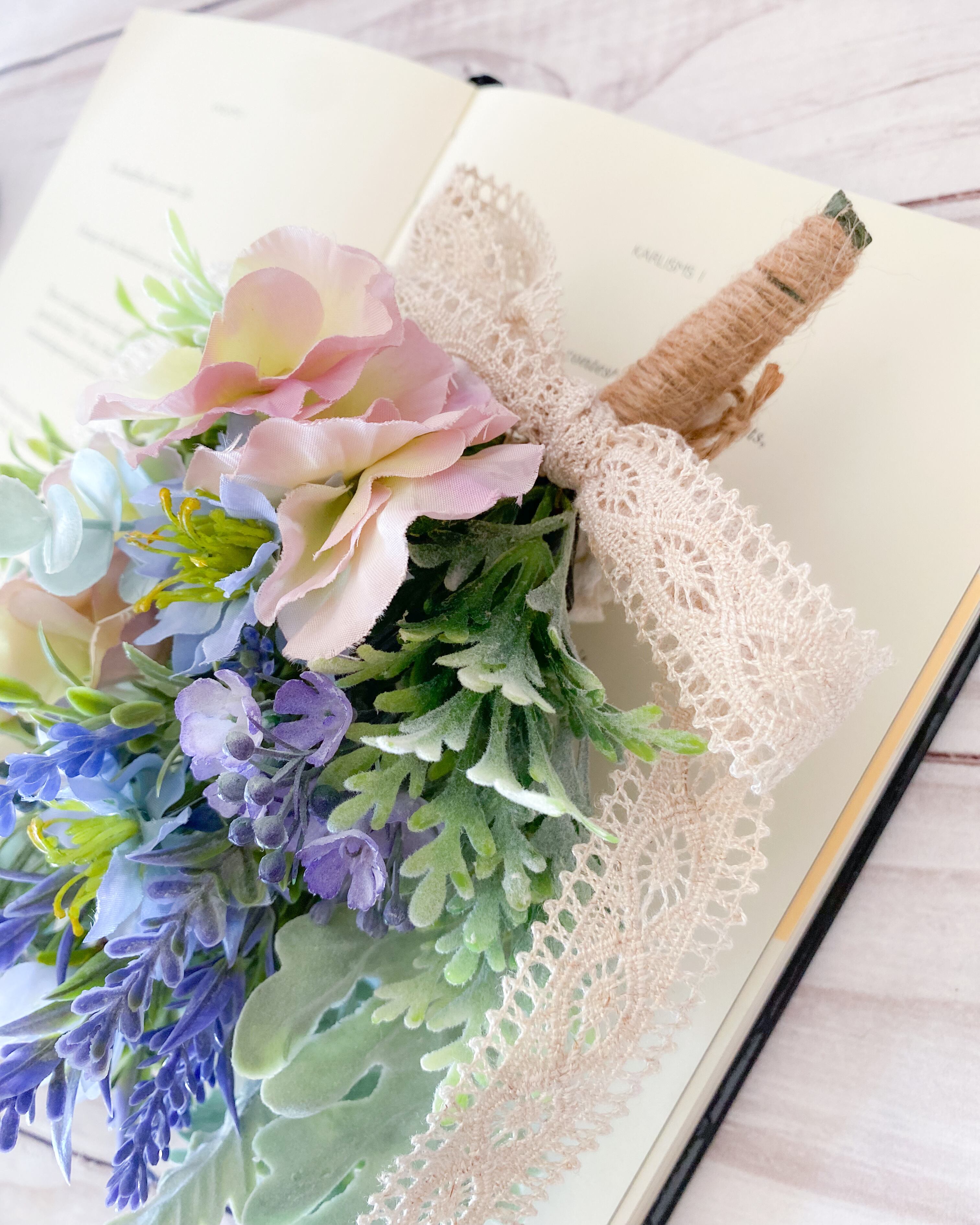 アイボリーのレースのリボンを選び、春の軽やかさをプラスしました。